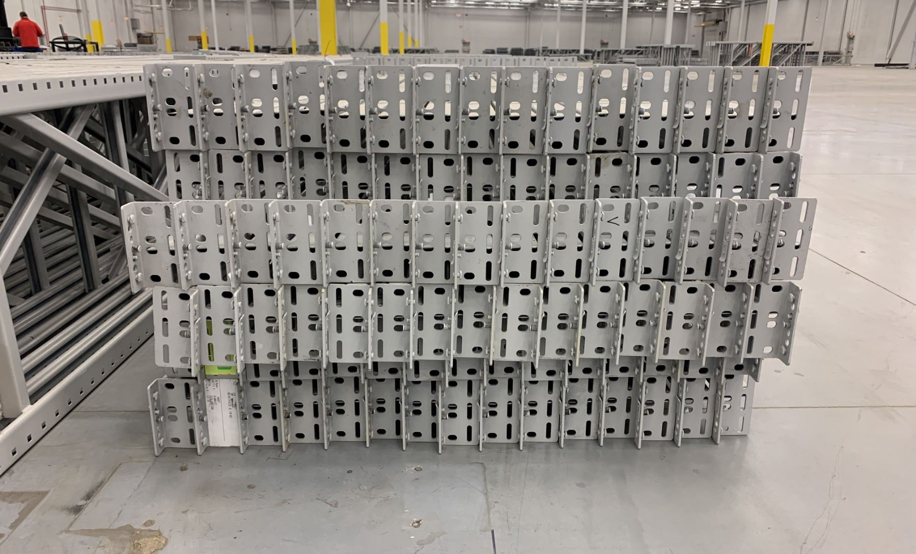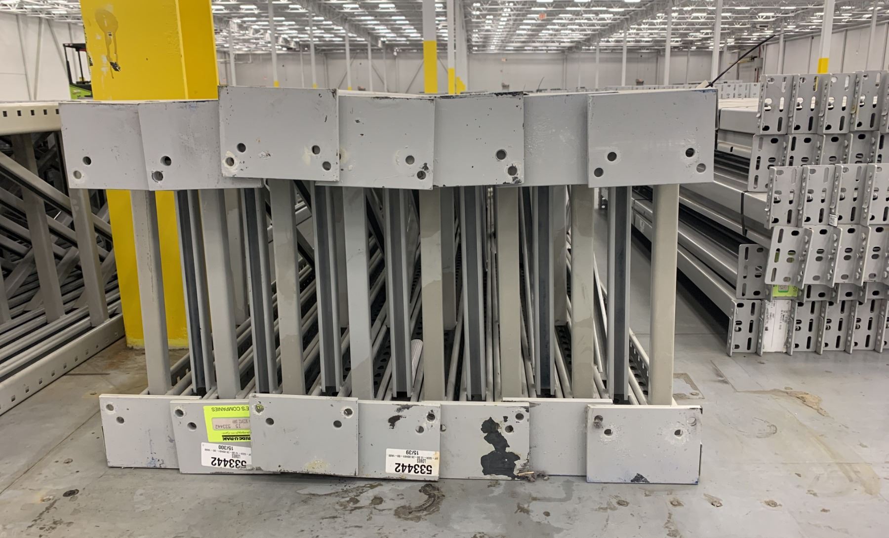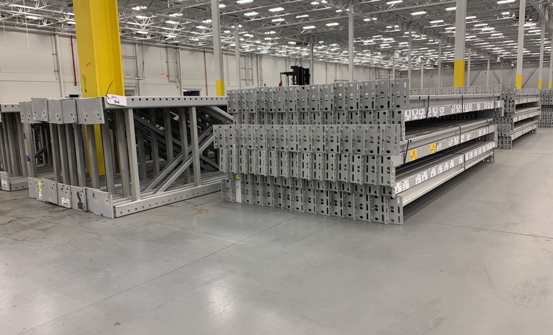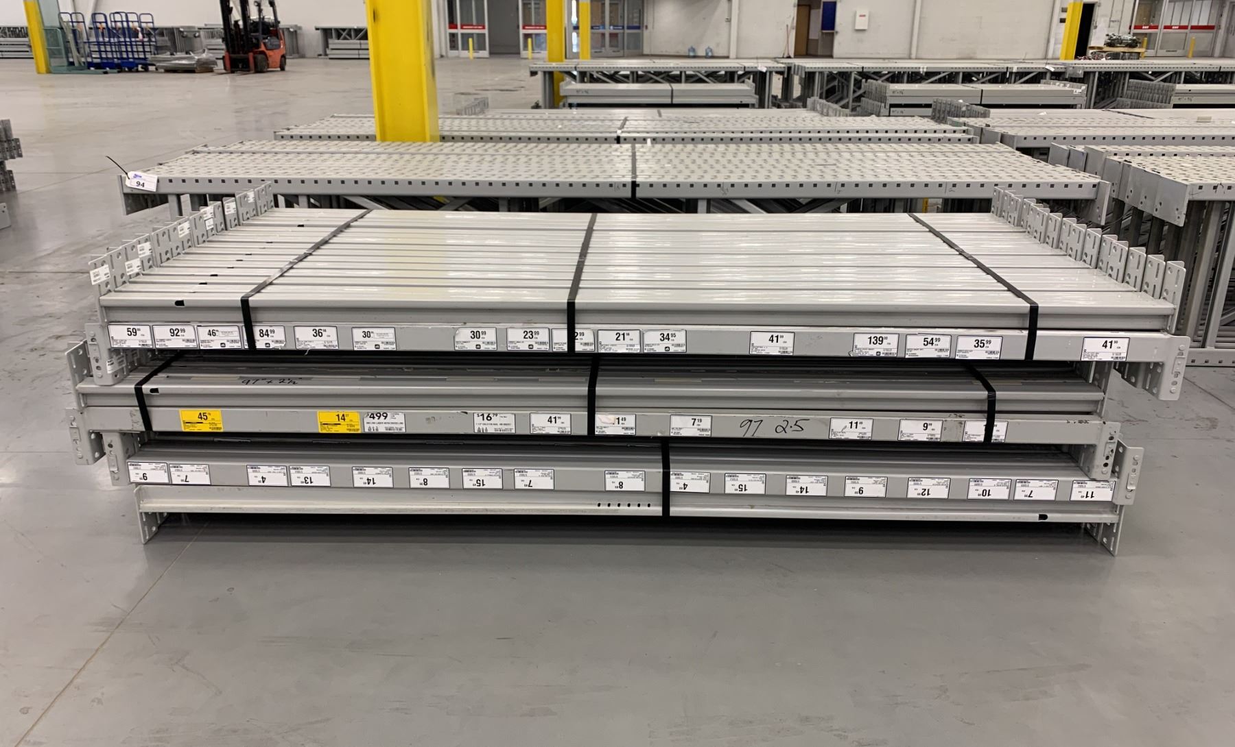 14 BAYS GREY INDUSTRIAL PALLET RACKING (15) UPRIGHTS 144" X 28" AND (90) SIDE BEAMS 97" X 2.5" WITH 8" X 6" WELDED FOOTPLATES 1/2" THICK