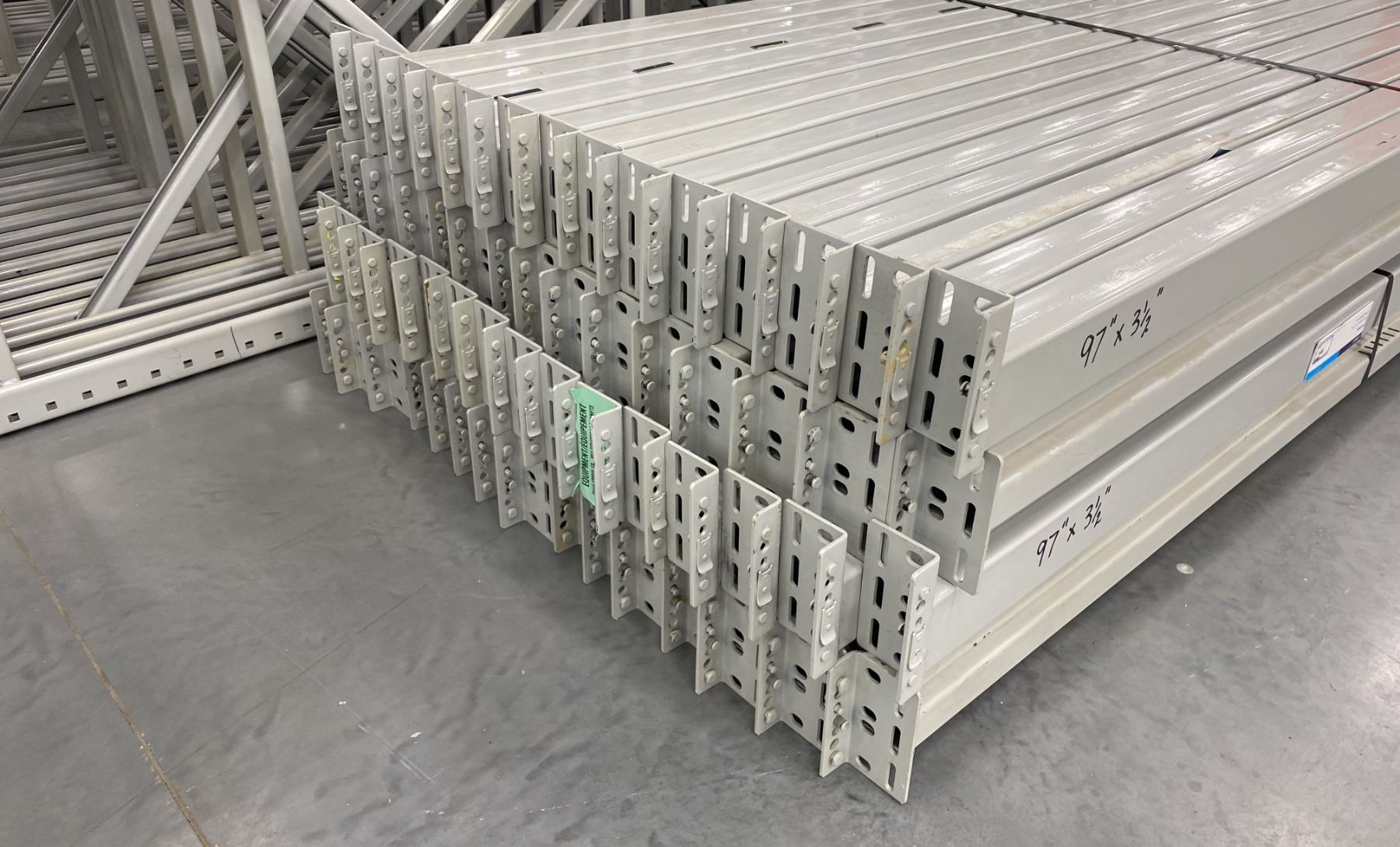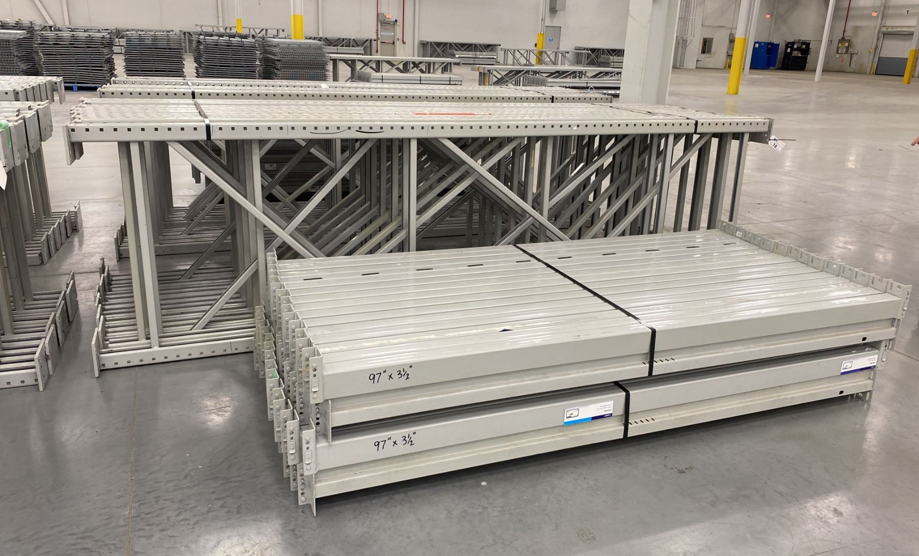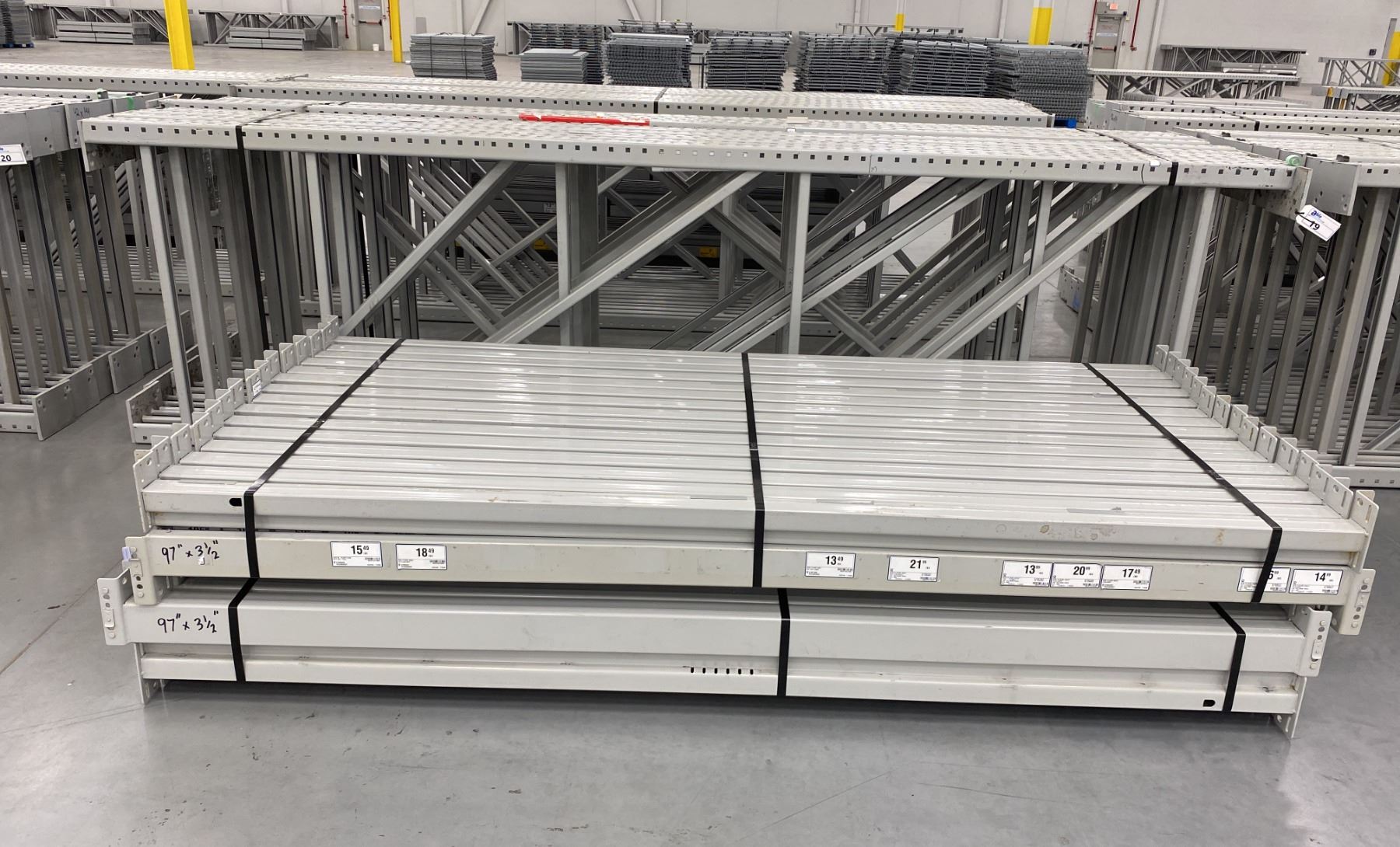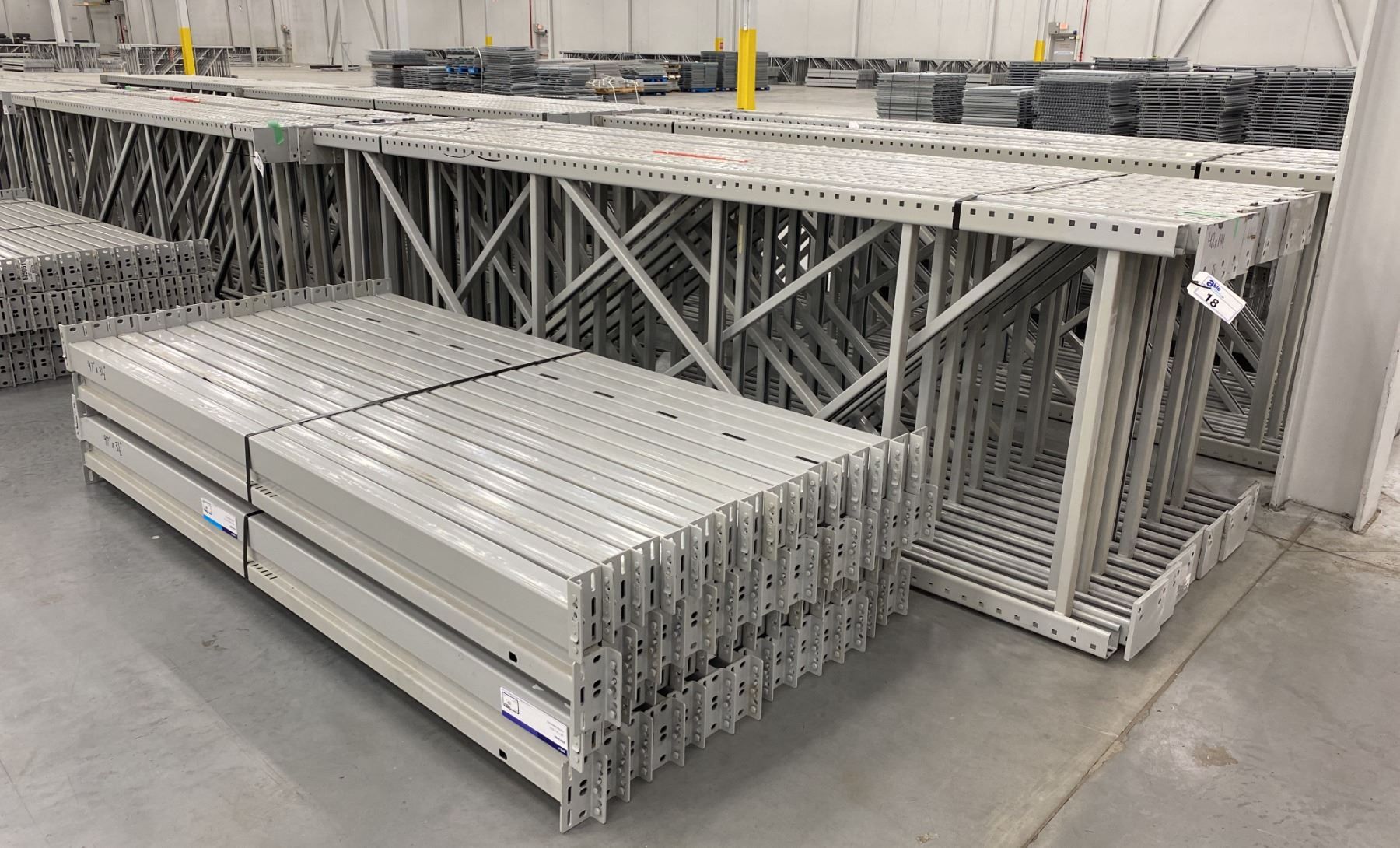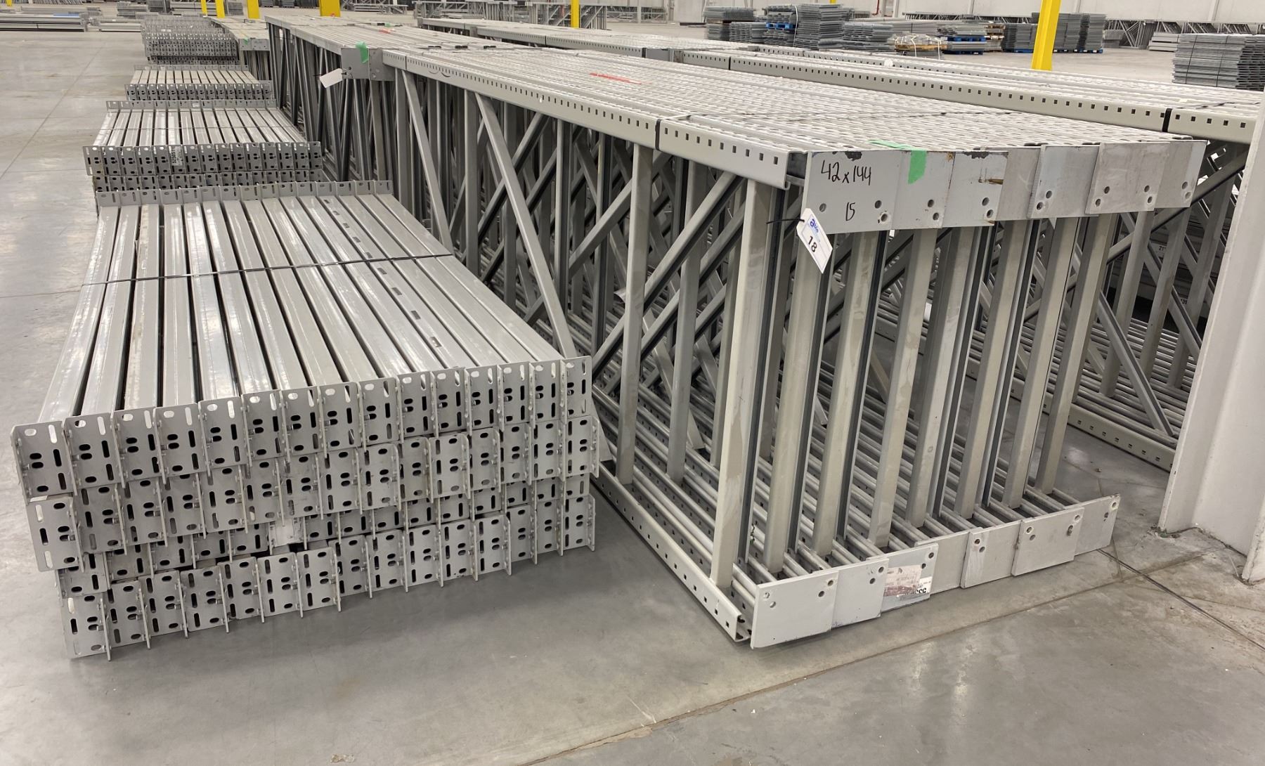 14 BAYS GREY INDUSTRIAL PALLET RACKING (15) UPRIGHTS 144" X 42" AND (60) SIDE BEAMS 97" X 3.5", WITH 8" X 6" WELDED FOOTPLATES 1/2" THICK