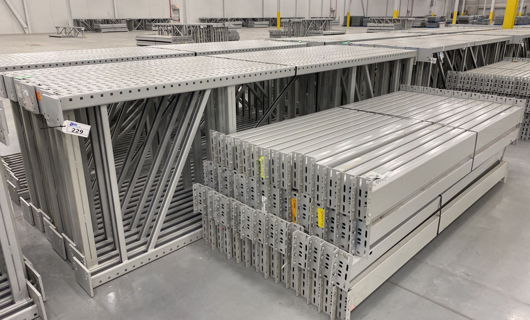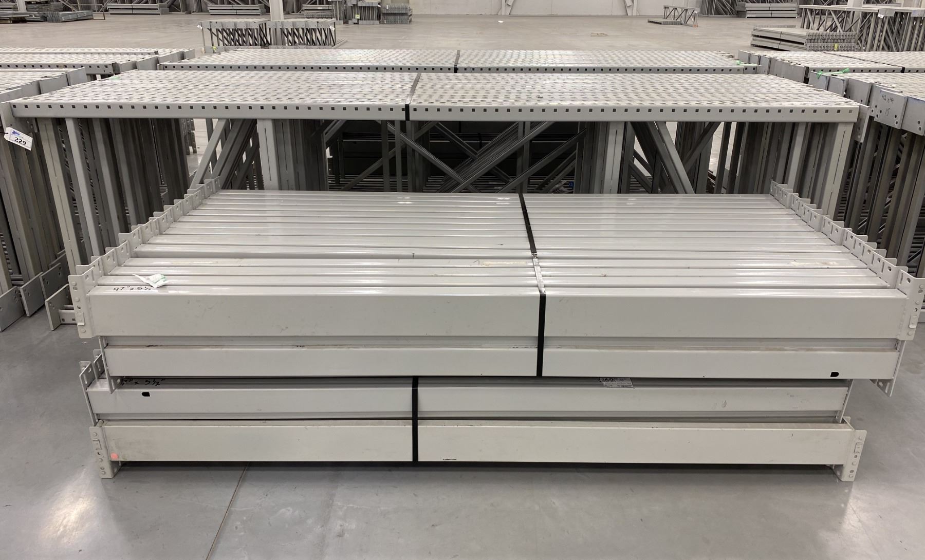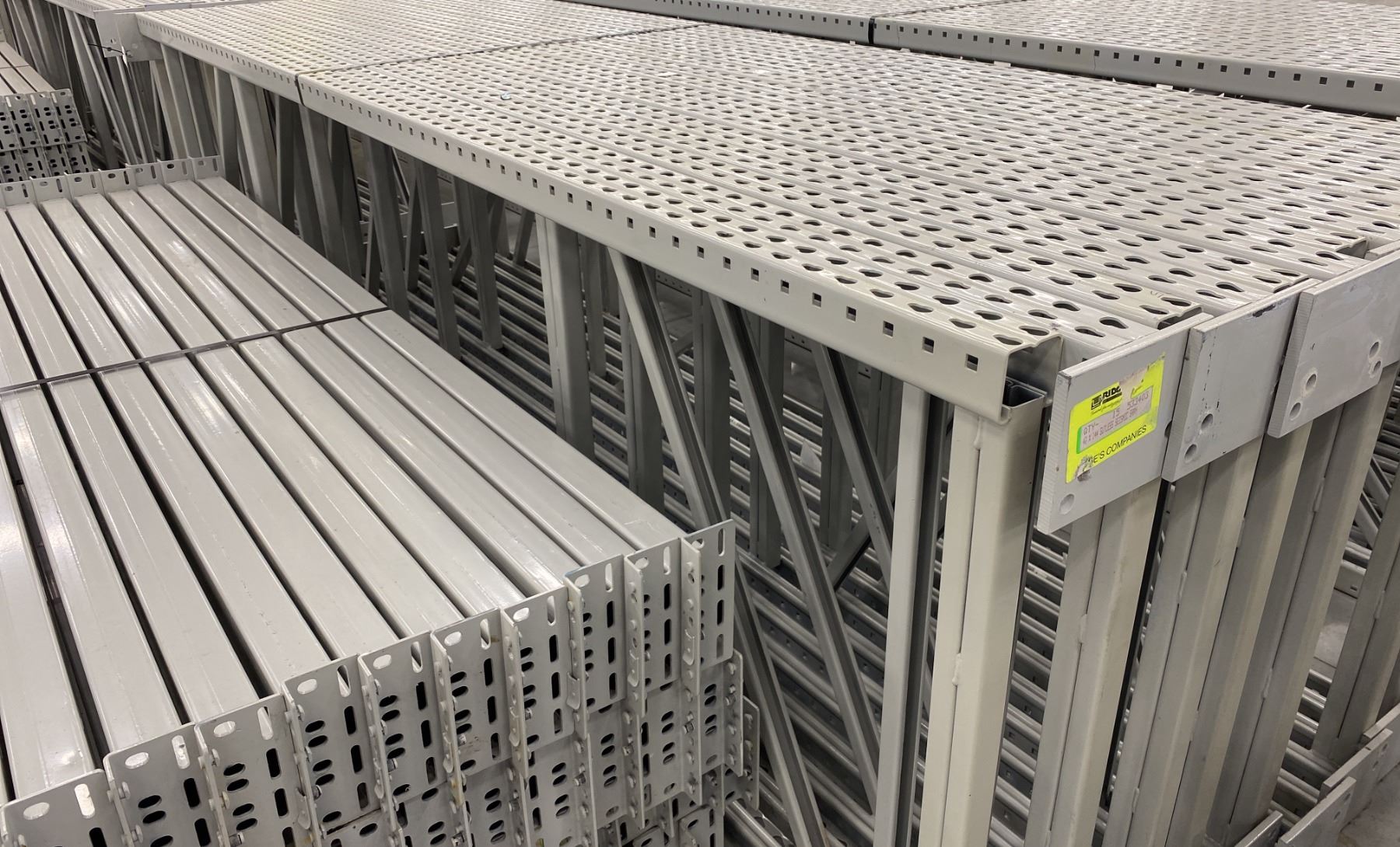 14 BAYS GREY INDUSTRIAL PALLET RACKING (15) UPRIGHTS 144" X 42" AND (60) SIDE BEAMS 97" X 5.5" WITH 8" X 6" WELDED FOOTPLATES 1/2" THICK
