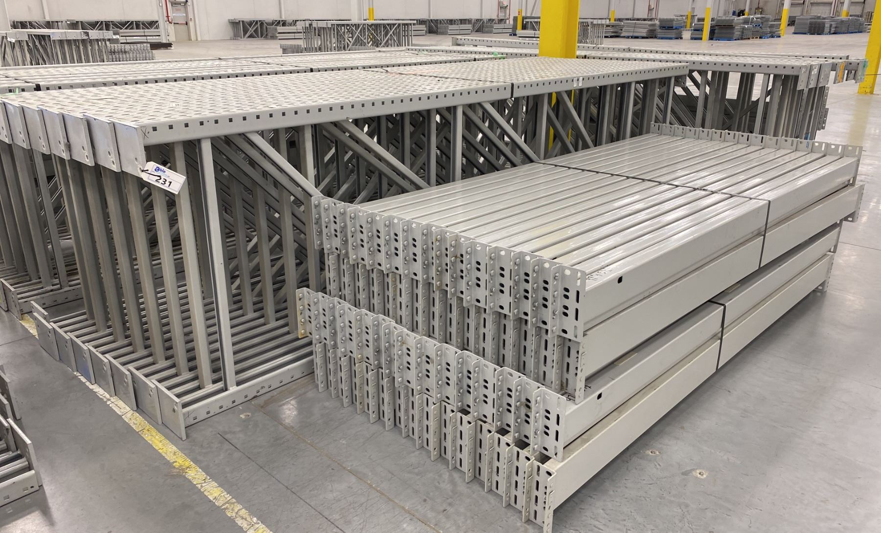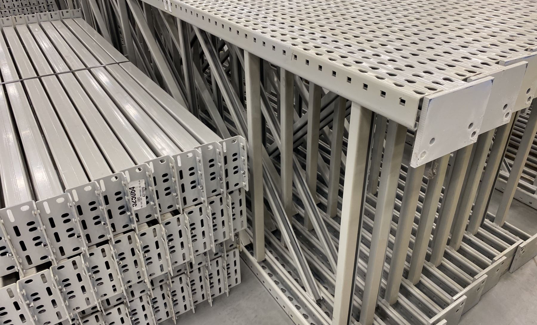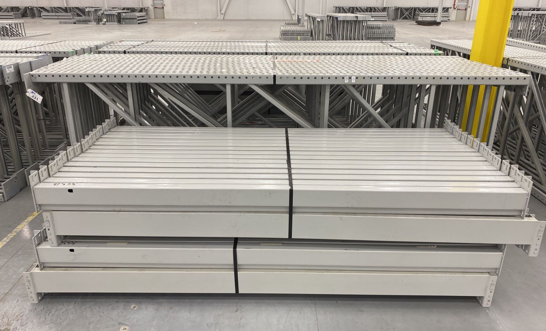 14 BAYS GREY INDUSTRIAL PALLET RACKING (15) UPRIGHTS 144" X 42" AND (60) SIDE BEAMS 97" X 5.5" WITH 8" X 6" WELDED FOOTPLATES 1/2" THICK