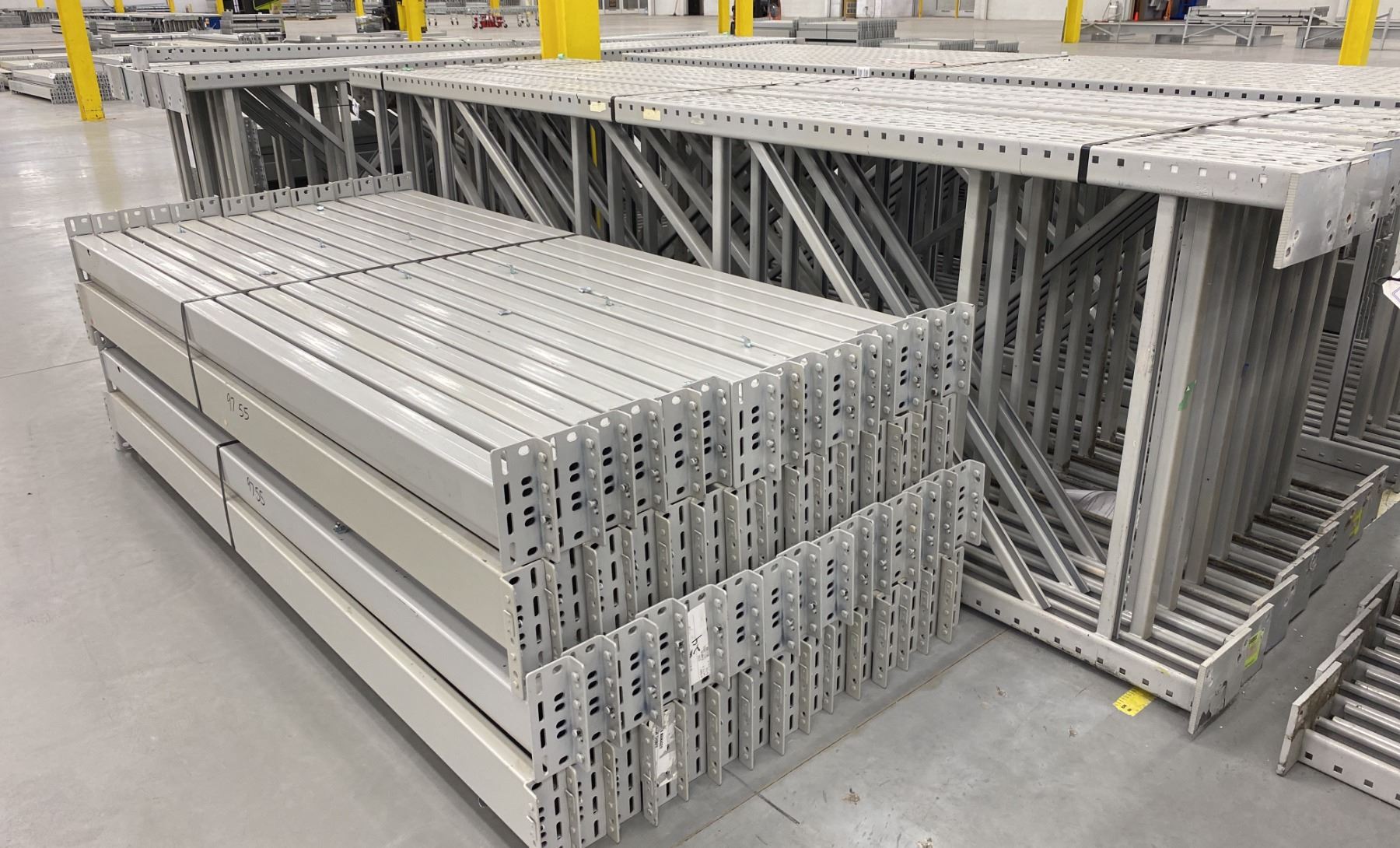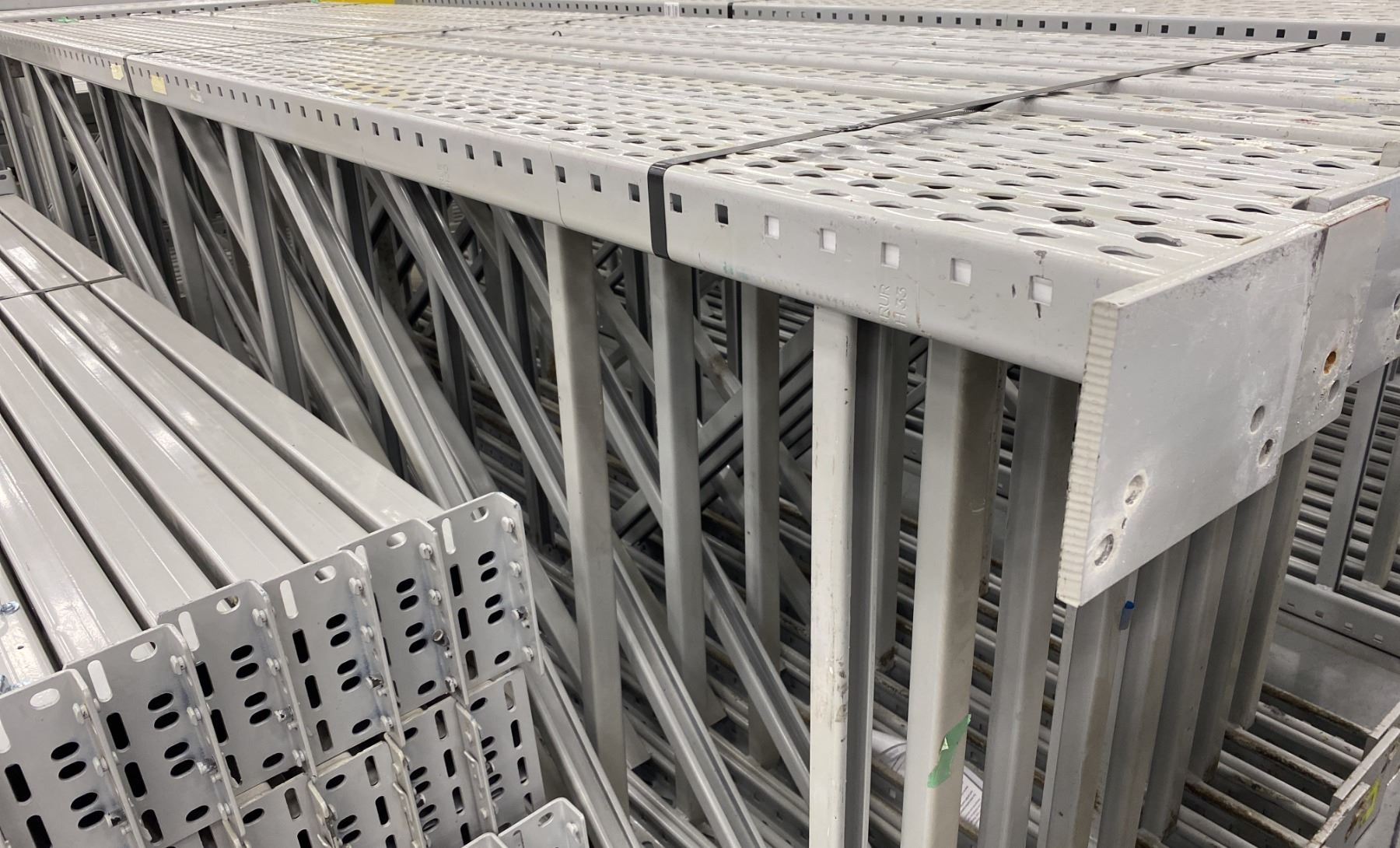 14 BAYS GREY INDUSTRIAL PALLET RACKING (15) UPRIGHTS 144" X 42" AND (60) SIDE BEAMS 97" X 5.5" WITH 8" X 6" WELDED FOOTPLATES 1/2" THICK
