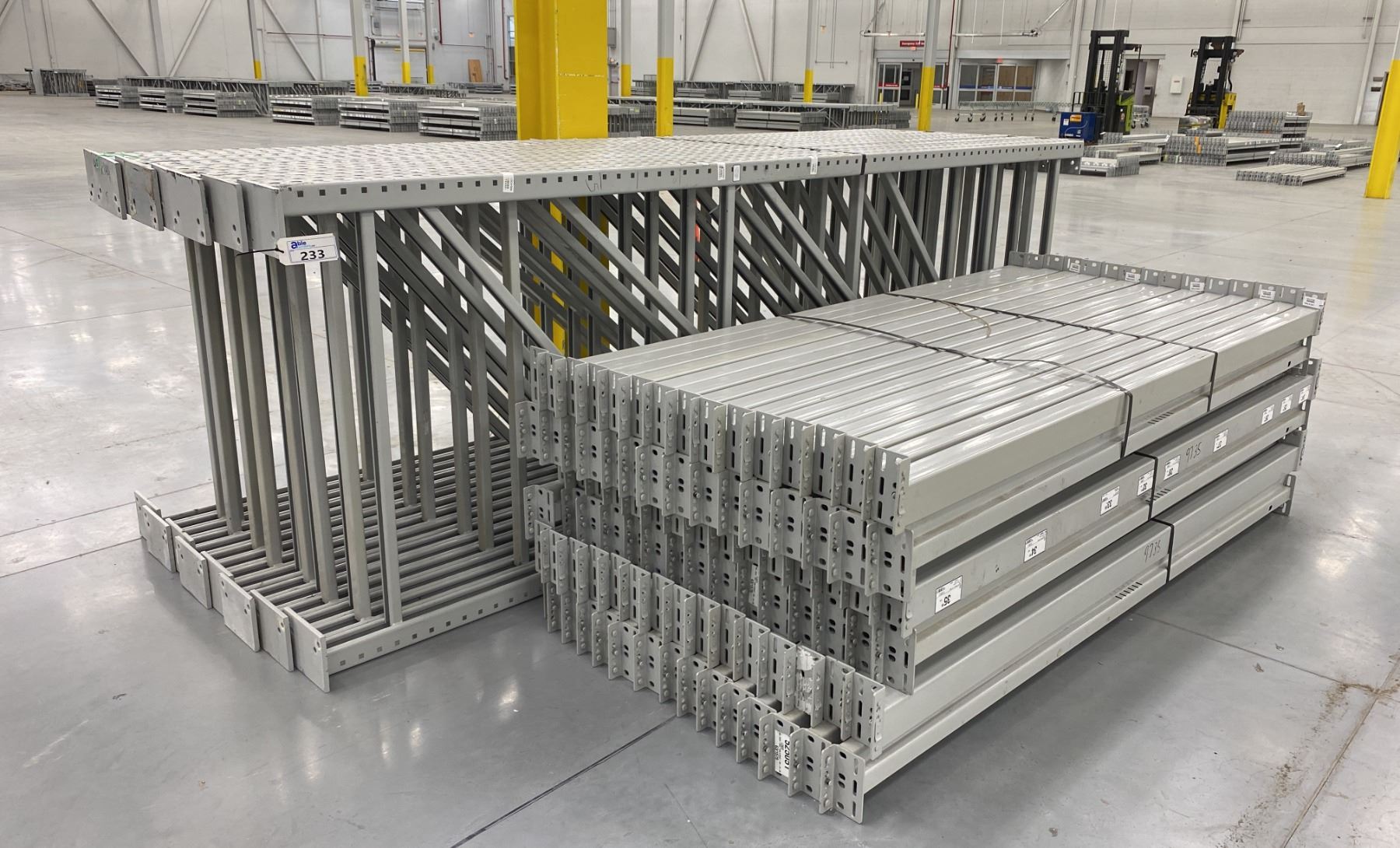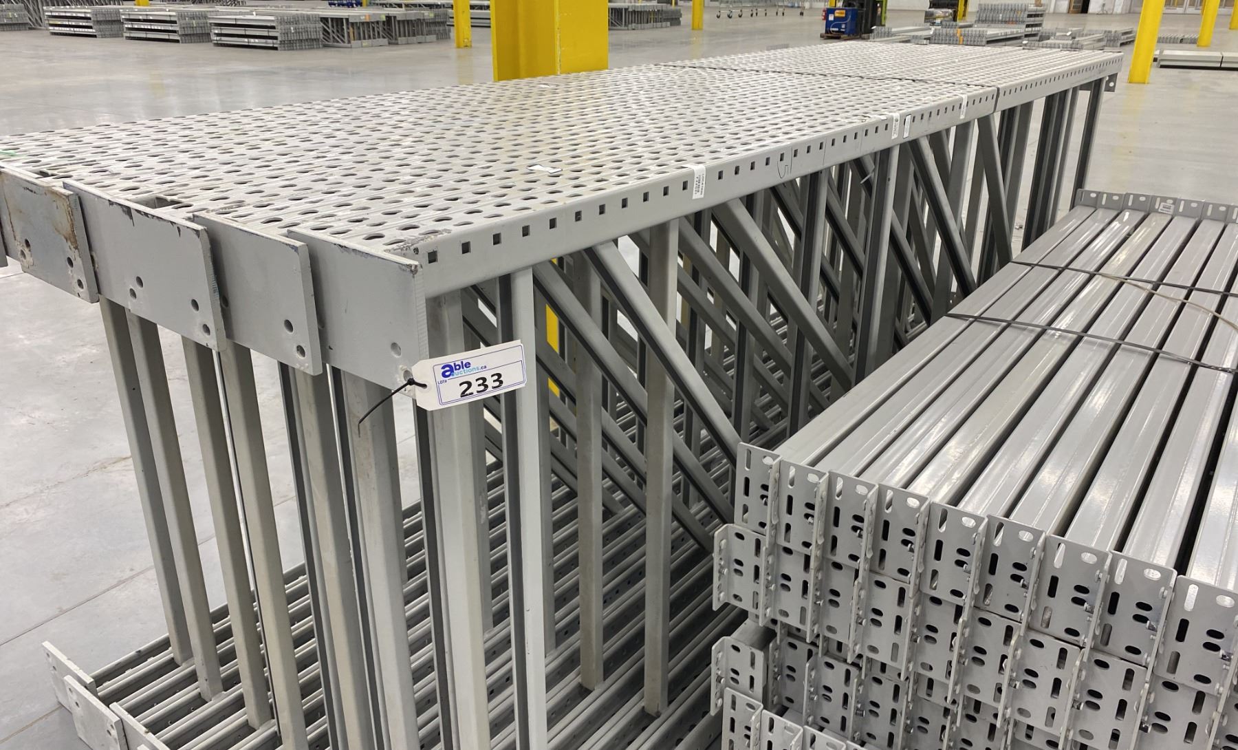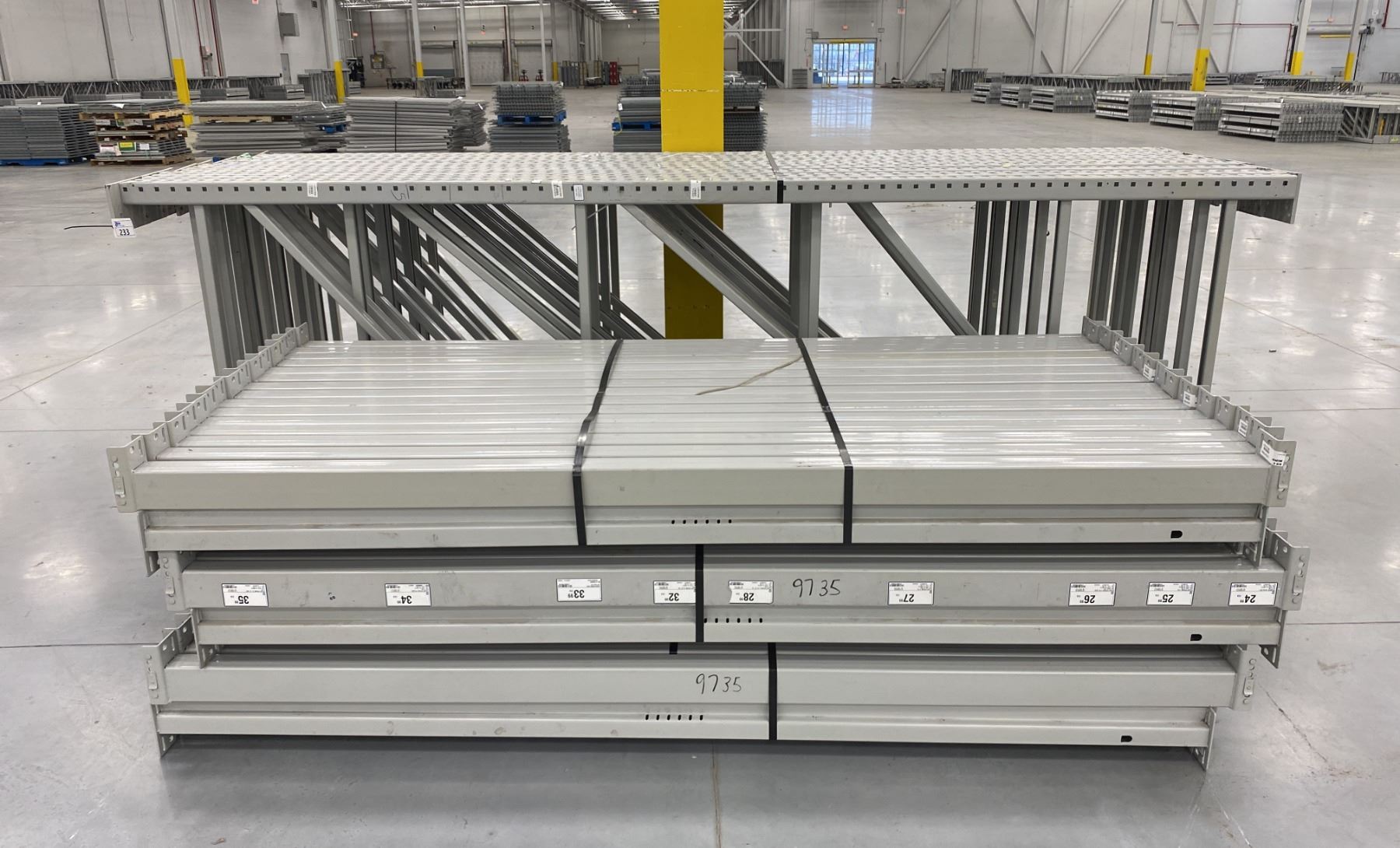 14 BAYS GREY INDUSTRIAL PALLET RACKING (15) UPRIGHTS 144" X 48" AND (90) SIDE BEAMS 97" X 3.5" WITH 8" X 6" WELDED FOOTPLATES 1/2" THICK