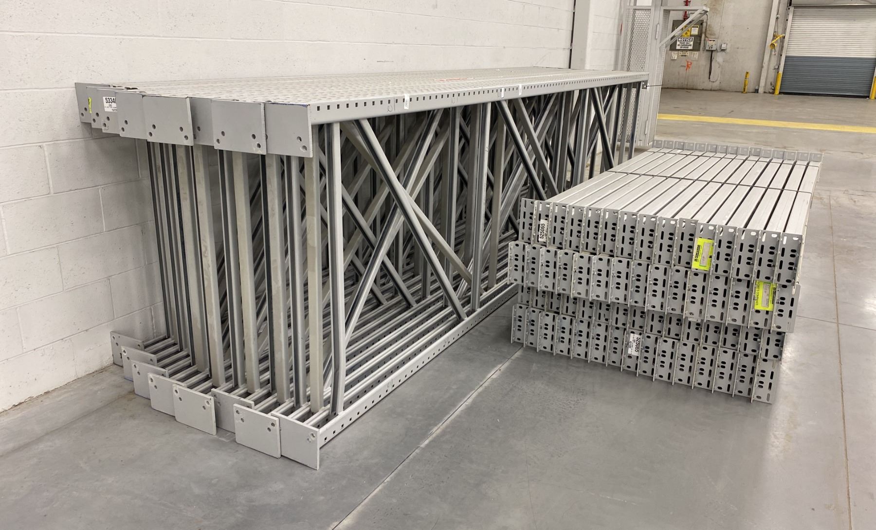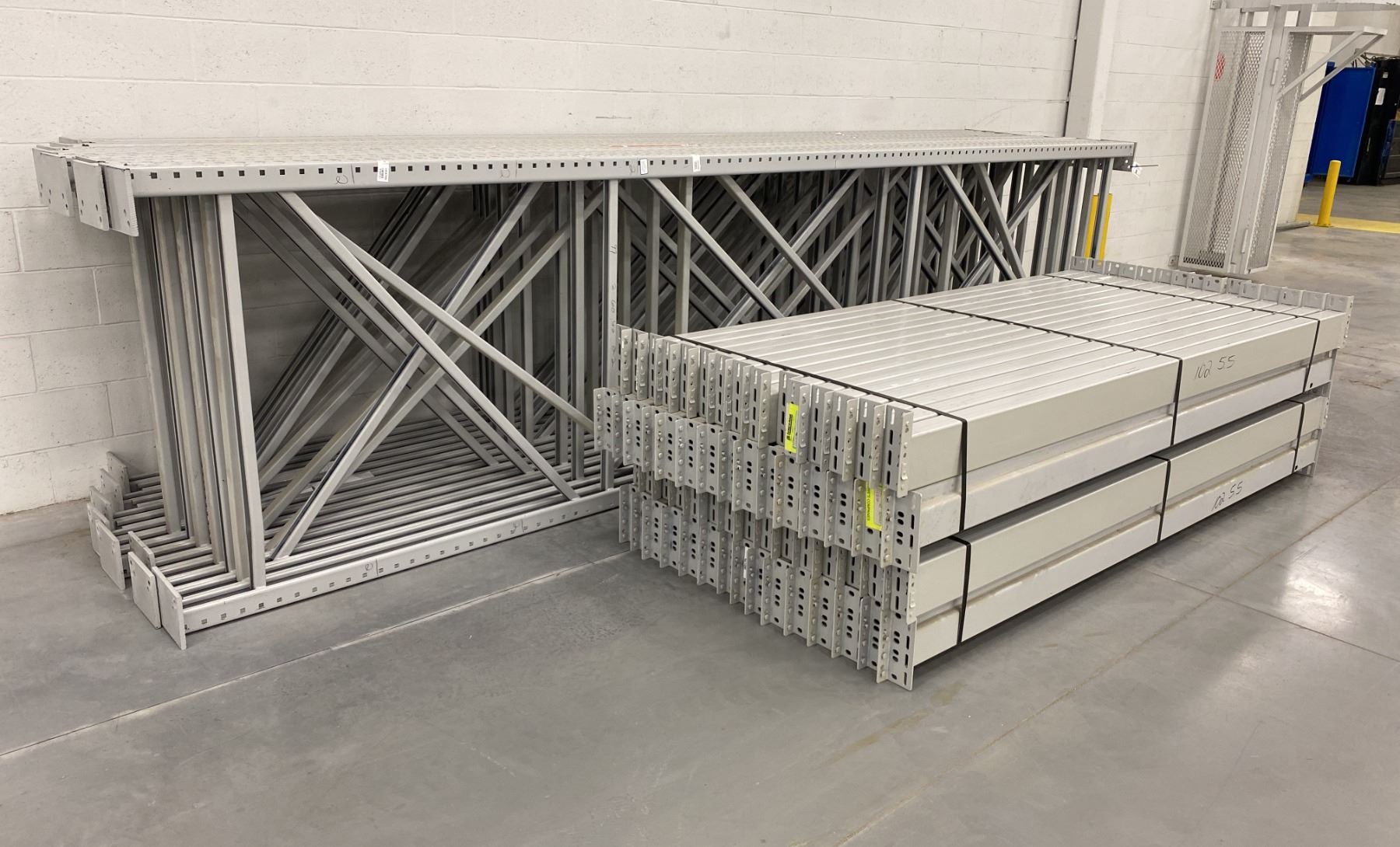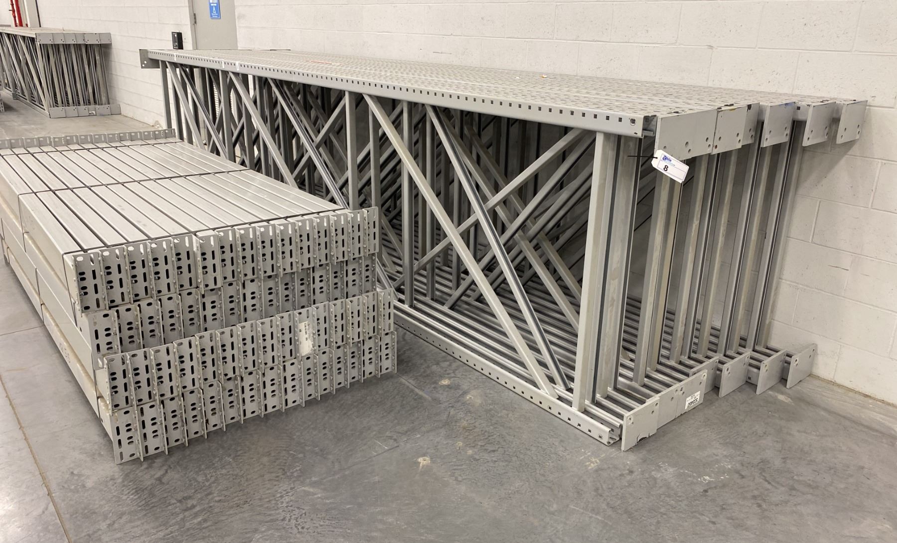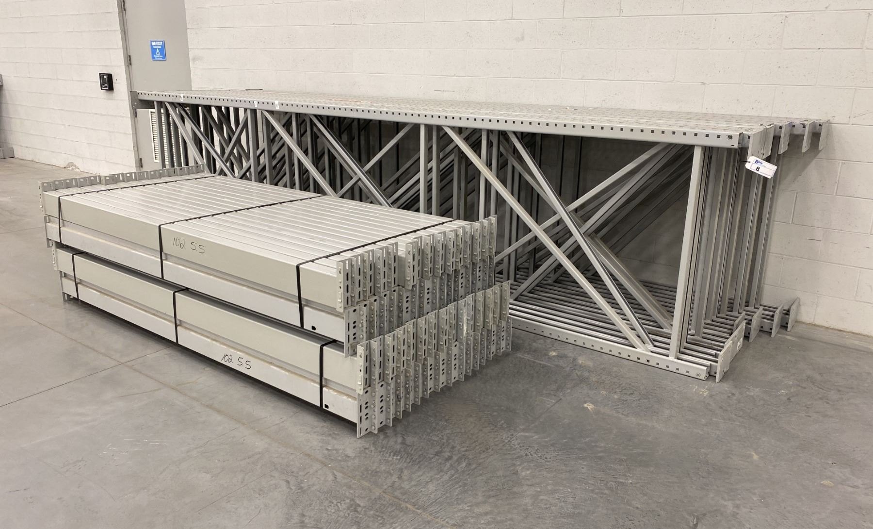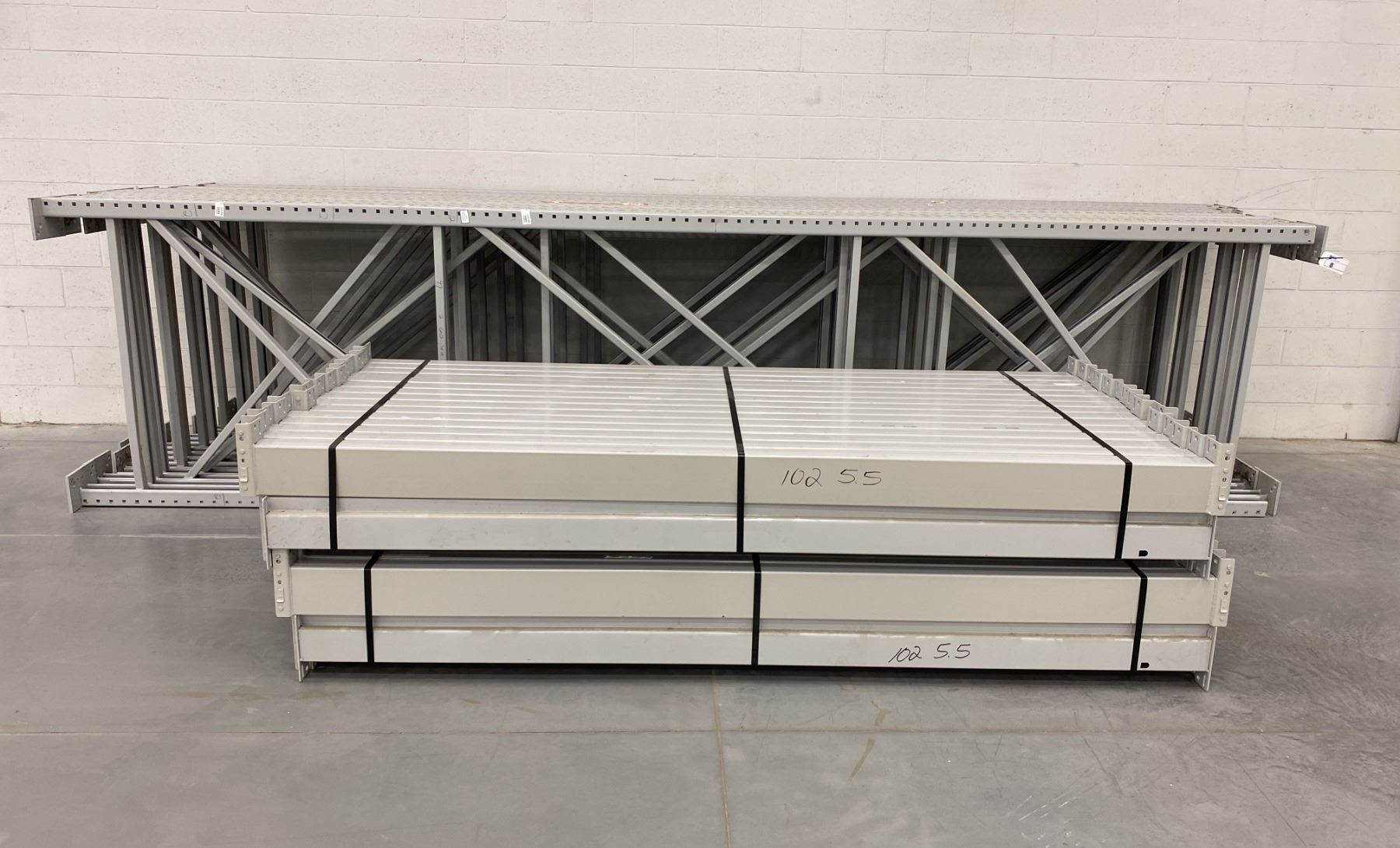 14 BAYS GREY INDUSTRIAL PALLET RACKING (15) UPRIGHTS 16FT X 4FT AND (60) SIDE BEAMS 102" X 5.5", WITH 8" X 6" WELDED FOOTPLATES 1/2" THICK
