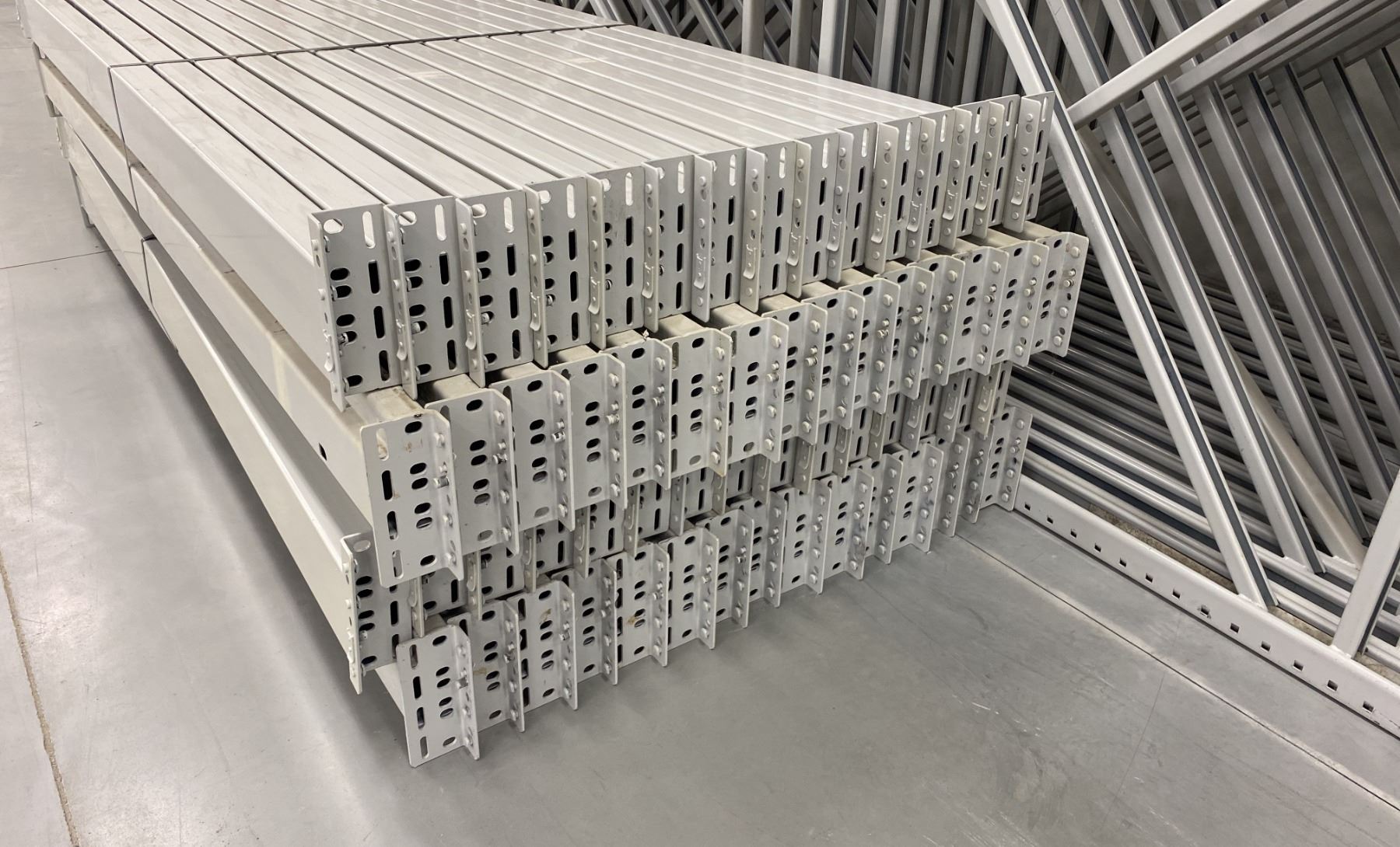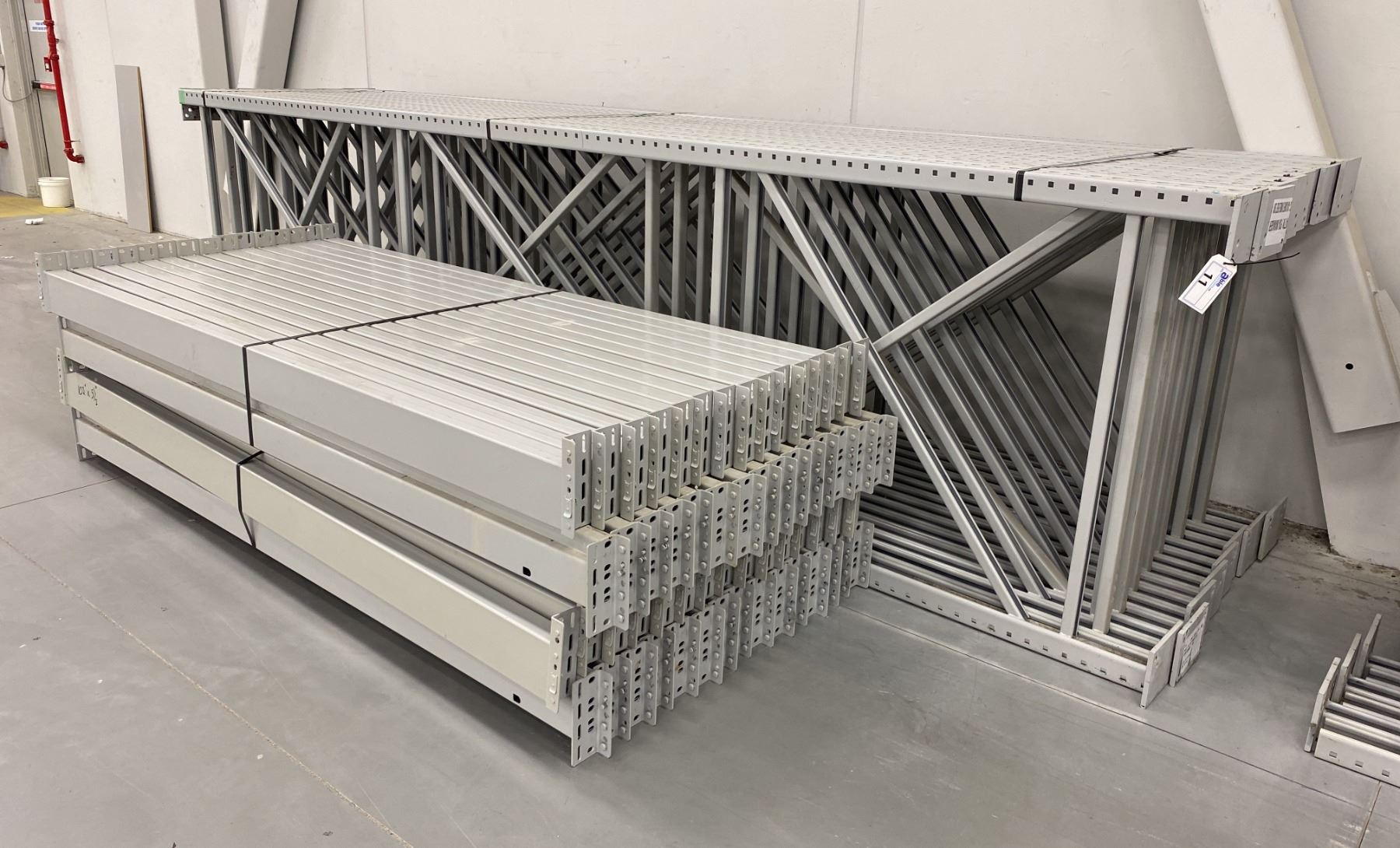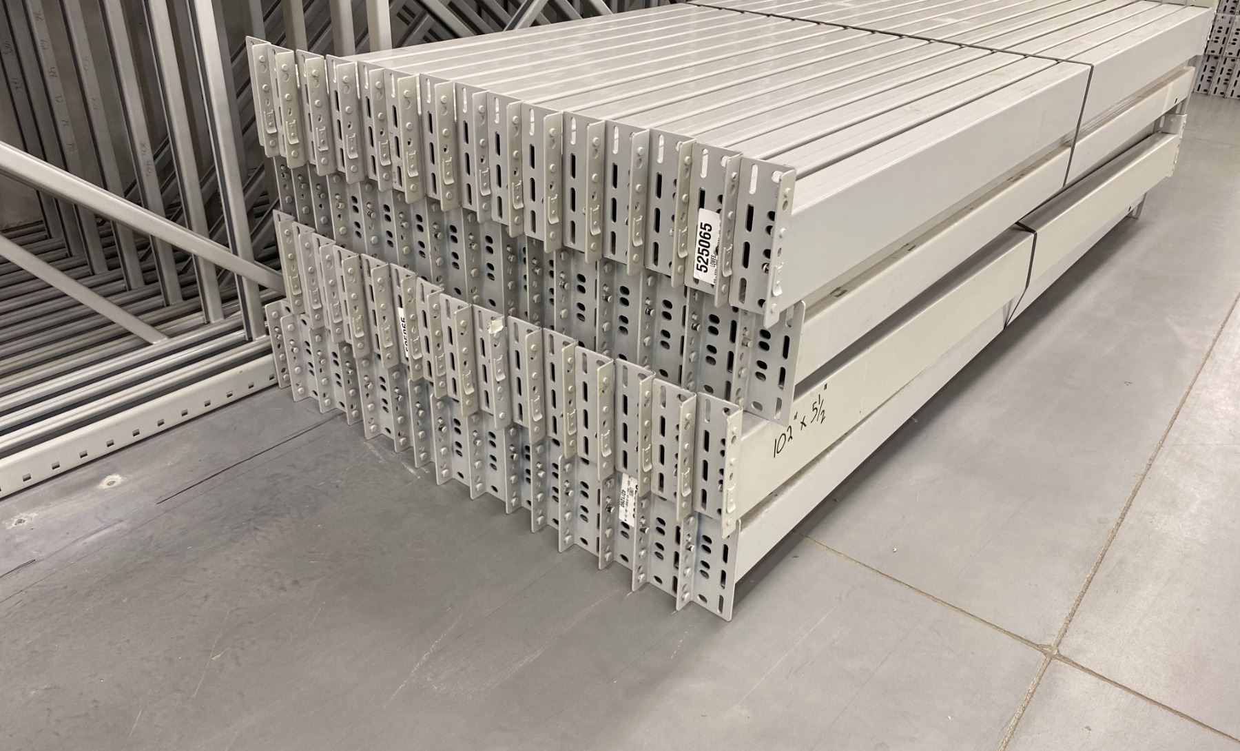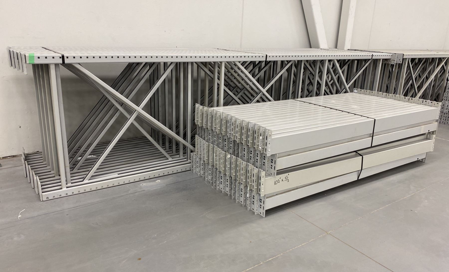 14 BAYS GREY INDUSTRIAL PALLET RACKING (15) UPRIGHTS 16FT X 4FT AND (60) SIDE BEAMS 102" X 5.5", WITH 8" X 6" WELDED FOOTPLATES 1/2" THICK