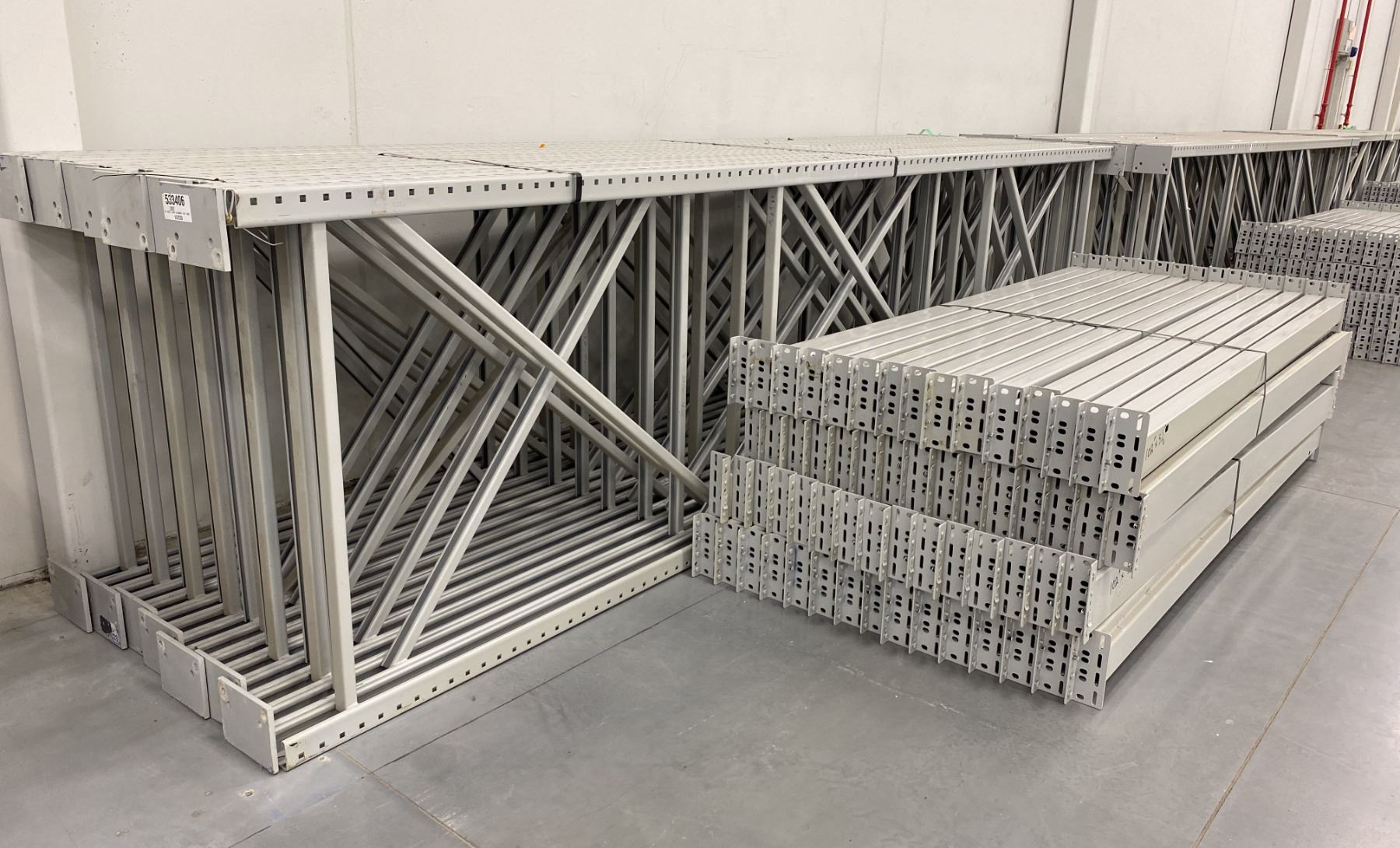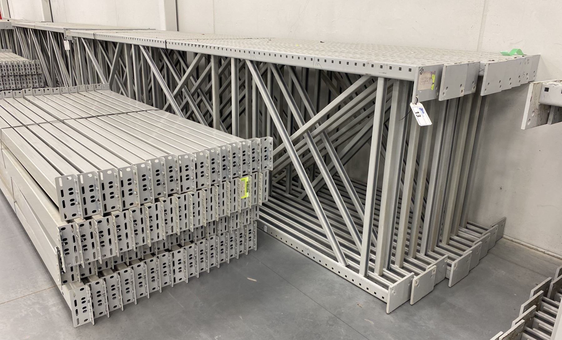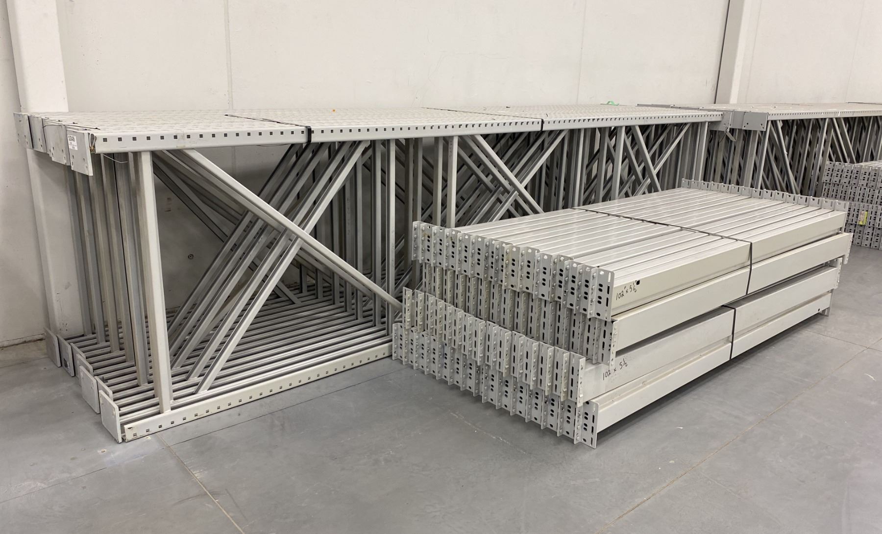 14 BAYS GREY INDUSTRIAL PALLET RACKING (15) UPRIGHTS 16FT X 4FT AND (60) SIDE BEAMS 102" X 5.5", WITH 8" X 6" WELDED FOOTPLATES 1/2" THICK
