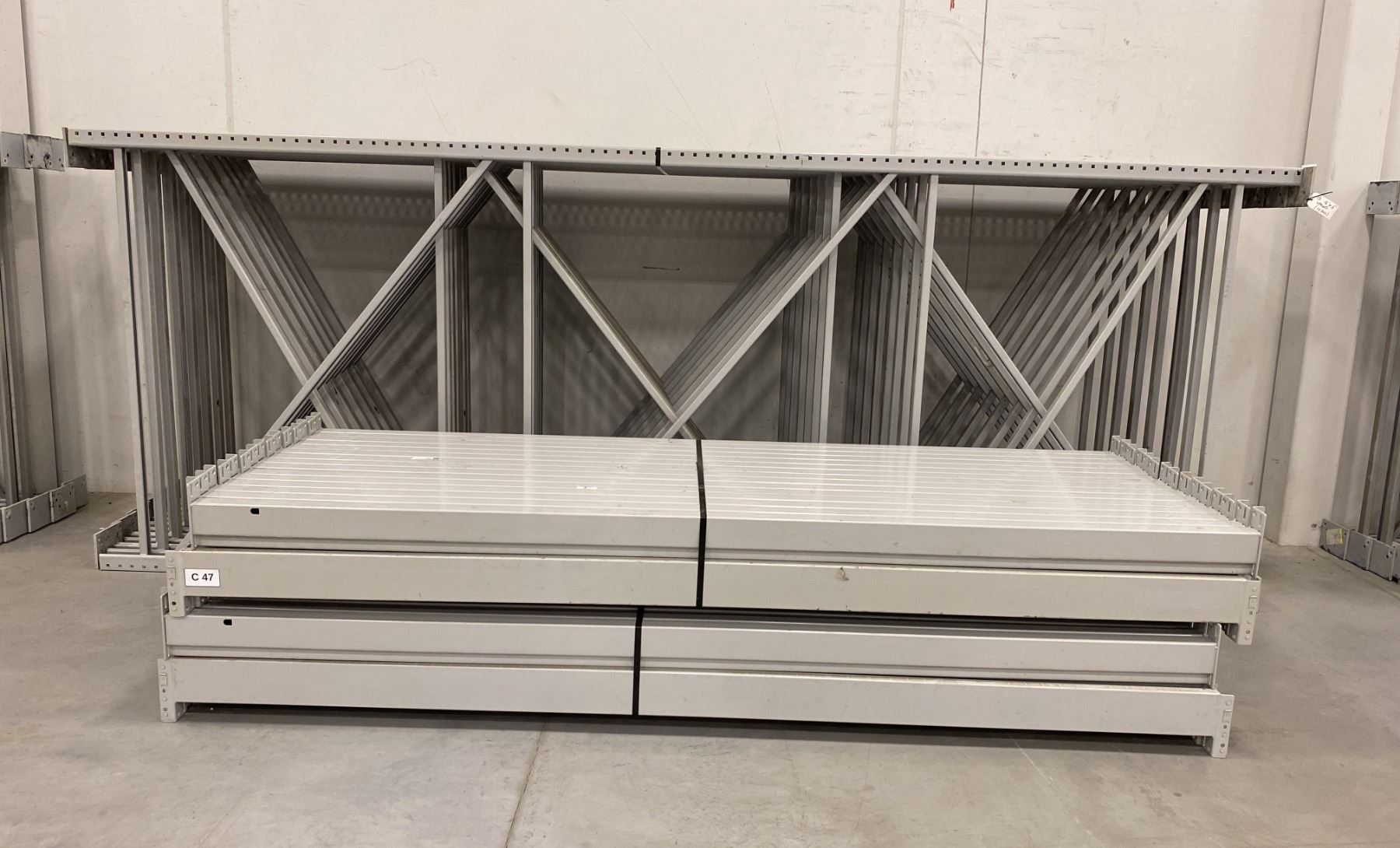 14 BAYS GREY INDUSTRIAL PALLET RACKING (15) UPRIGHTS 16FT X 6FT AND (60) SIDE BEAMS 124" X 5.5", WITH 8" X 6" WELDED FOOTPLATES 1/2" THICK