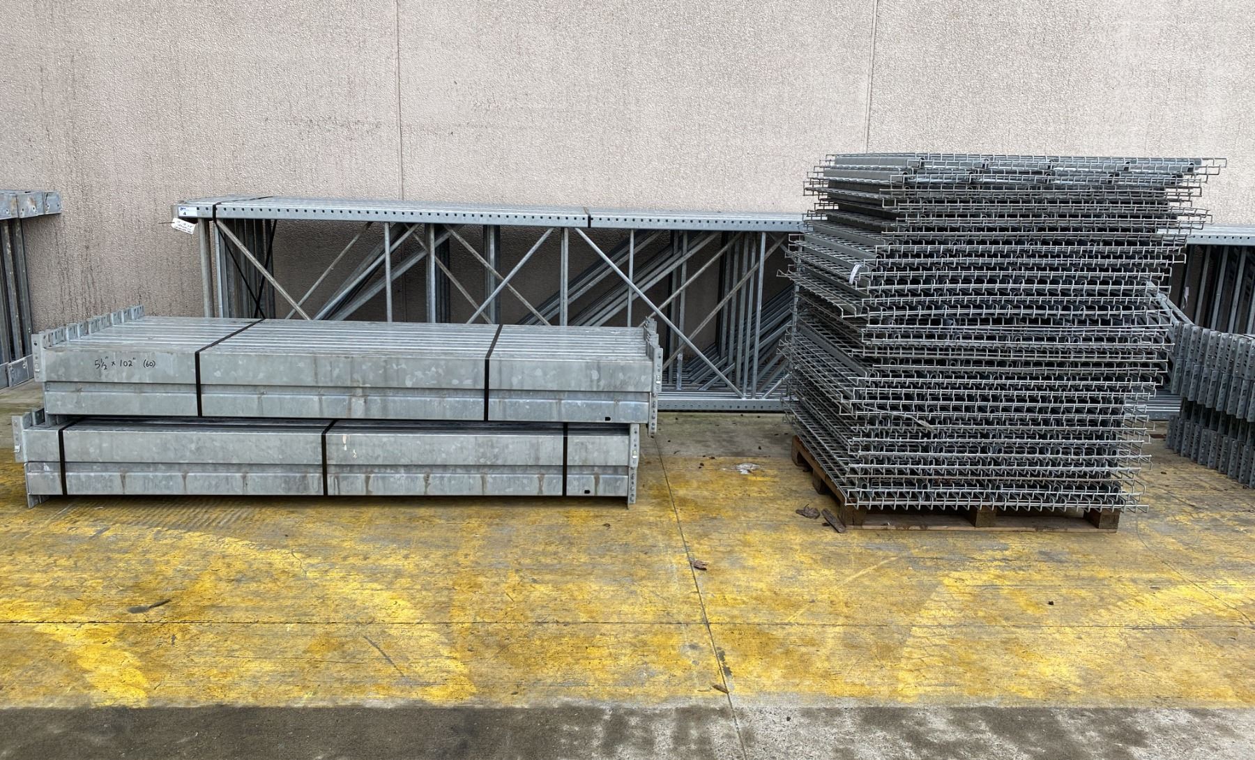 14 BAYS OF GALVANIZED INDUSTRIAL PALLET RACKING (15) UPRIGHTS 16FT X 4FT, (60) SIDE BEAMS 102" X 5.5" AND APPROX. 50 SECTIONS OF MESH DECKING, WITH 8" X 6" WELDED FOOTPLATES 1/2" THICK