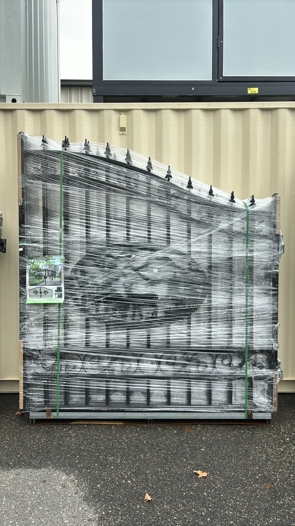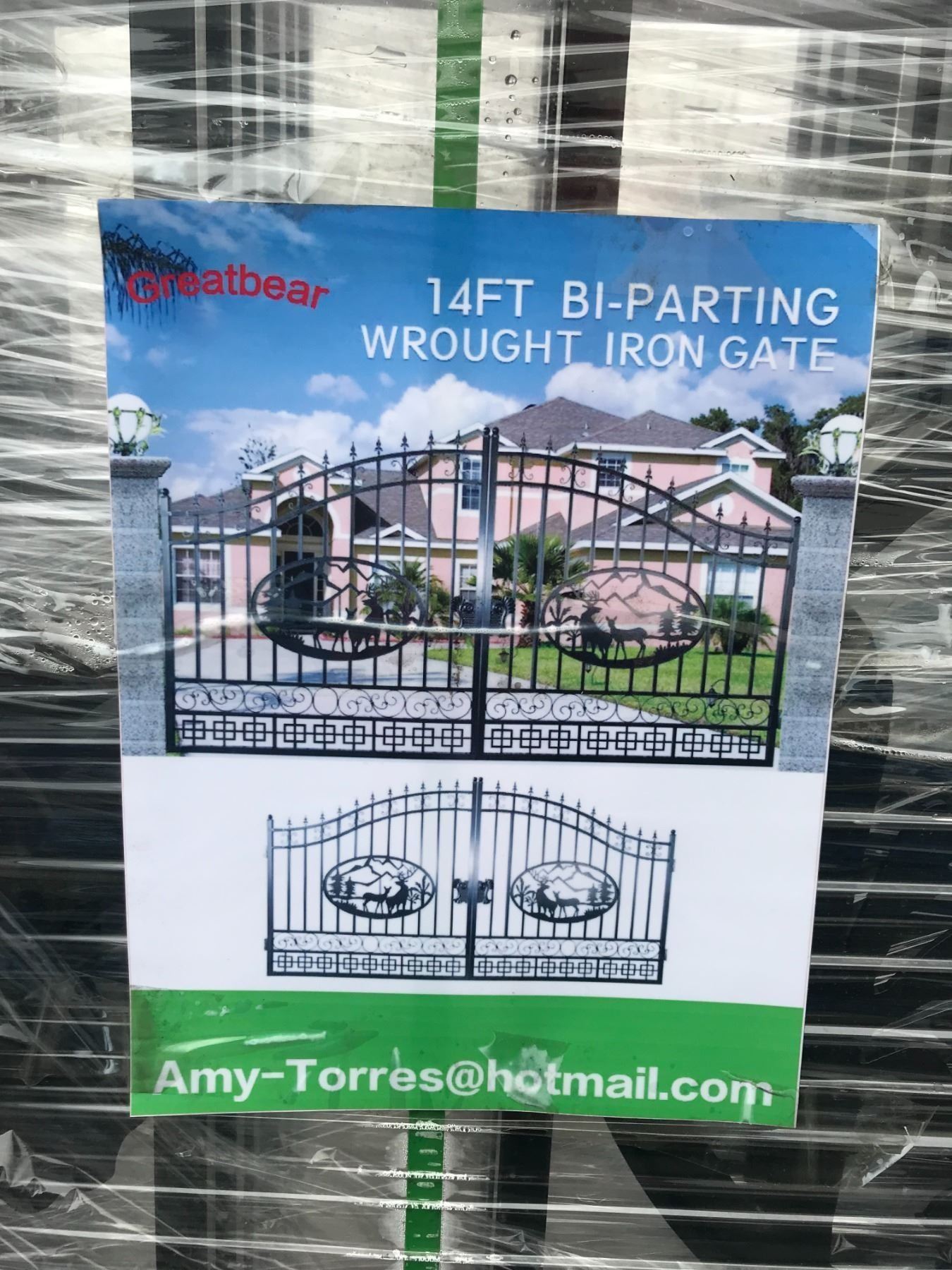 14' BI-PARTING IRON GATE WITH OVAL DEER ARTWORK ** REQUIRES 2 PEOPLE FOR REMOVAL **