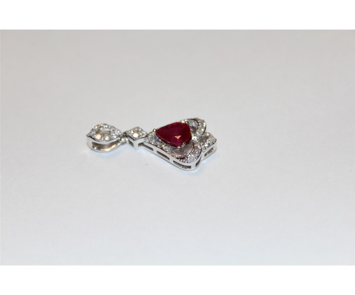 14 KT. WHITE GOLD RUBY & DIAMOND SET PENDANT PAVE AND CLAW SET WITH 37 BRILLIANT CUT DIAMONDS APPROX. 0.70 CARATS AND 1 PEAR SHAPED RUBY APPROX. 1.20 CARATS. REPLACEMENT VALUE $1600.00
