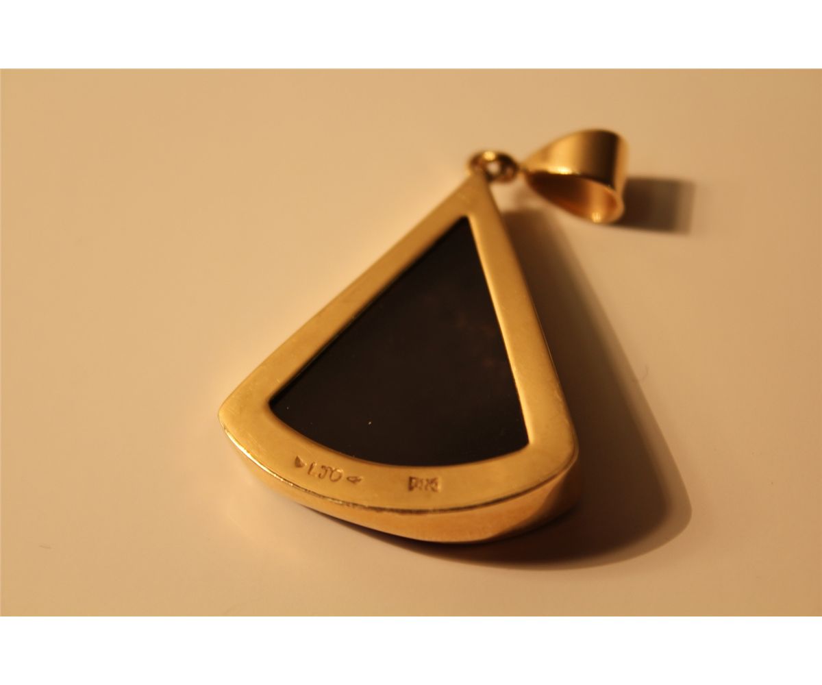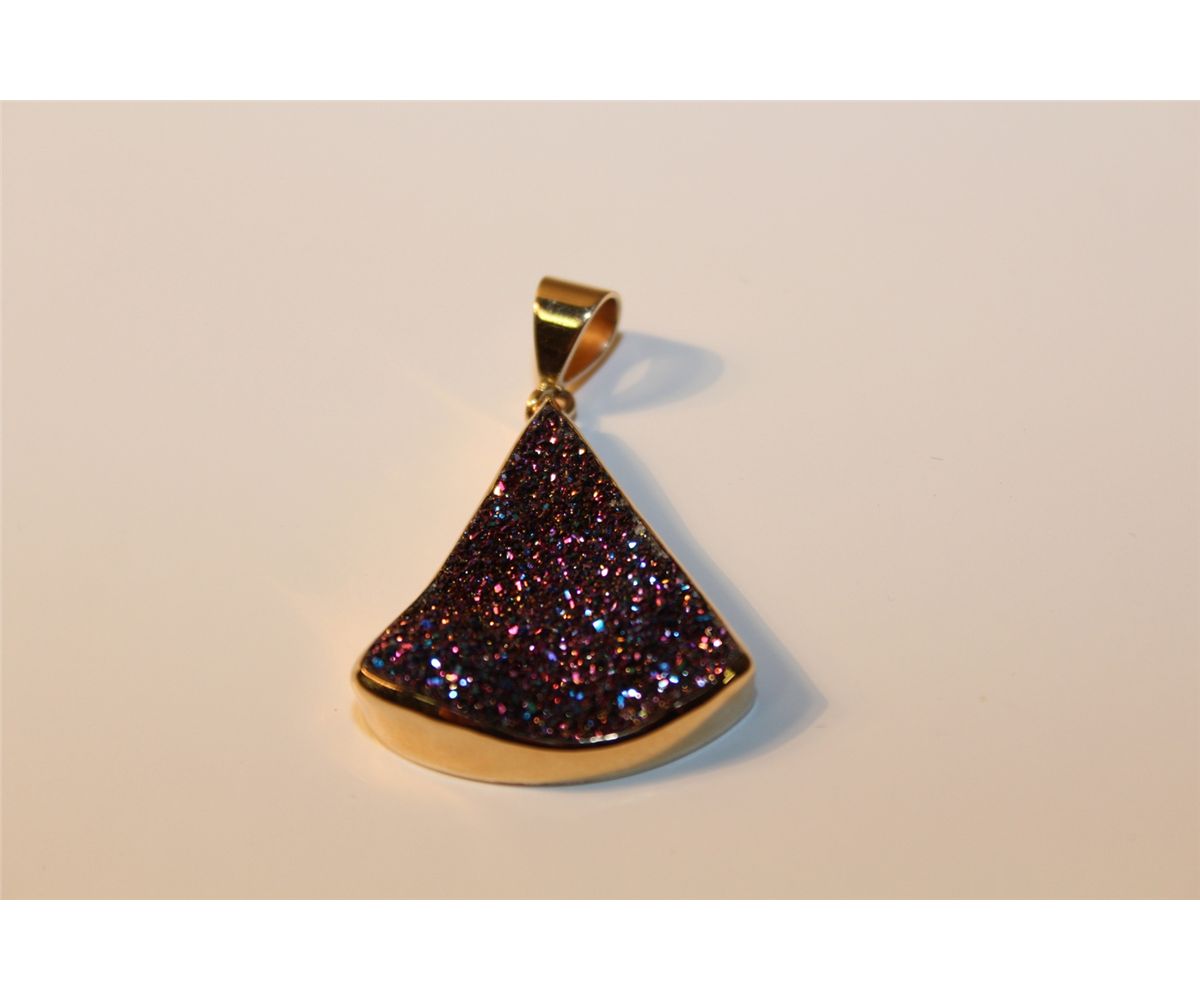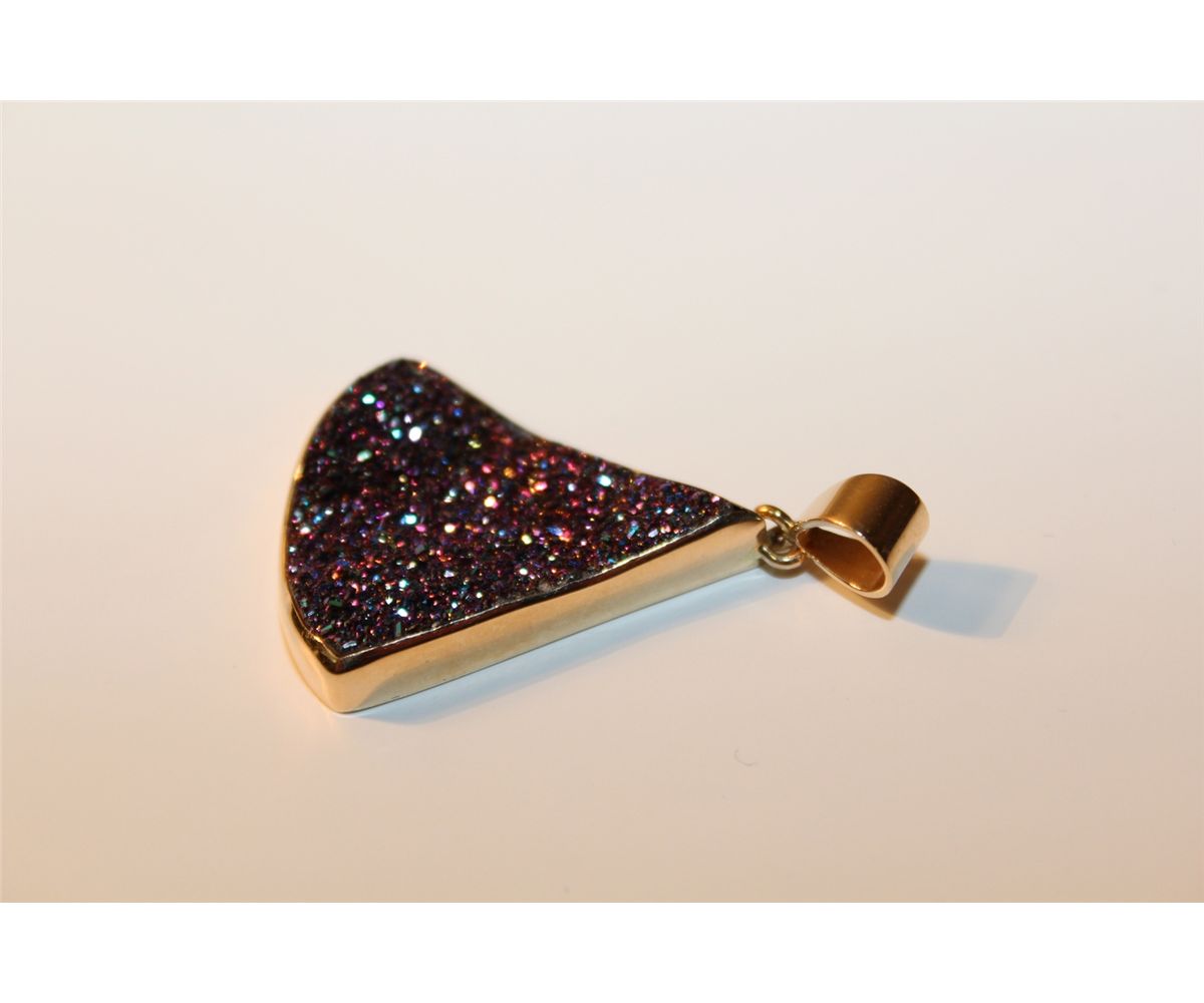 14 KT YELLOW GOLD CUSTOM MADE DRUZY QUARTZ PENDANT . HOLDS 1 TRIANGULAR SHAPED DOMED & CONCAVE PROLIFE DRUZY QUARTZ WITH A DEEP PURPLE AND OPALESCENT APPLIED FINISH EXPOSING THE NATURAL QUARTZ CRYSTALS. VERY WELL MADE AND FINISHED. REPLACEMENT VALUE: 1