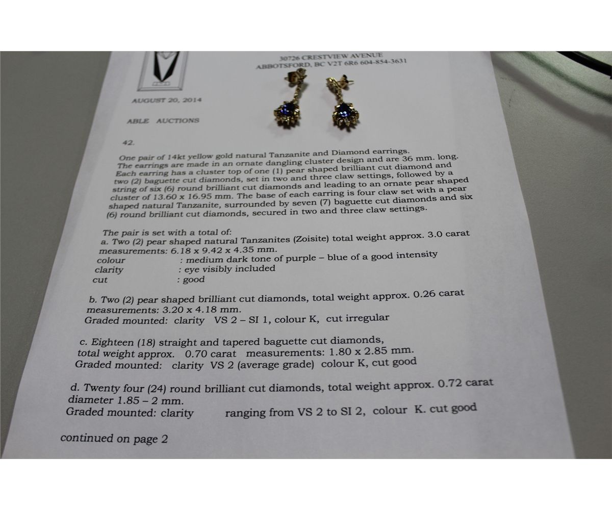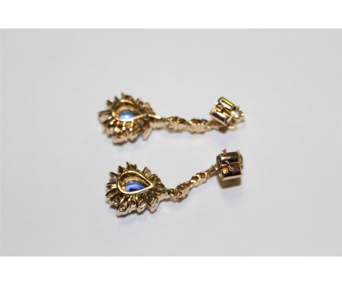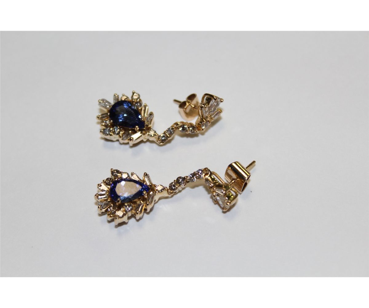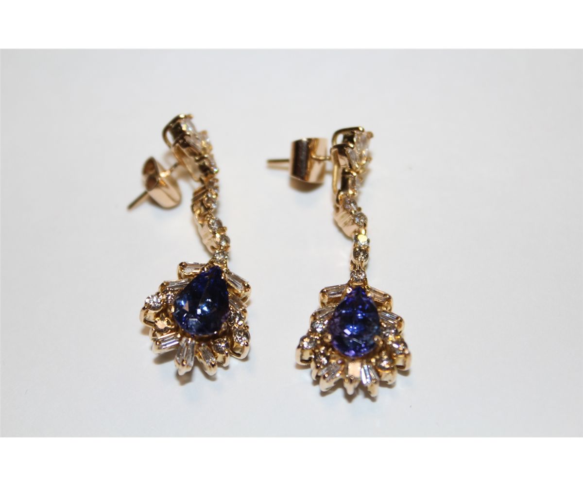 14 KT. YELLOW GOLD EARRINGS. SET WITH 2 PEAR SHAPED NATURAL TANZANITES APPROX. 3.0 CARATS & 2 PEAR SHAPED BRILLIANT CUT DIAMONDS APPROX. 0.26 CARATS, 18 BAQUETTE CUT DIAMONDS APPROX. 0.70 CARATS, 24 BRILLIANT CUT DIAMONDS APPROX. 0.72 CARATS. TOTAL: 1.68 REPLACEMENT VALUE OF $4600