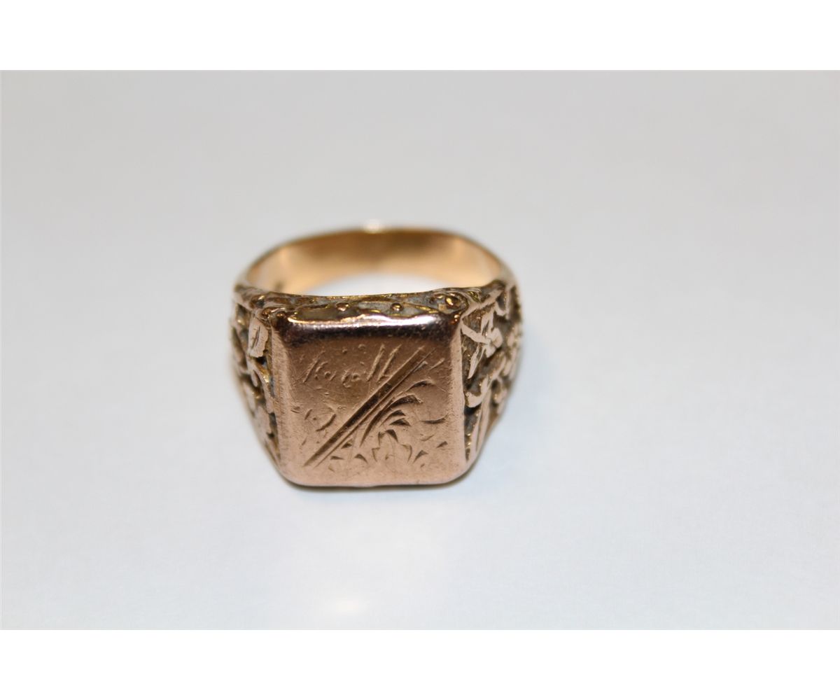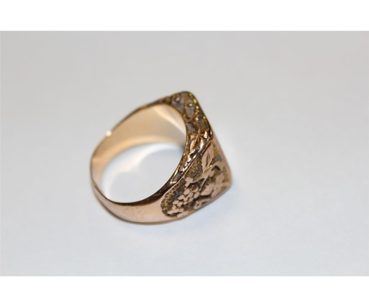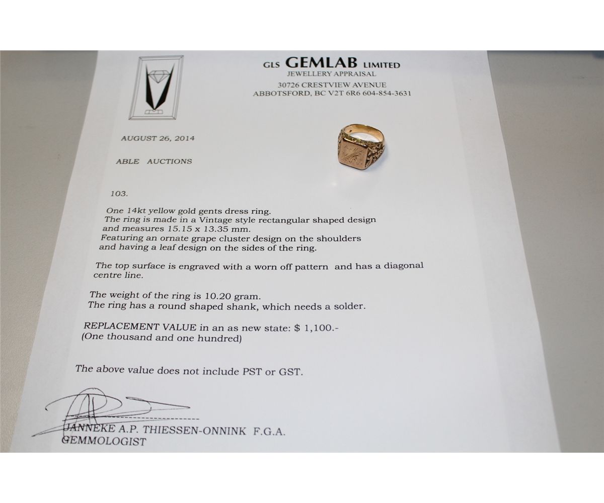 14 KT. YELLOW GOLD GENTS DRESS RING. FEATURING A ORNATE GRAPE CLUSTER DESIGN ON THE SHOULDERS AND LEAF DESIGN ON THE SIDES OF THE RING. REPLACEMENT VALUE: $1100.00