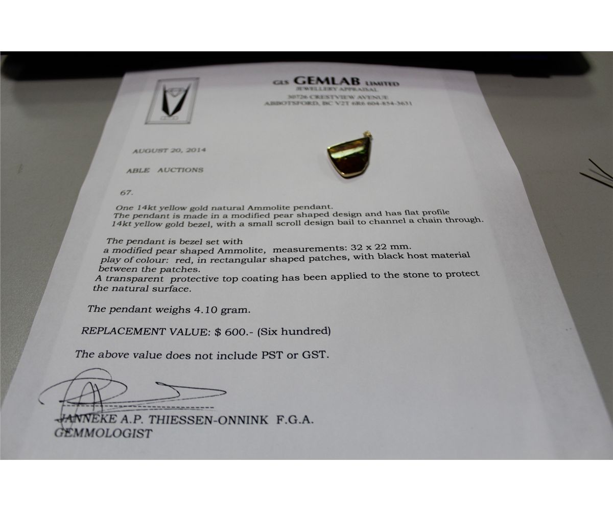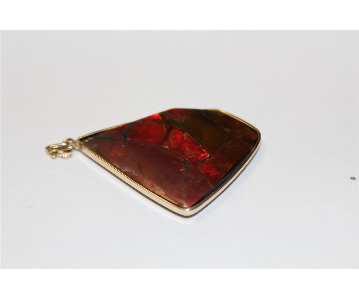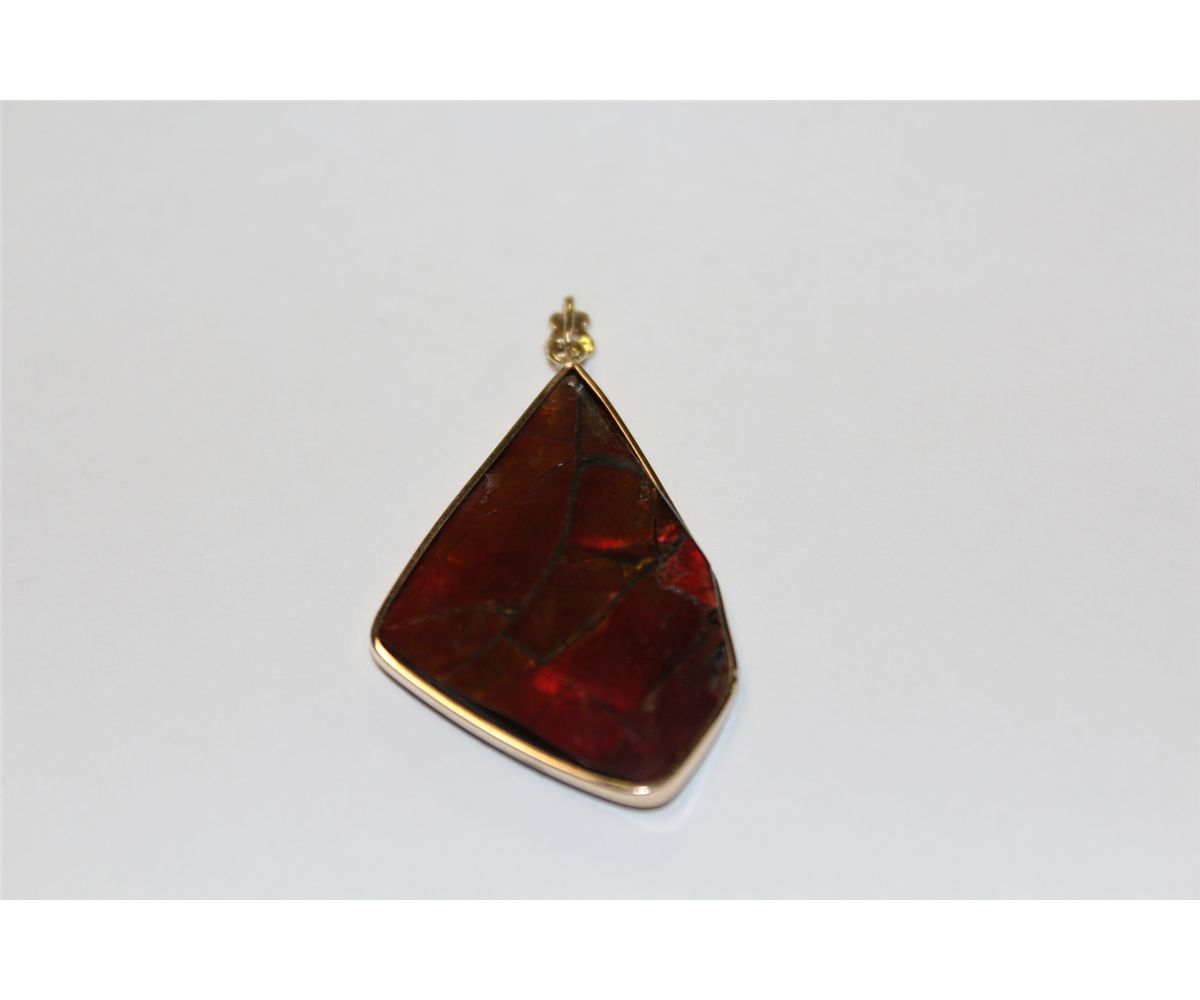 14 KT. YELLOW GOLD NATURAL AMMOLITE PENDANT BEZEL SET WITH A MODIFIED PEAR SHAPED AMMOLITE. REPLACEMENT VALUE: $600