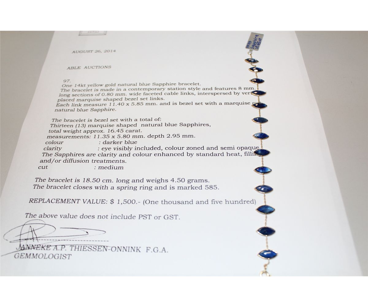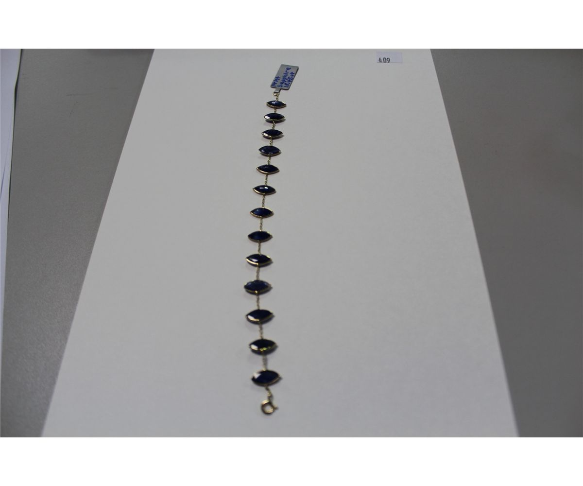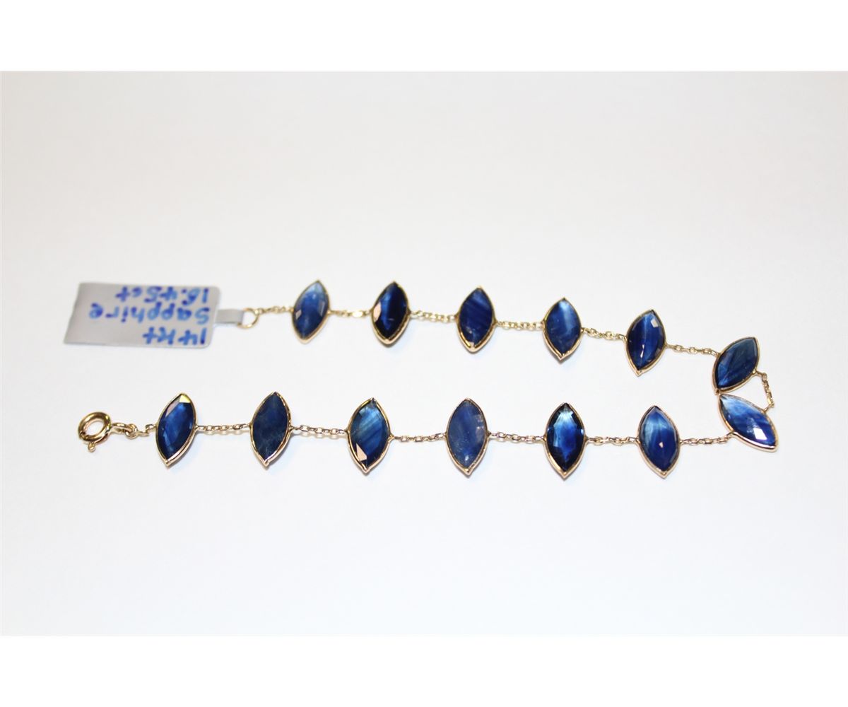 14 KT. YELLOW GOLD NATURAL BLUE SAPPHIRE BRACELET BEZEL SET WITH 13 MARQUISE SHAPED NATURAL BLUE SAPPHIRES APPROX. 16.45 CARATS. REPLACEMENT VALUE: $1500.00
