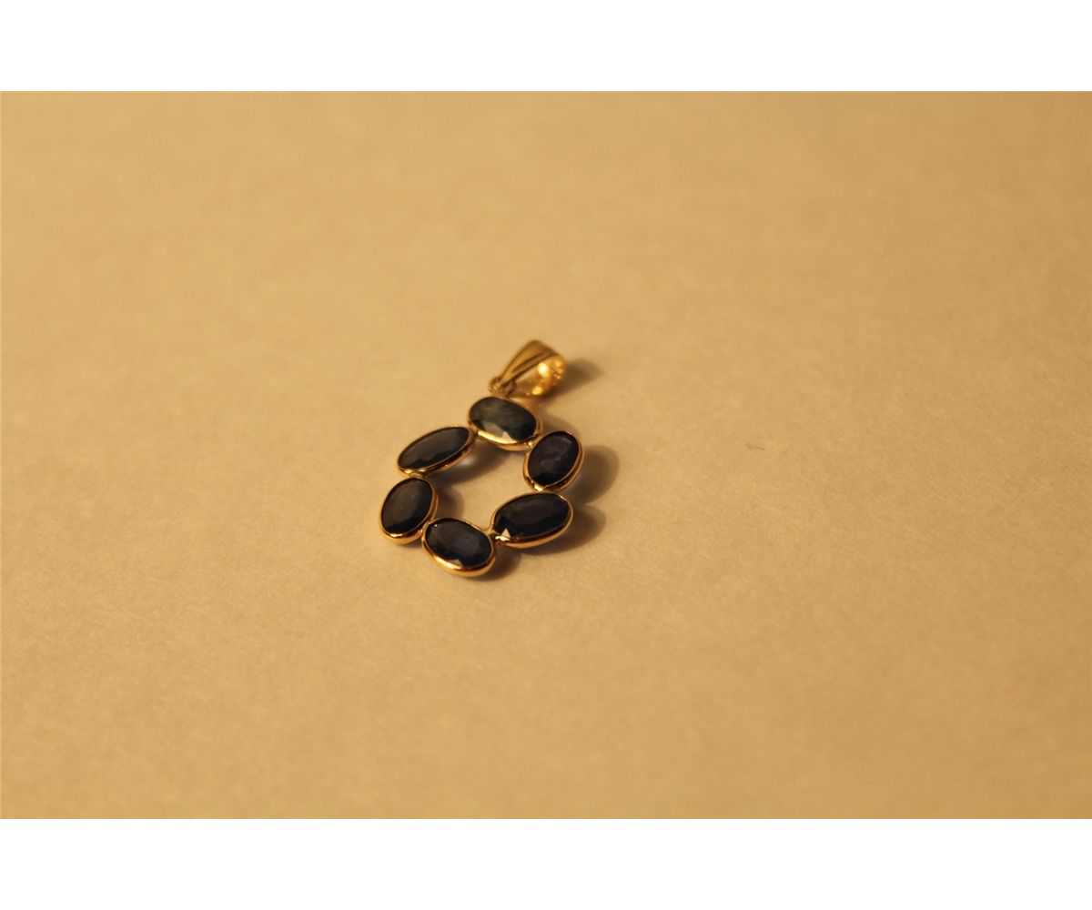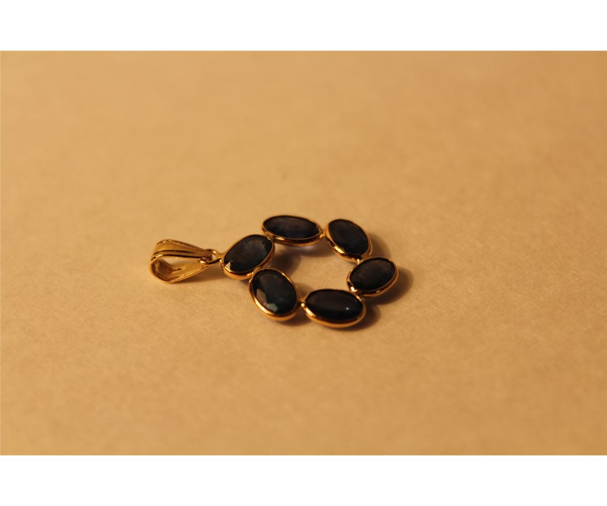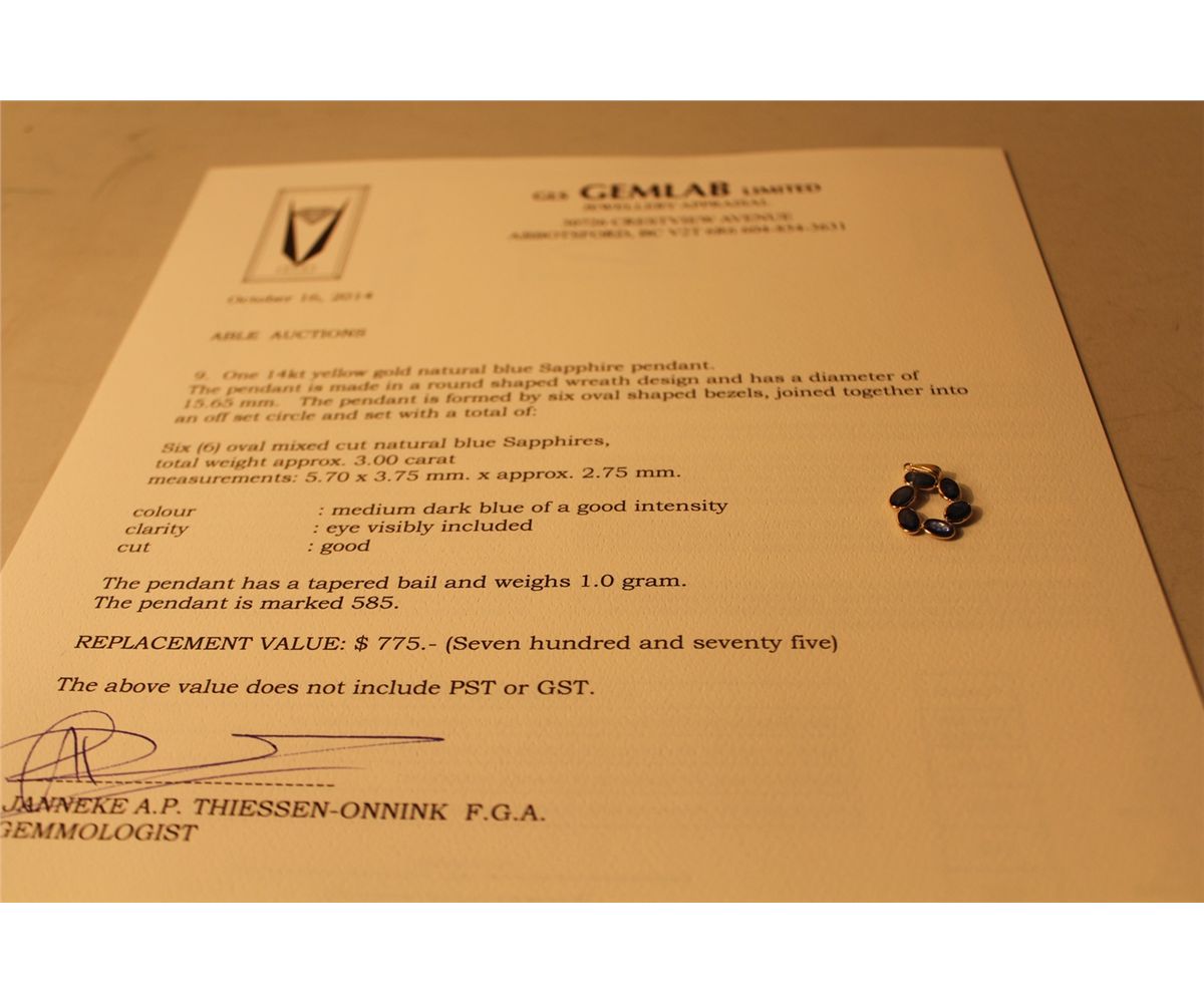 14 KT. YELLOW GOLD NATURAL BLUE SAPPHIRE PENDANT. FORMED WITH 6 OVAL MIXED CUT NATURAL BLUE SAPPHIRES WEIGHING APPROX. 3.00 CARATS. PENDANT IS MARKED 858. REPLACEMENT VALUE $775.00
