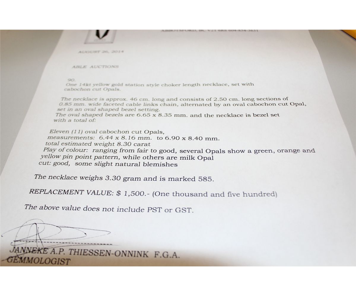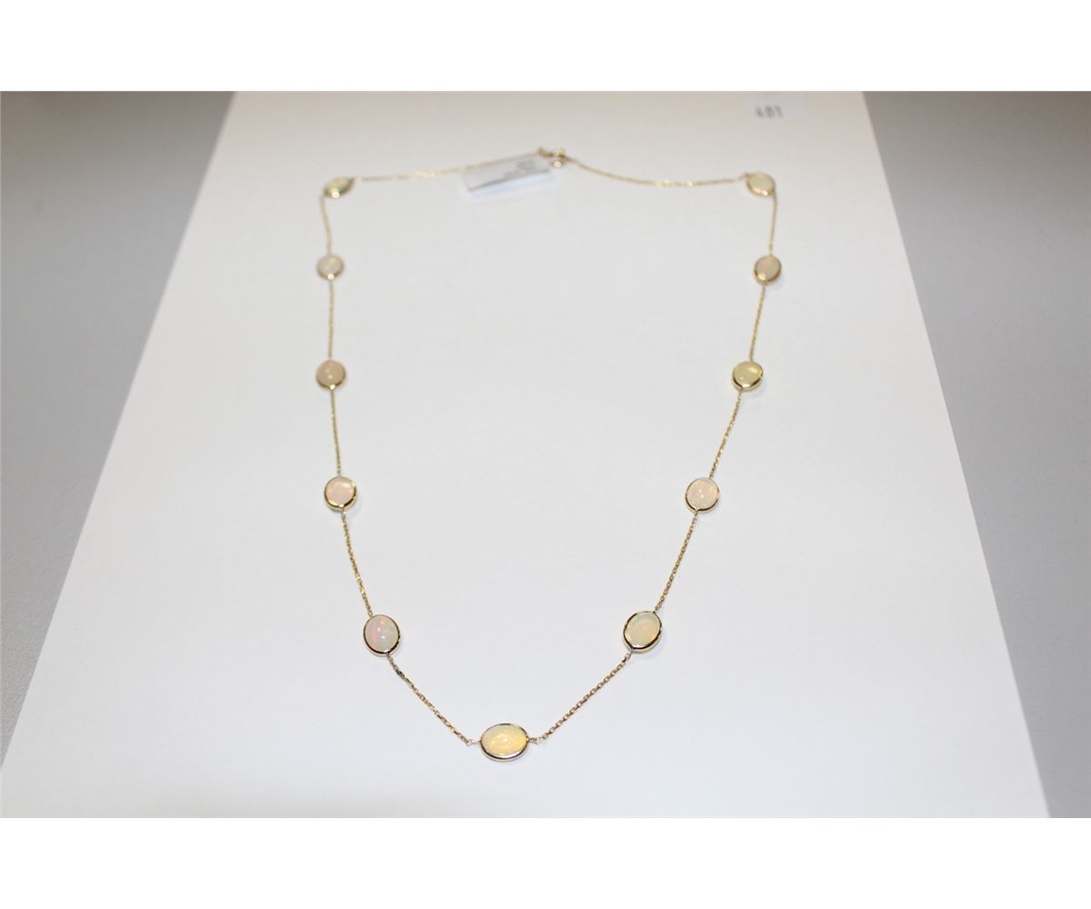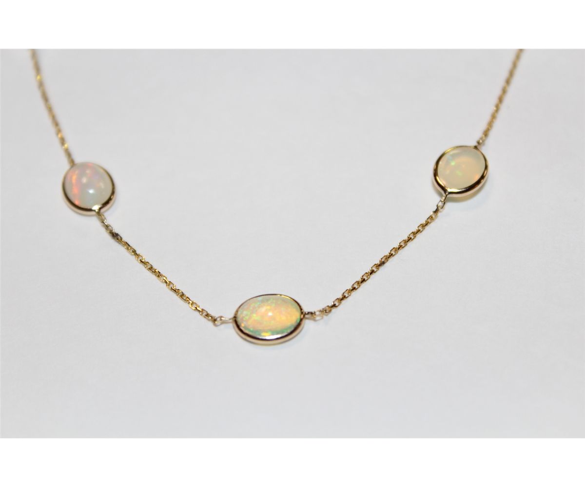 14 KT. YELLOW GOLD STATION STYLE CHOKER LENGTH NECKLACE BEZEL SET WITH 11 OVAL CABOCHON CUT OPALS APPROX. 8.30 CARATS.  REPLACEMENT VALUE $1500.00