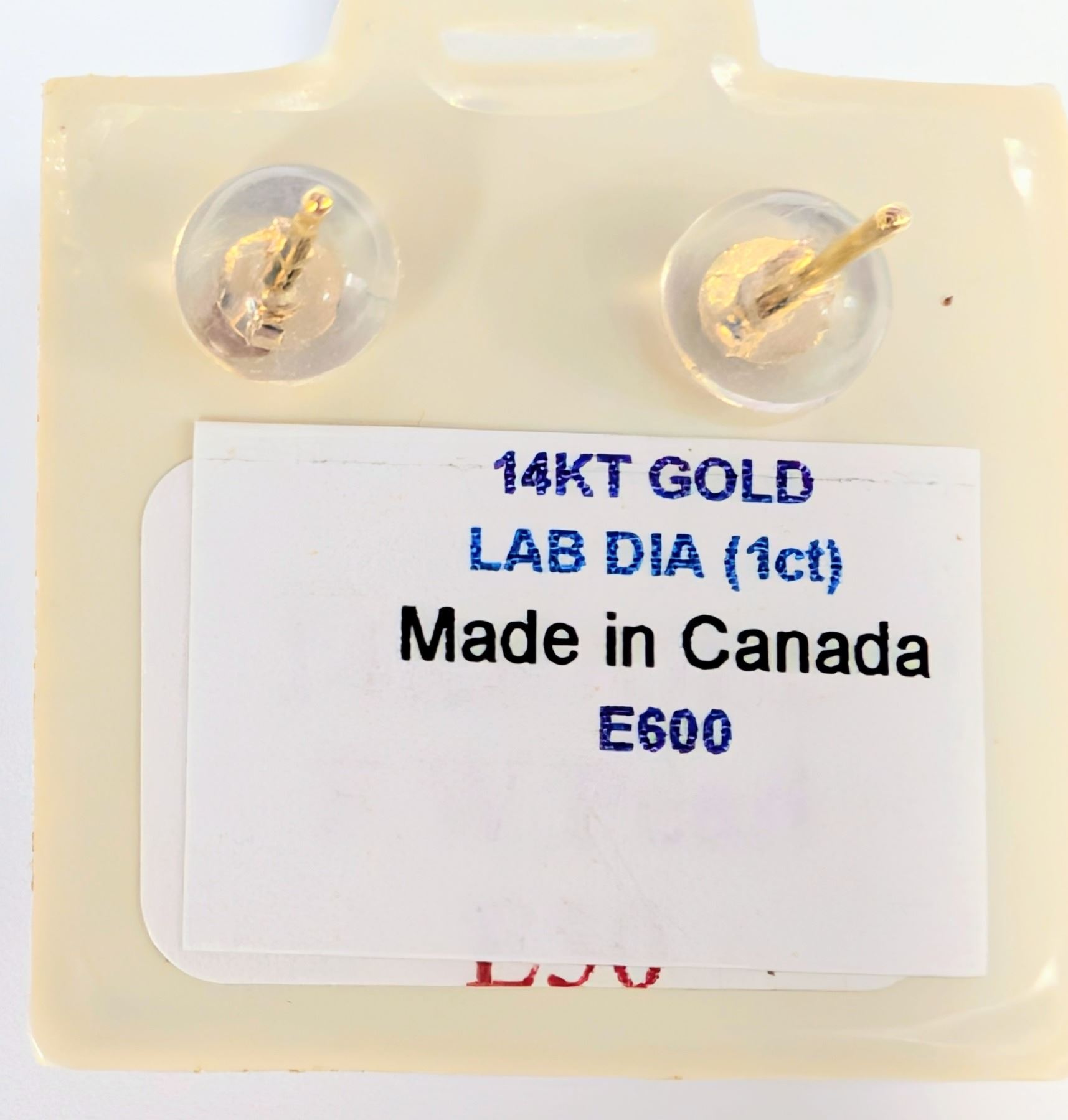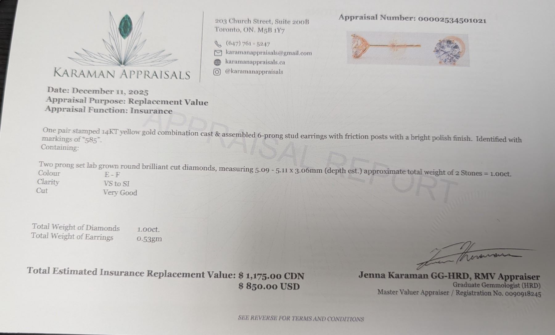 14K(0.53G), LAB DIAMOND (1CT)EARRING, APPRAISED INSURANCE VALUE $1175