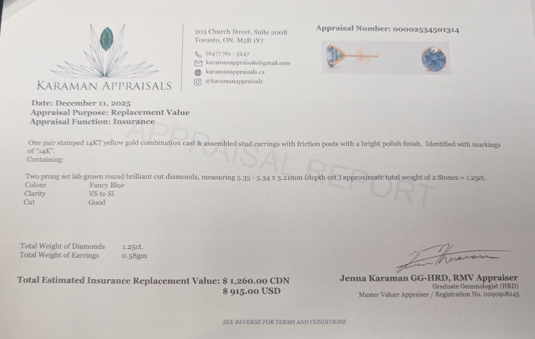 14K(0.58G), BLUE LAB DIAMOND (0.58CT) EARRING, APPRAISED INSURANCE VALUE $1260