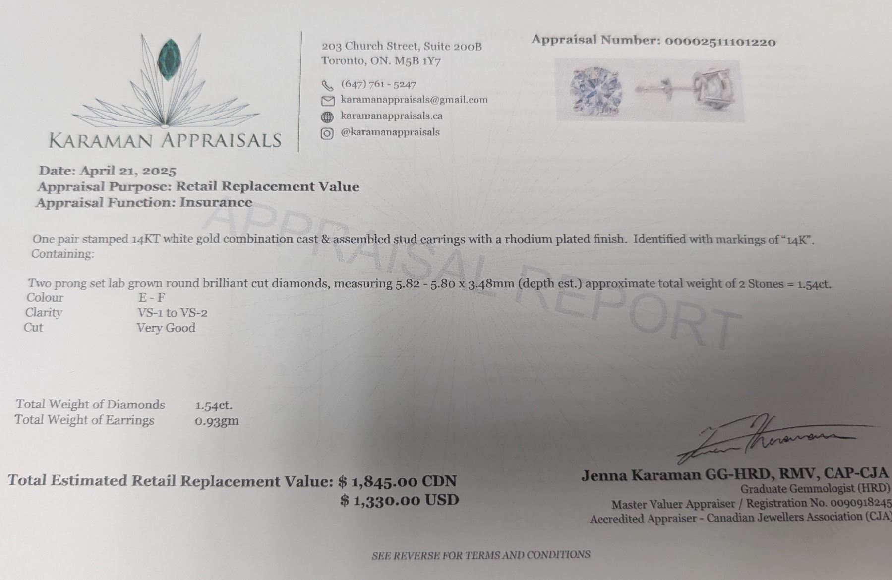 14K(0.93G), (LAB DIAMOND 1.54CT)EARRINGS, APPRAISED INSURANCE VALUE $1845