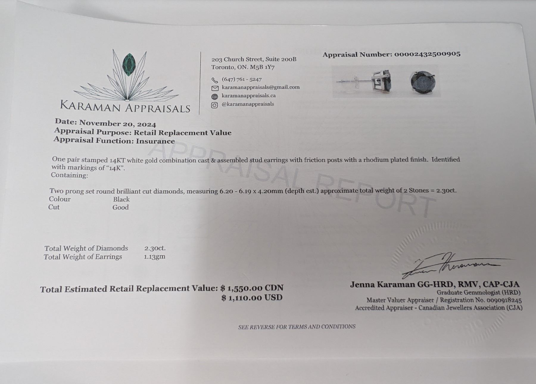 14K (1.13G) BLACK DIAMOND (2.3CT) EARRINGS APPRAISED INSURANCE VALUE $1550