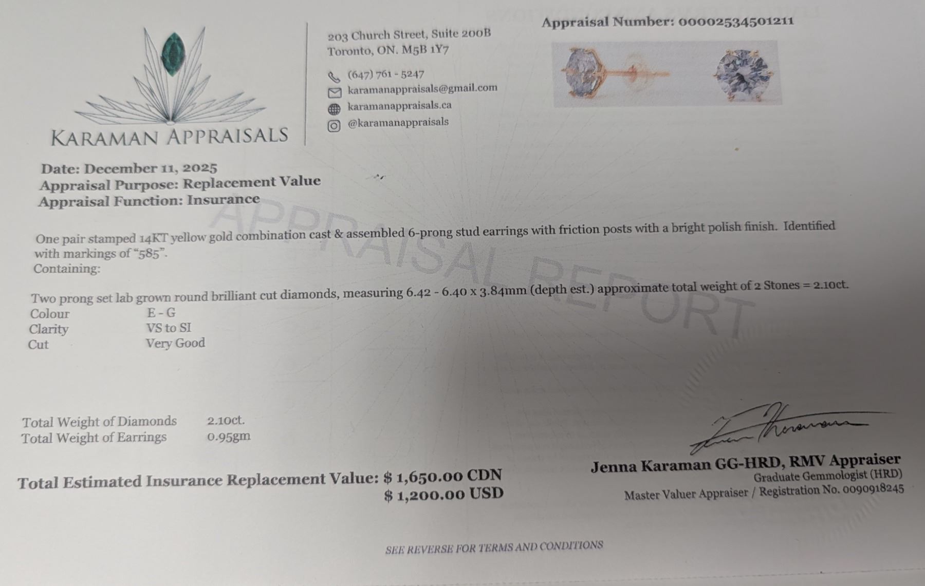 14K(1.25G), BLACK DIAMOND (1.25CT) EARRING APPRAISED INSURANCE VALUE $1700