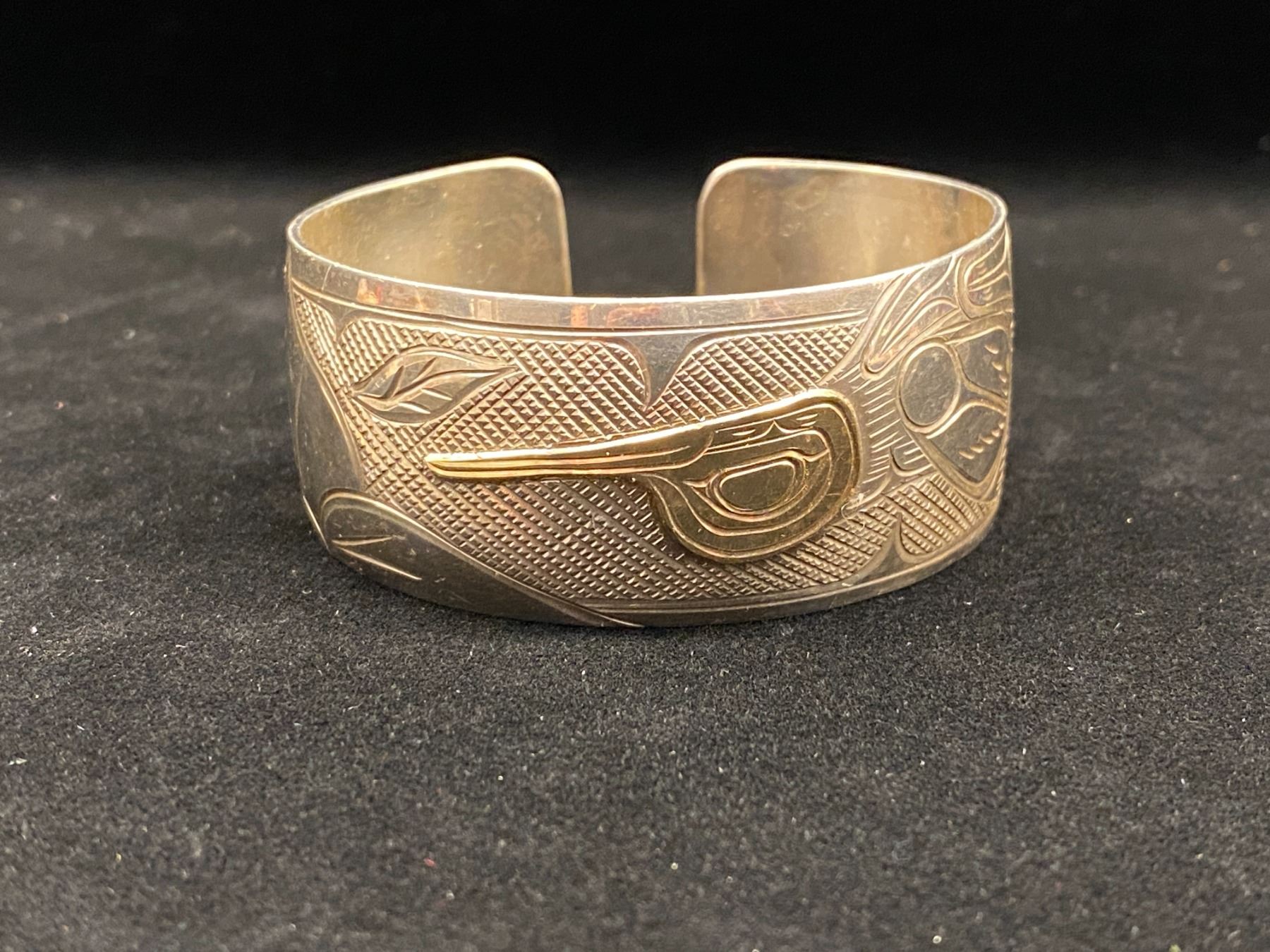 14K AND SILVER BANGLE WITH COASTAL NATIVE MOTIF (39.2G)