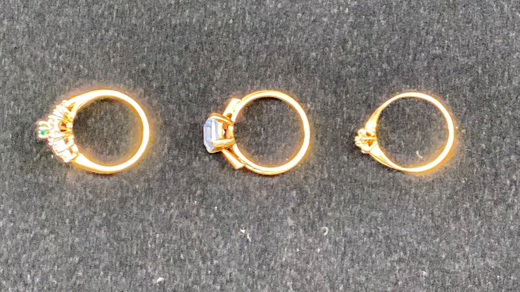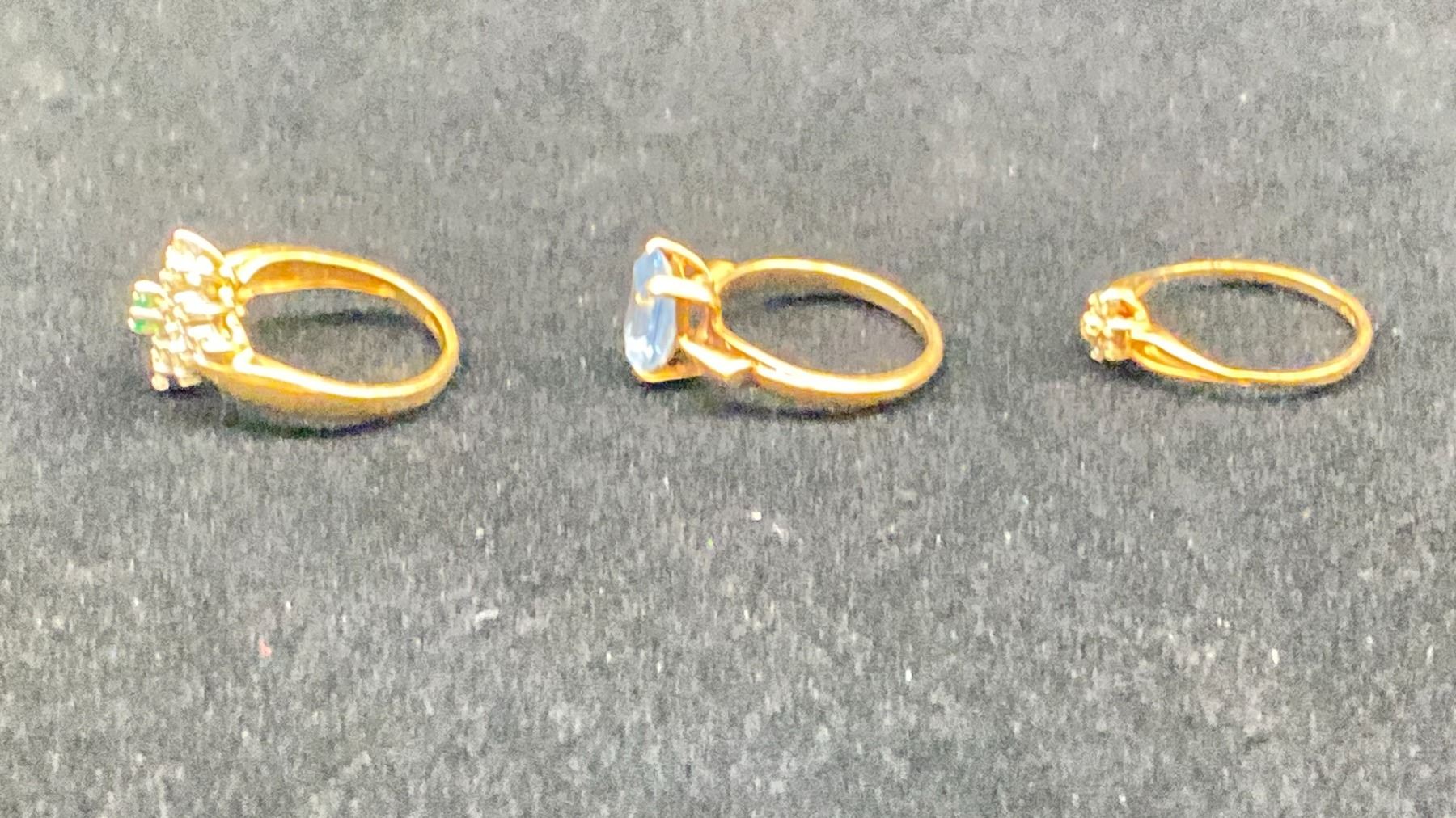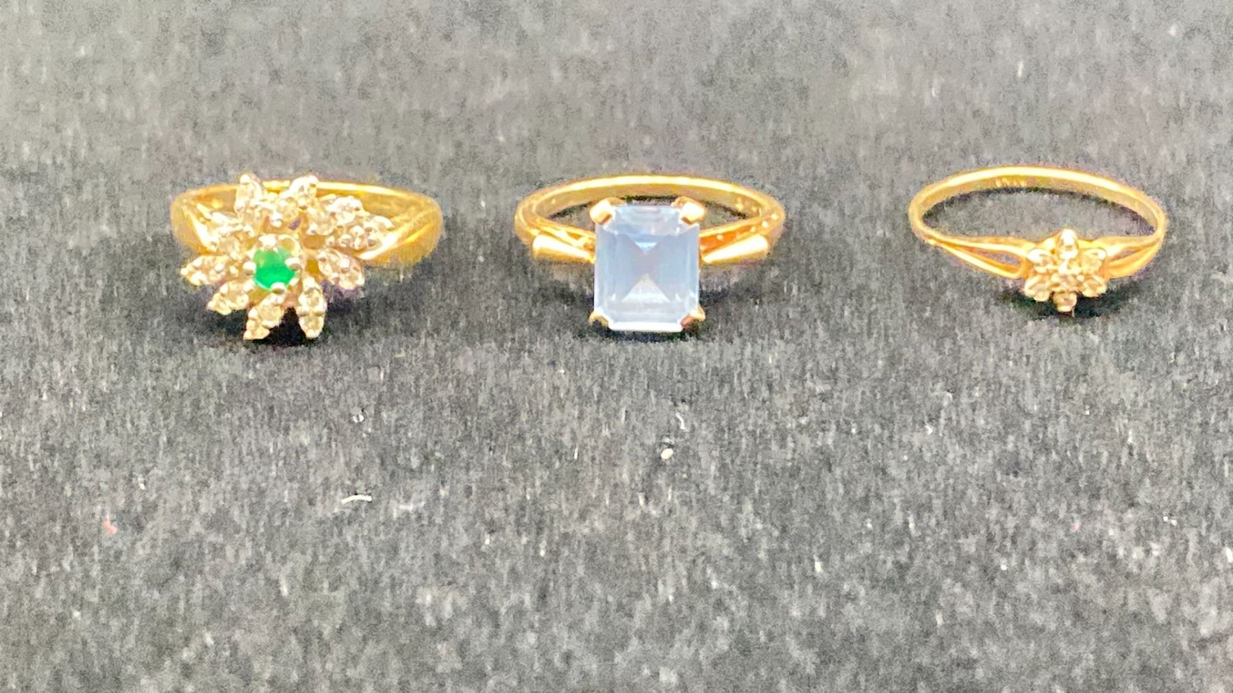 14K LADIES CLUSTER RING SET WITH EMERALD AND DIAMONDS, 14K LADIES CLUSTER RING SET WITH DIAMONDS & 10K LADIES RING SET WITH BLUE STONES (6.3G TOTAL)