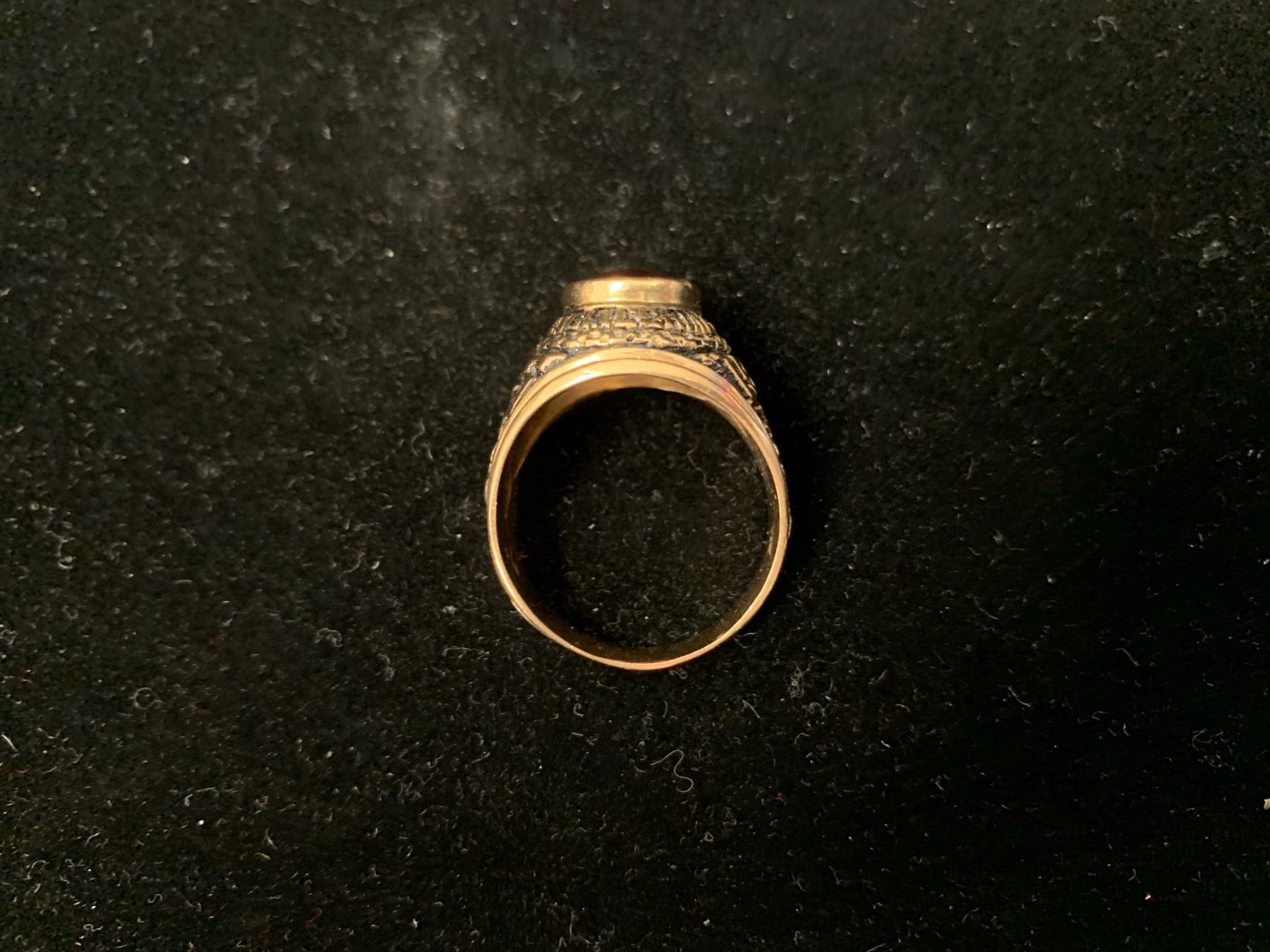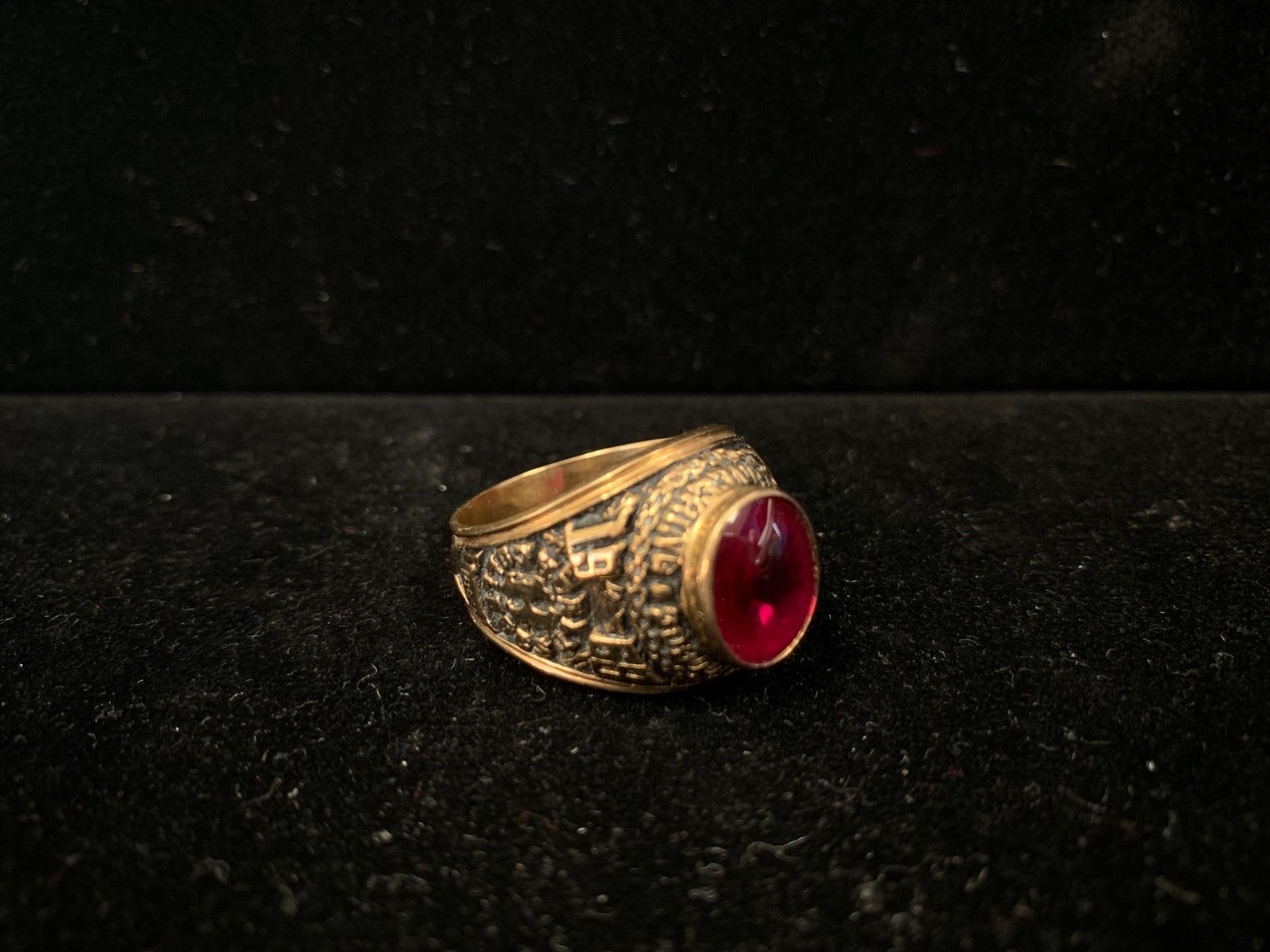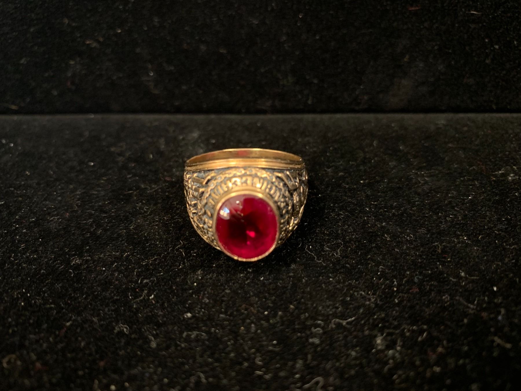 14K MENS COLLEGE RING SET WITH RED STONE (10.7G)
