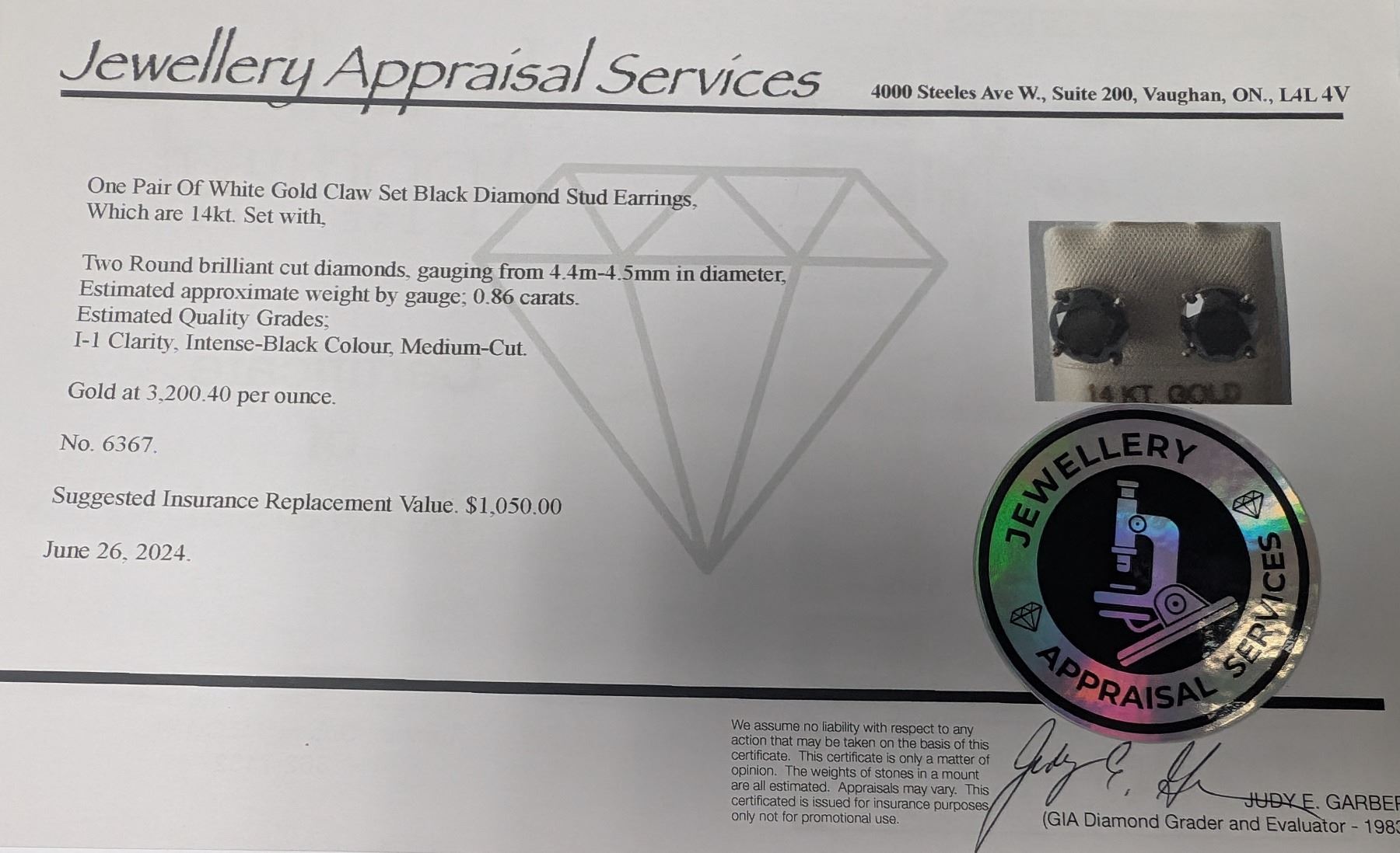 14K(NATURAL BLACK DIAMOND) (0.86CT)EARRINGS, APPRAISED INSURANCE VALUE $1050