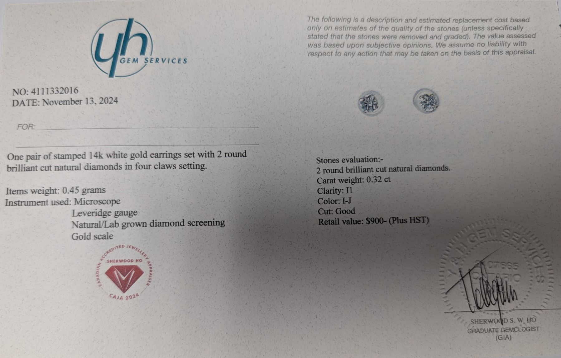 14K WHITE GOLD 0.45G LAB DIAMOND 0.32CT EARRINGS APPRAISED INSURANCE VALUE $900