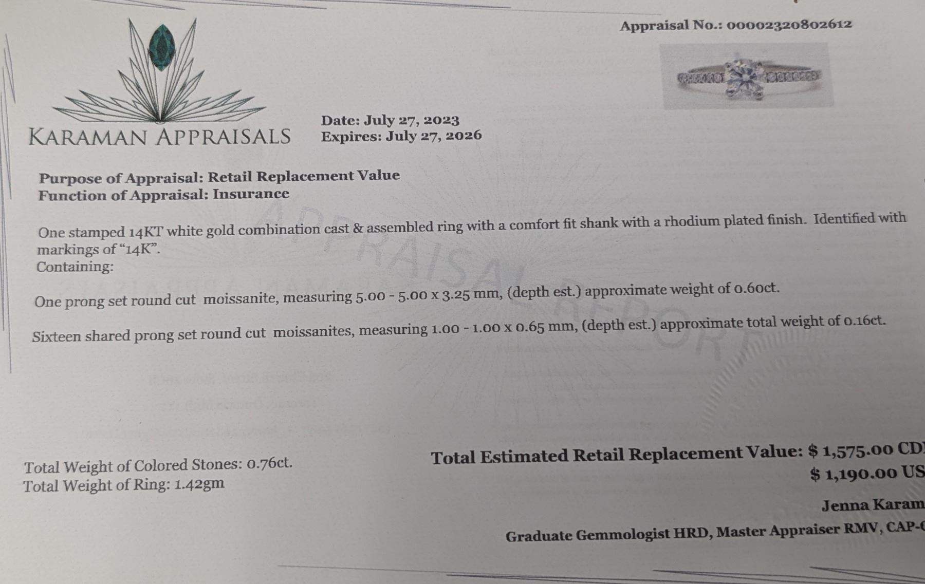 14K WHITE GOLD 1.42G MOISSANITE 0.76CT RING (~SIZE 6.75) APPRAISED INSURANCE VALUE $1575