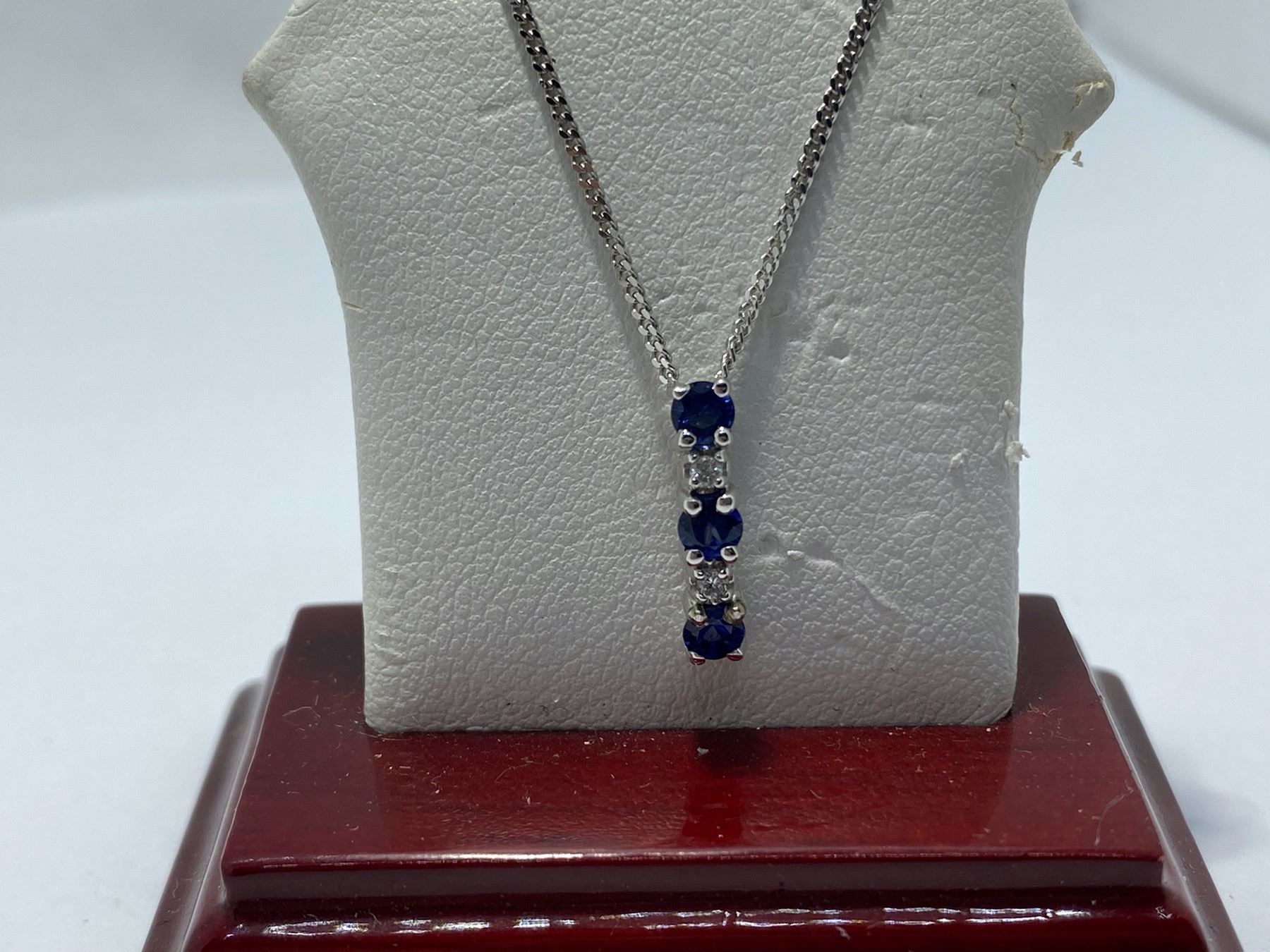 14K WHITE GOLD 17" NECKLACE WITH SAPPHIRE AND DIAMOND PENDANT RETAIL 895.00
