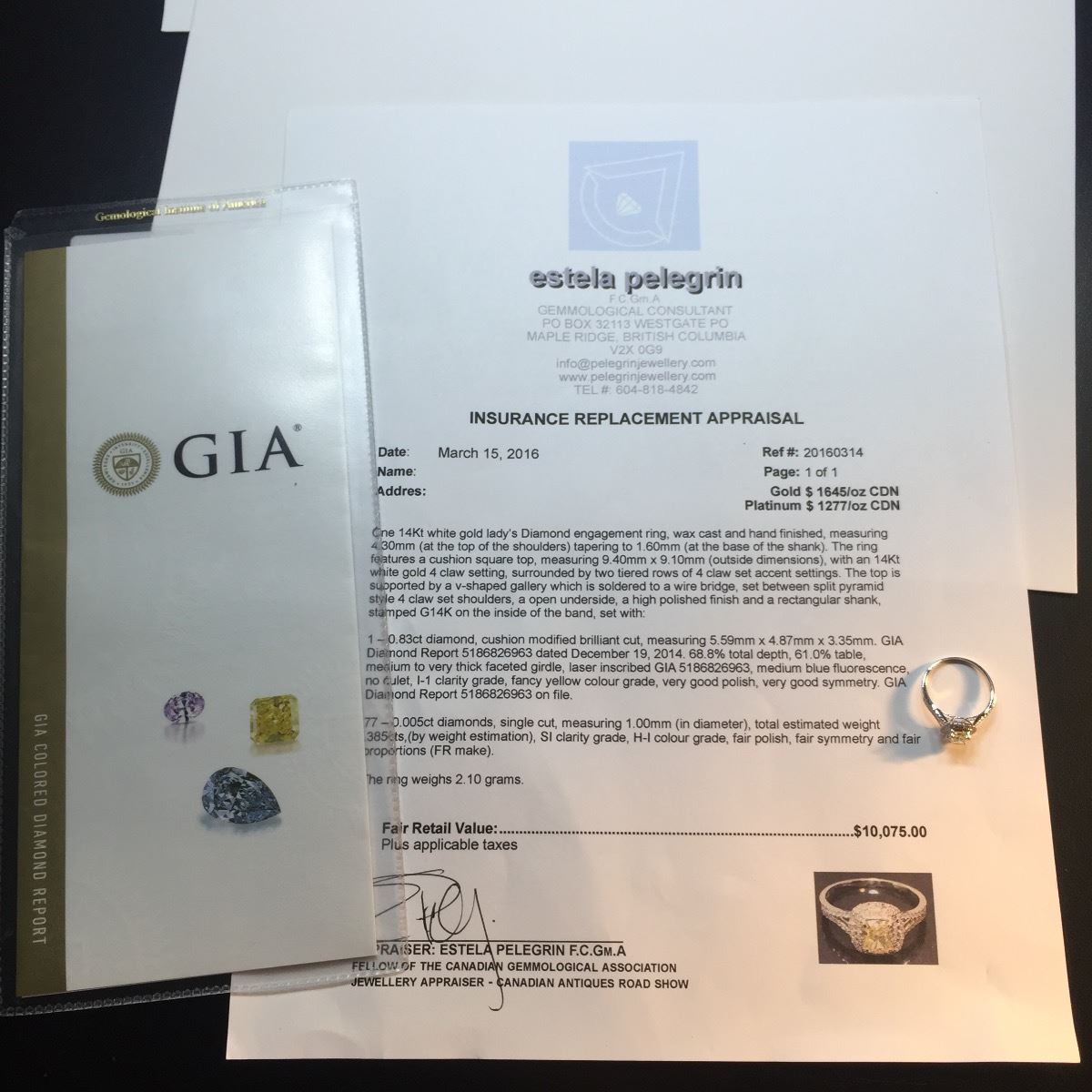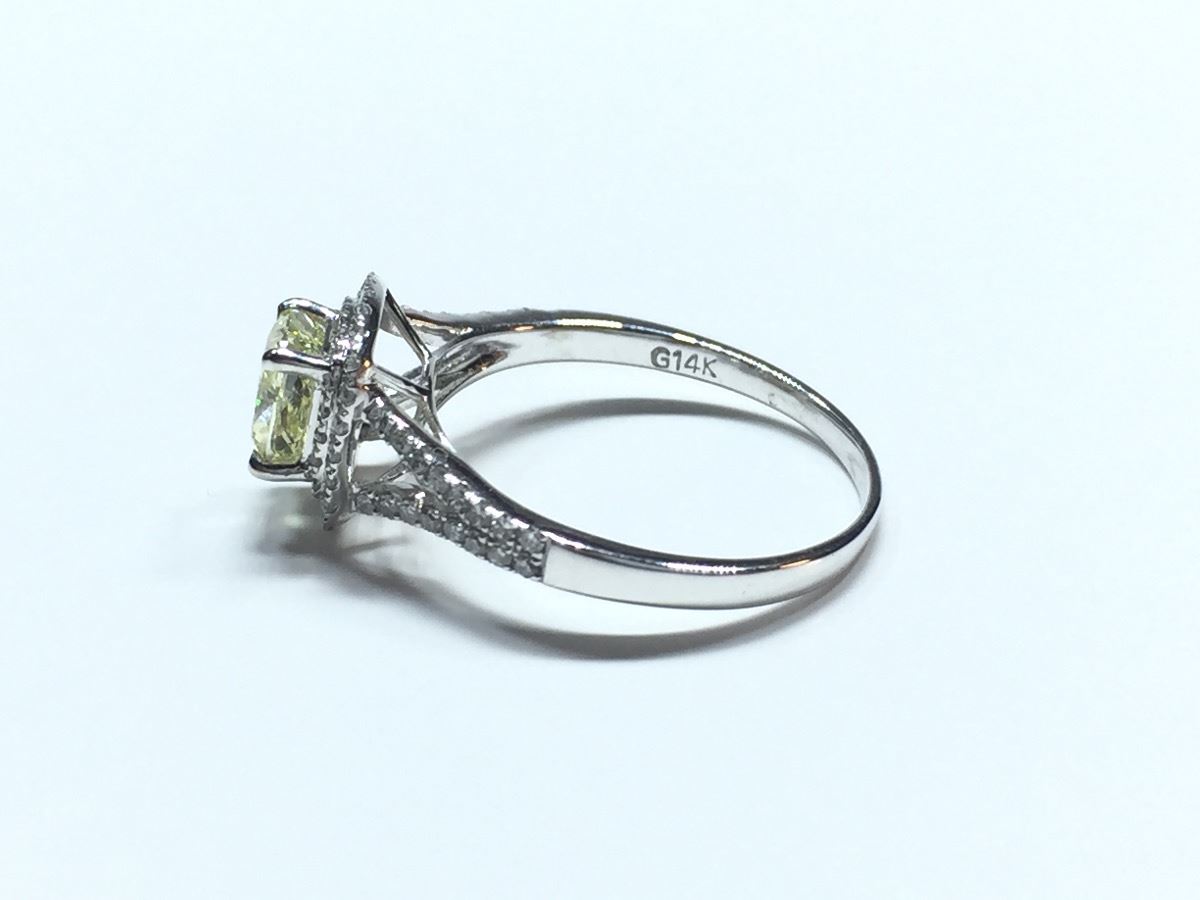 14K WHITE GOLD DIAMOND RING W/GIA 0.83 I-1 FANCY YELLOW CUSHION DIAMOND, APPRAISED VALUE: $10,075