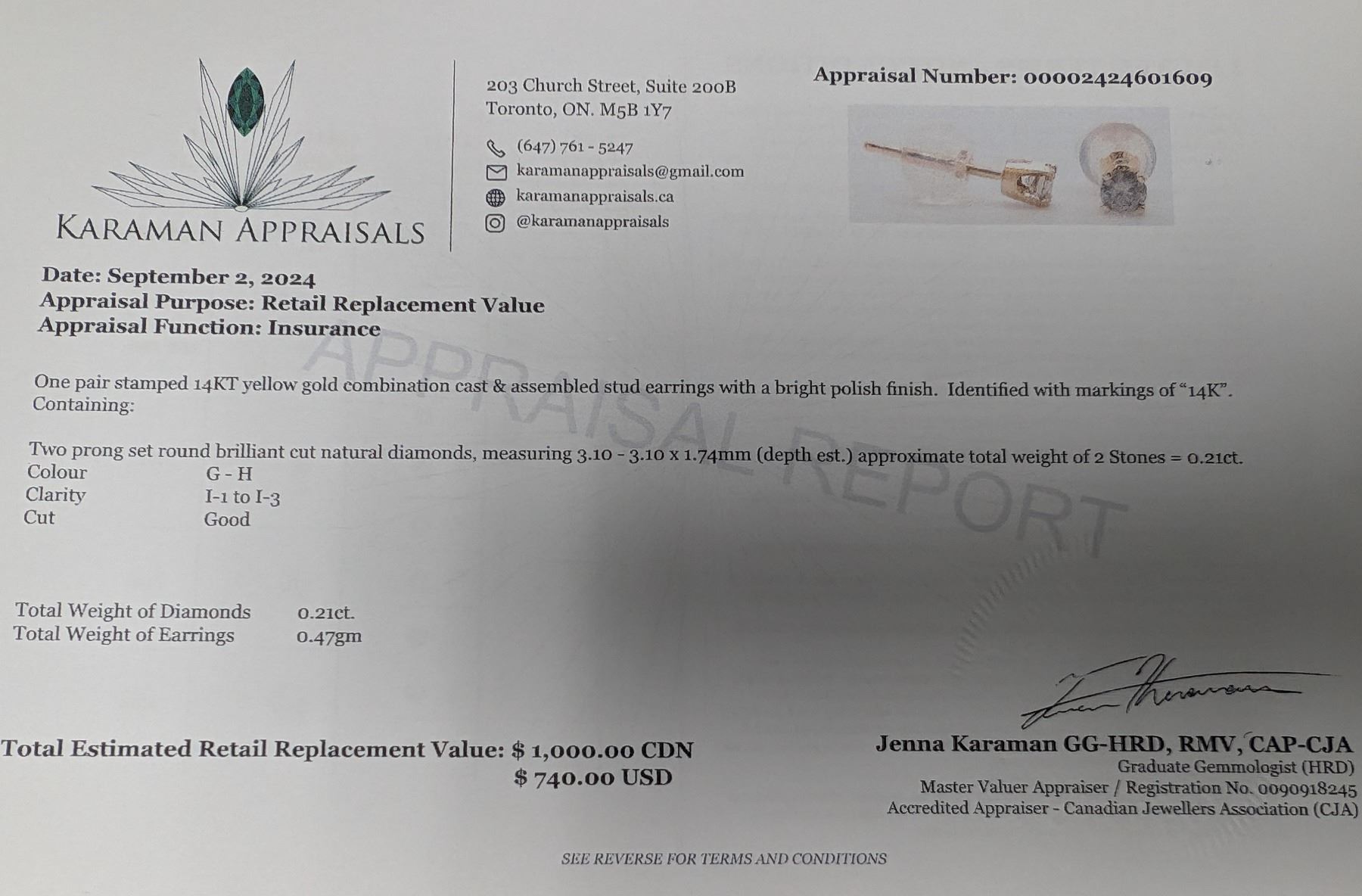 14K YELLOW GOLD 0.47G NATURAL DIAMOND 0.20CT EARRINGS APPRAISED INSURANCE VALUE $1000
