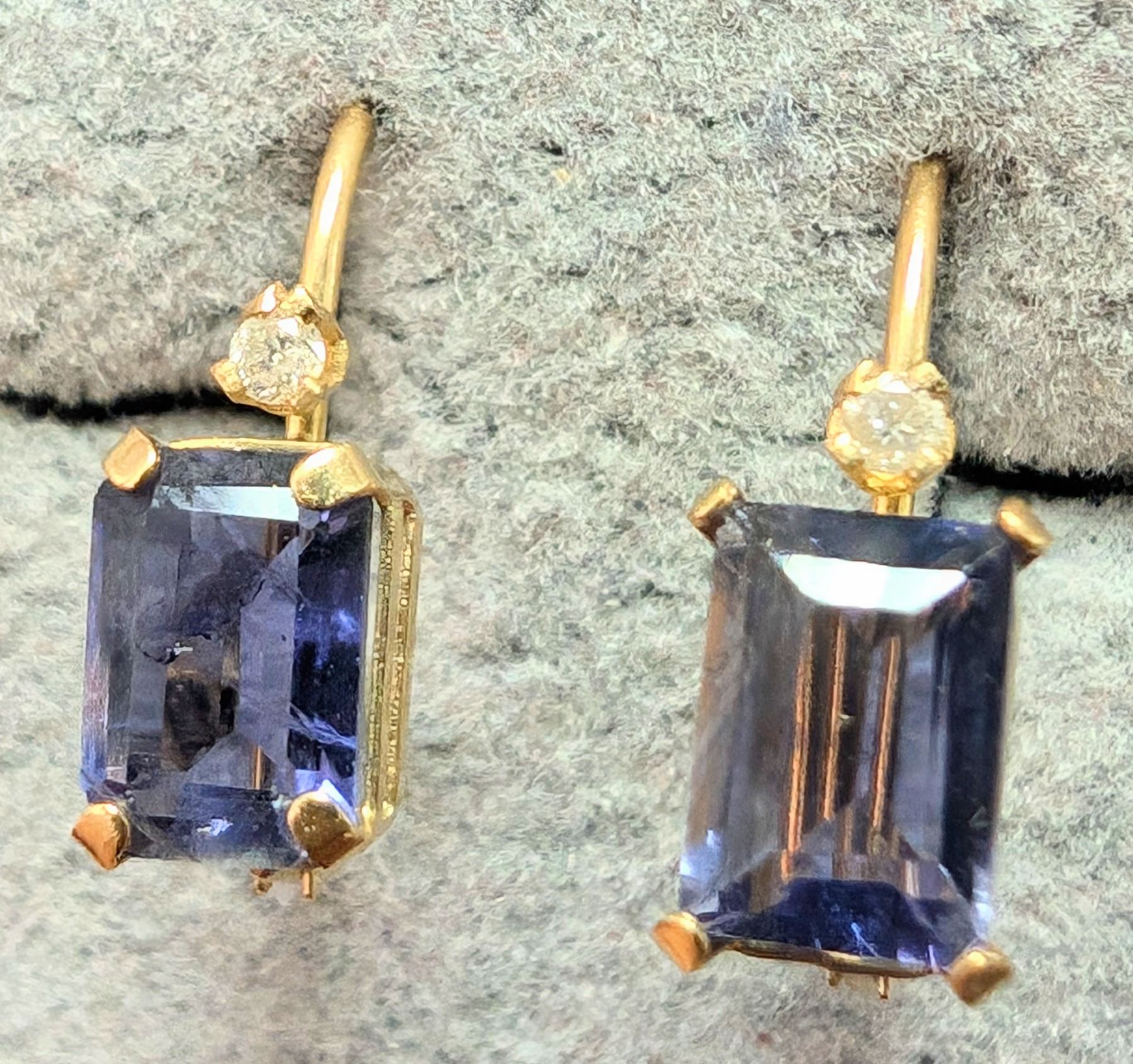 14K YELLOW GOLD IOLITE 1.2CT EARRINGS MADE IN CANADA, SUGGESTED RETAIL VALUE $500