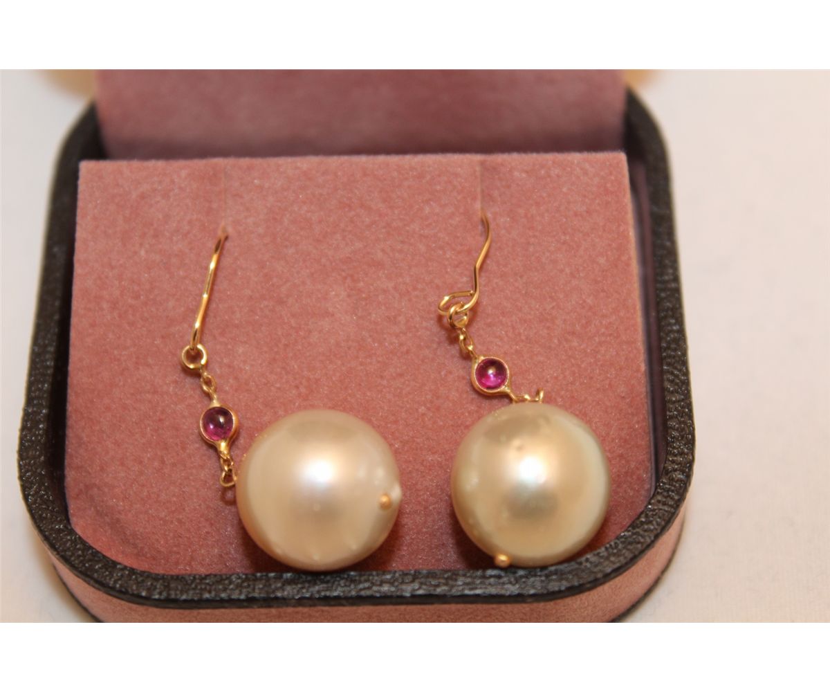 14KT GOLD RUBELITE PEARL EARRINGS. NATURAL RUBELITE AND SOUTH SEA PEARL, MED LUSTER, MODERATE BLEMISHES. INCL. GEMOLOGIST APPRAISAL