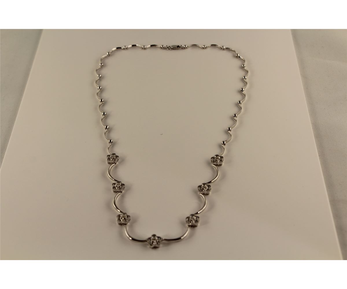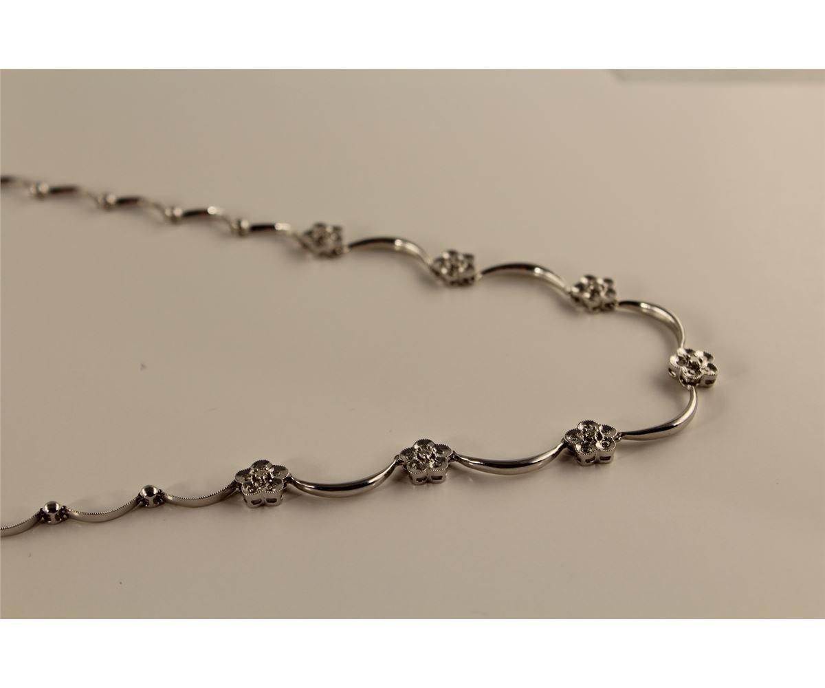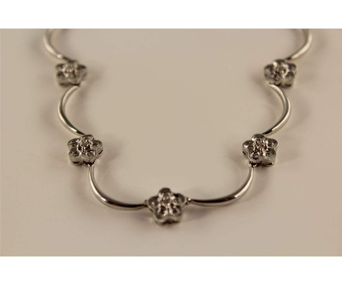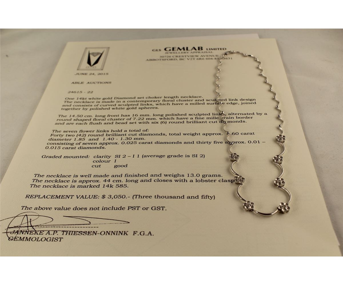 14KT WHITE GOLD DIAMOND SET CHOKER LENGTH NECKLACE IN A FLORAL CLUSTER DESIGN.  HOLDS A  TOTAL OF 42 ROUND BRILLIANT CUT DIAMONDS APPROX. 0.60 CARATS CONSISTING OF APPROX. 00.25 CARAT DIAMONDS & 35 APPROX. 0.01-00.15 CARAT DIAMONDS.  REPLACEMENT VALUE$3050.00