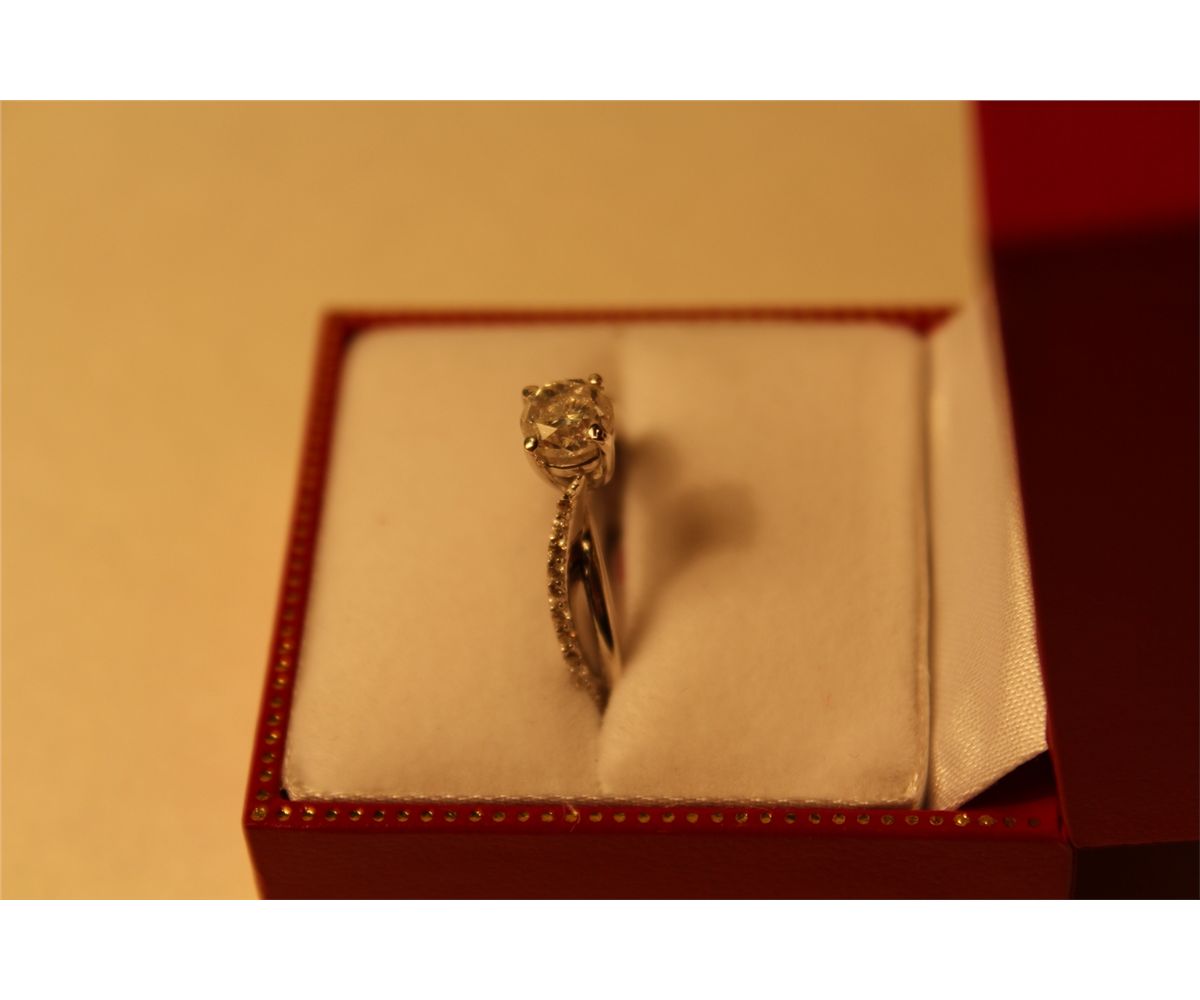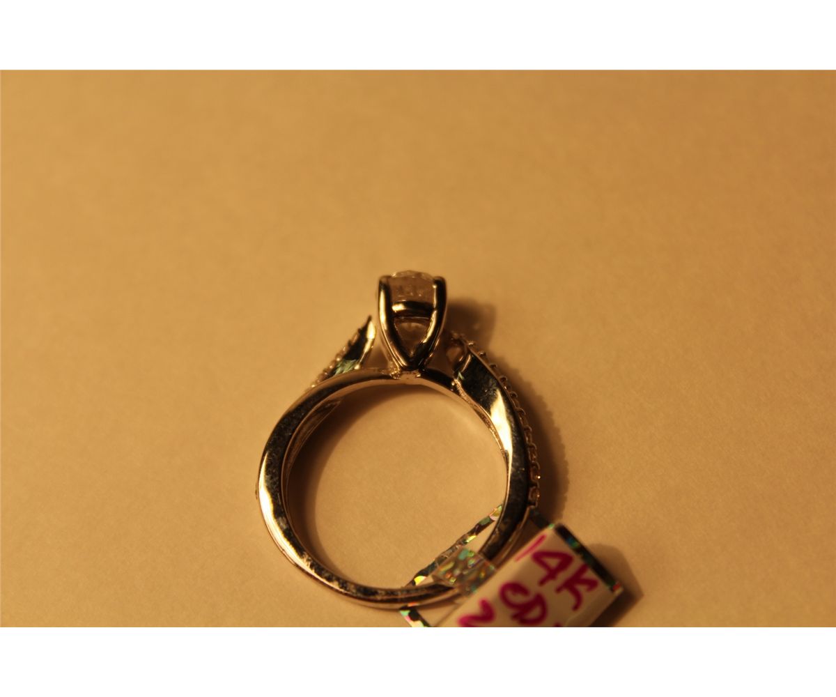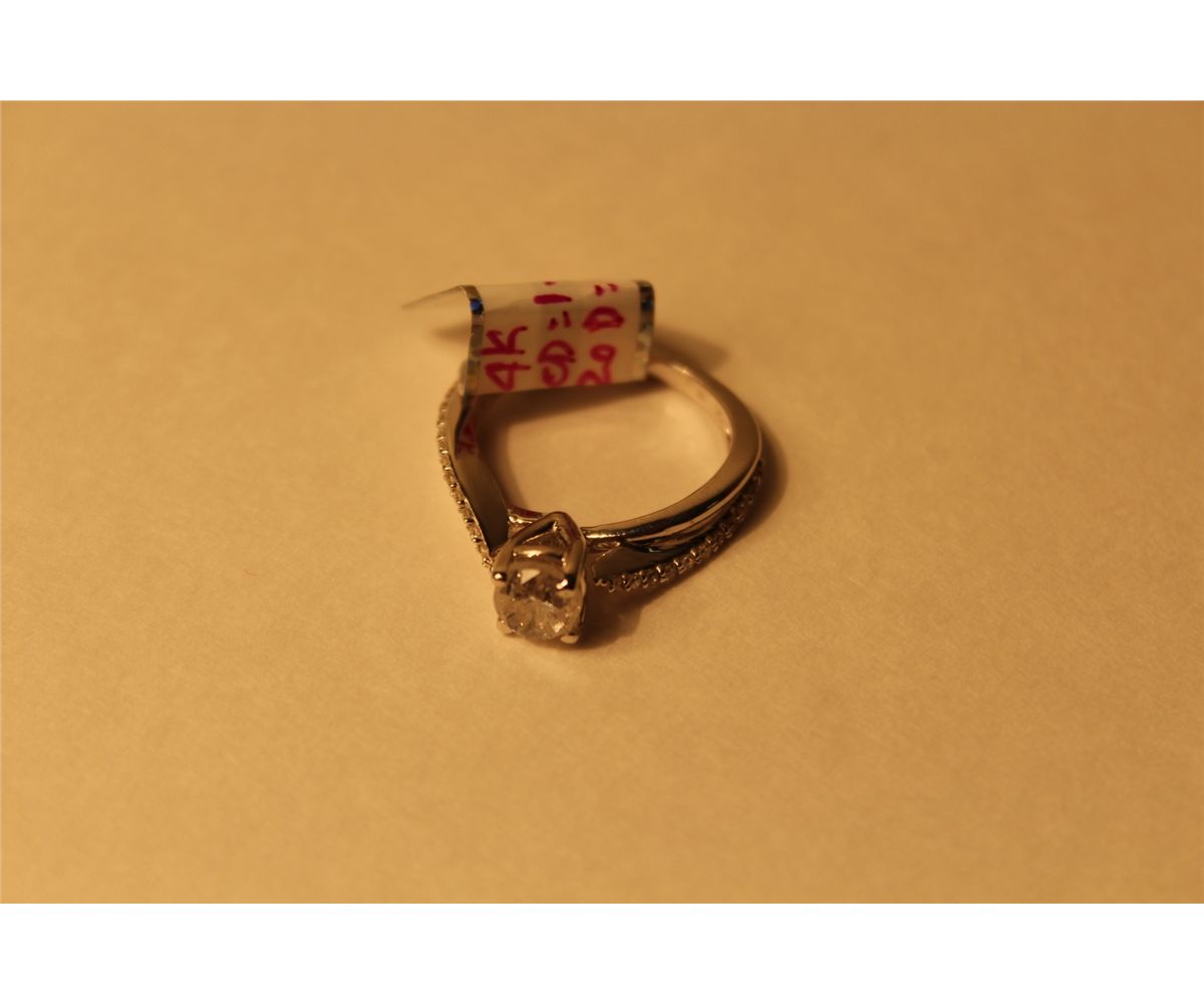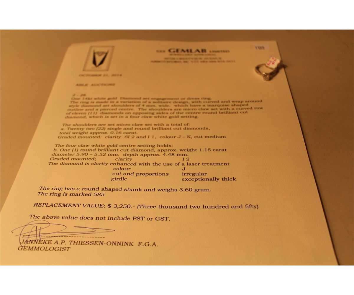 14KT WHITE GOLD DIAMOND SET ENGAGEMENT/DRESS RING CLAW SET 22 SINGLE AND ROUND BRILLIANT CUT DIAMONDS APPROX. 0.16 CARATS AND 1 ROUND BRILLIANT CUT DIAMOND APPROX. 1.15 CARATS. REPLACEMENT VALUE: 3250