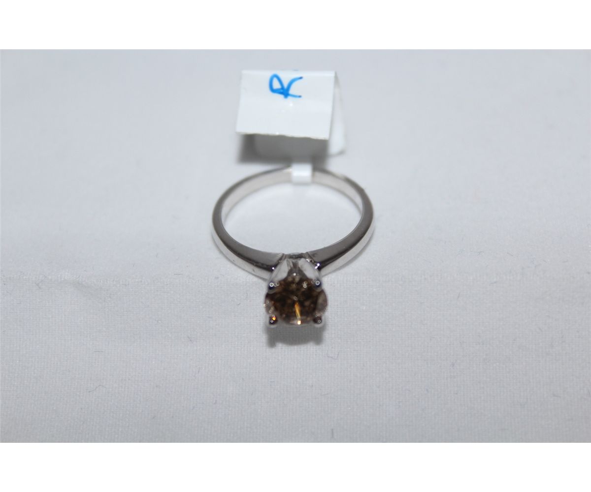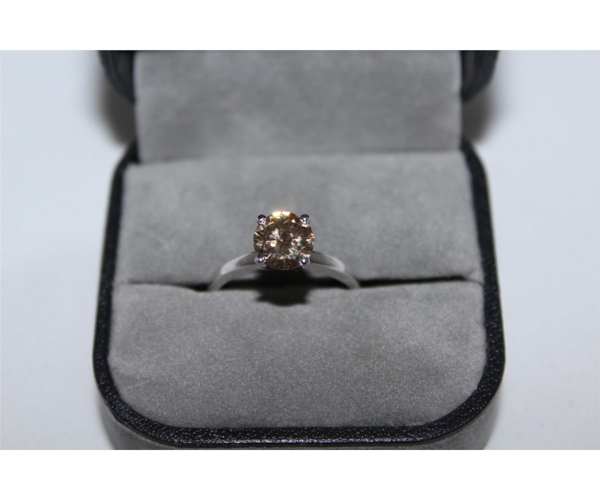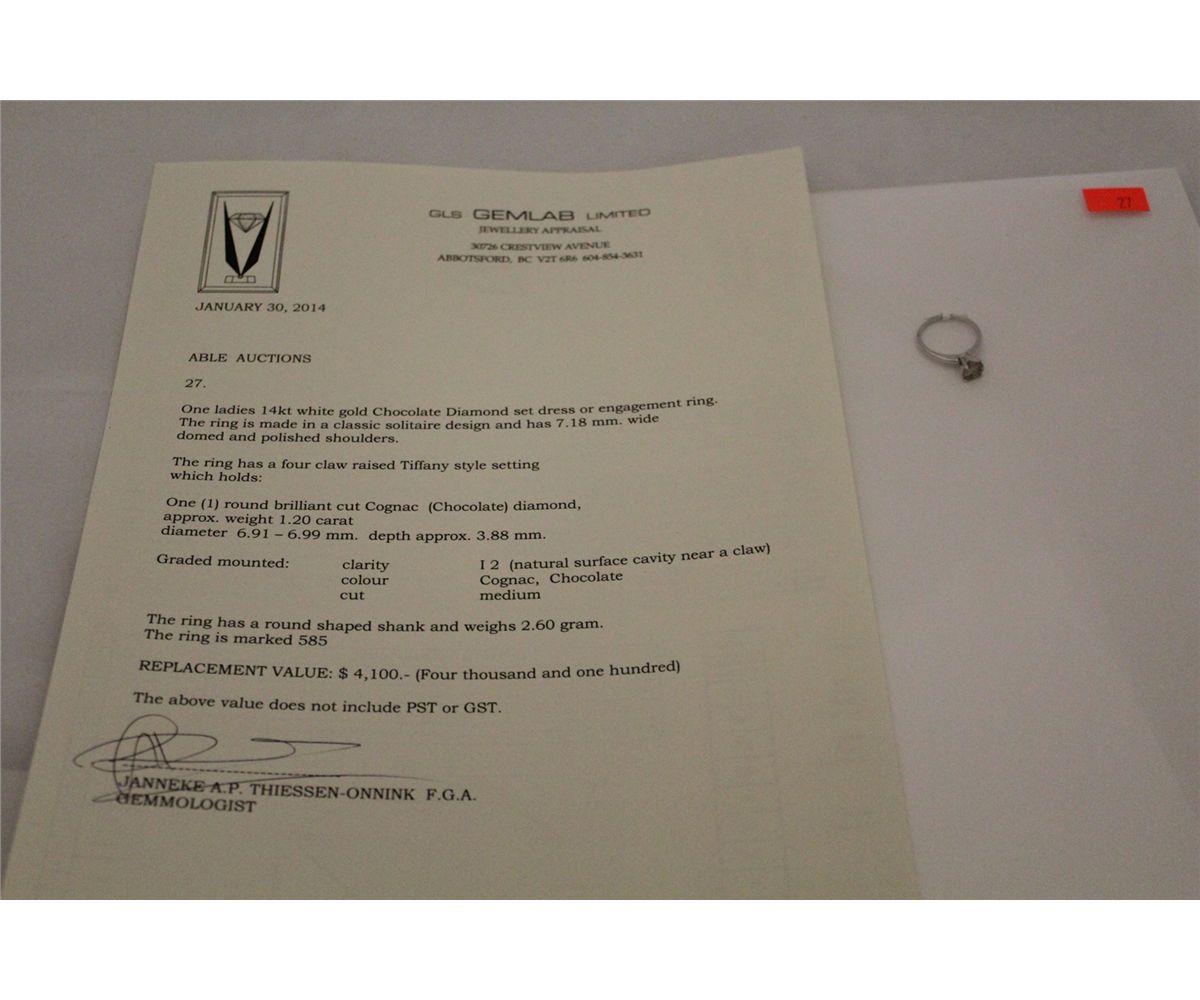 14KT WHITE GOLD LADIES SOLITAIRE DIAMOND RING. STAMPED 14KT. SET WITH APPROX. 1.20 CARAT ROUND BRILLIANT CUT DIAMOND. CLARITY: I-1, COLOUR: COGNAC CUT: GOOD TOTAL WEIGHT OF RING 2.9 GRAMS BY SCALE. INCL. GEMOLOGIST APPRAISAL WITH REPLACEMENT VALUE OF $4,100