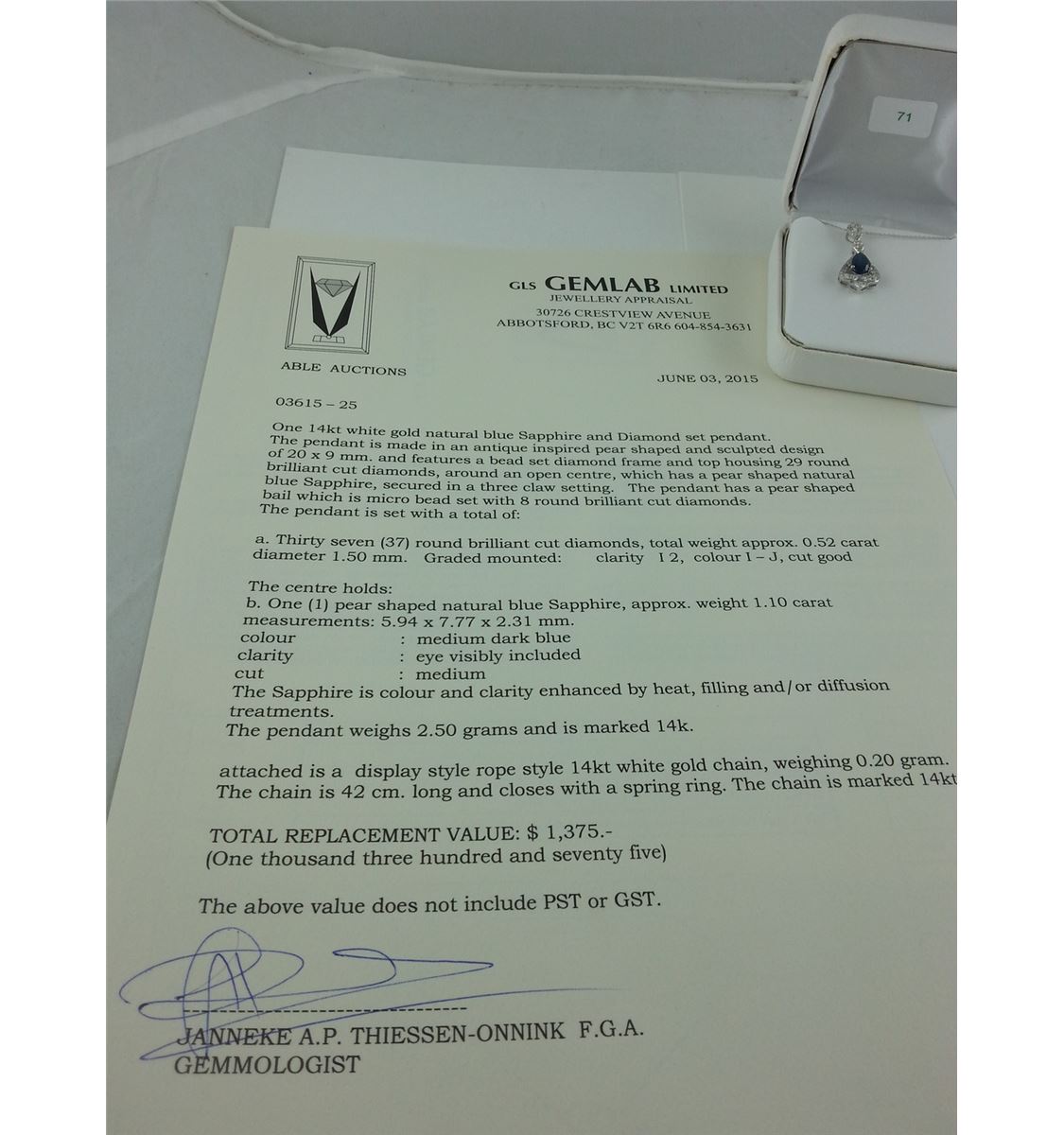 14KT WHITE GOLD NATURAL BLUE SAPPHIRE AND DIAMOND PENDANT SET WITH 37 DIAMONDS, APPROX 0.52CARAT AND ONE SAPPHIRES, APPROX 1.10CARAT REPLACEMENT VALUE $1375