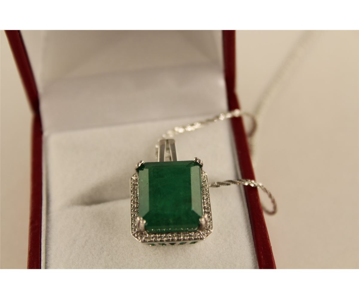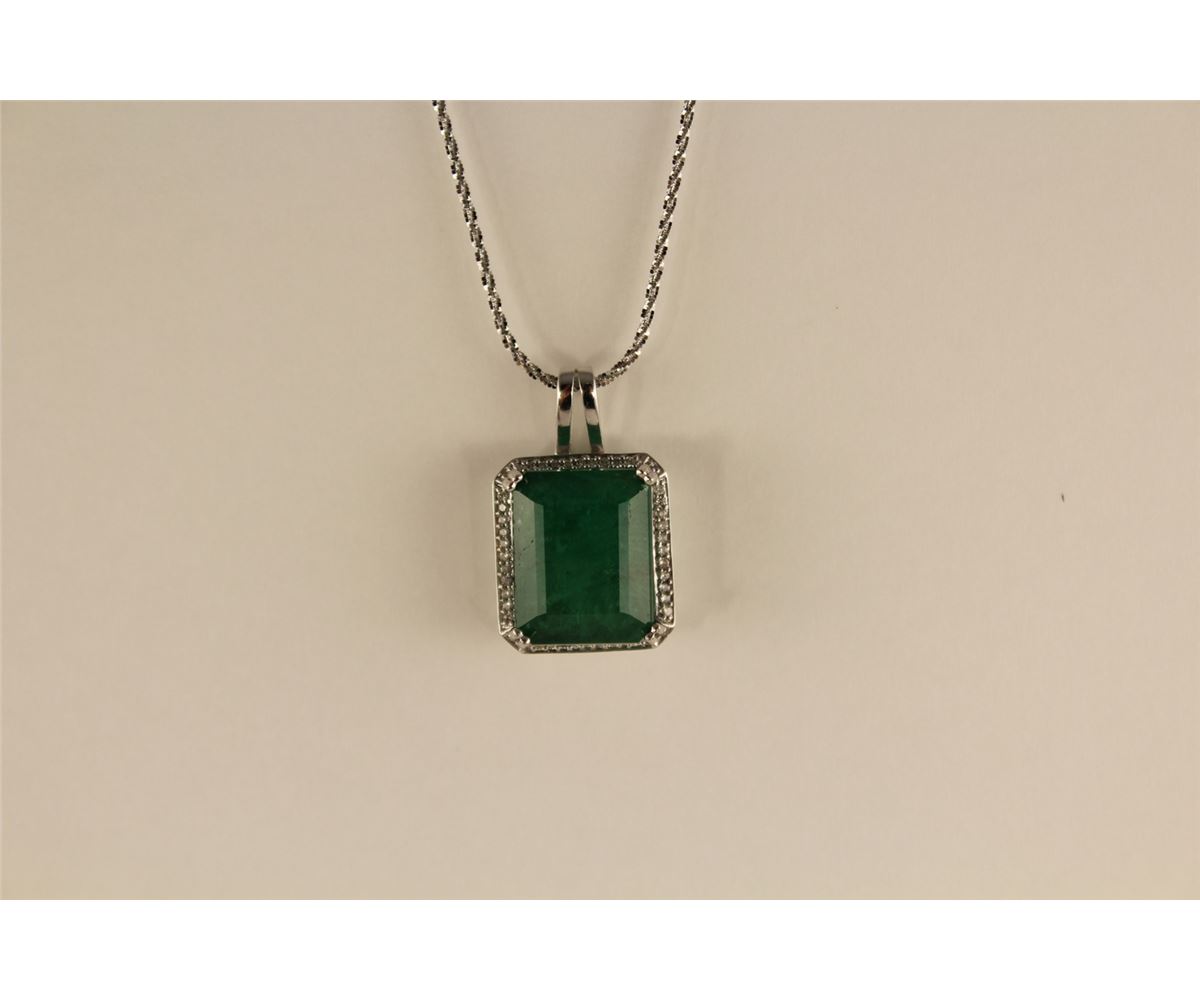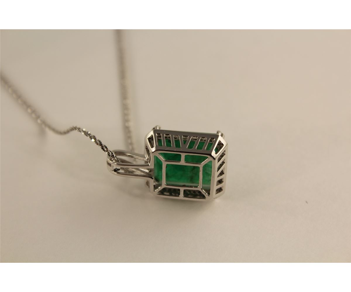14KT WHITE GOLD NATURAL EMERALD & DIAMOND SET PENDANT SET WITH 44 ROUND BRILLIANT CUT DIAMONDS APPROX. 0.19 CARATS AND 1 STEP CUT NATURAL PROMOTIONAL QUALITY EMERALD APPROX. 10.50 CARATS. ATTACHED IS A 14KT WHITE GOLD DIAMOND CUT ROPE-SERPENTINE CHAIN VALUE:$3100.00