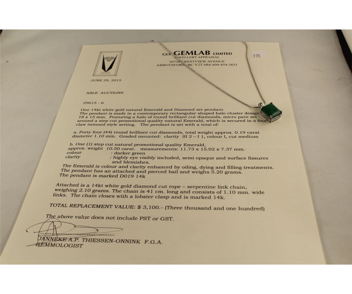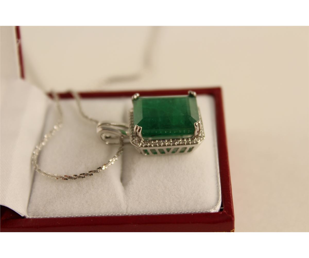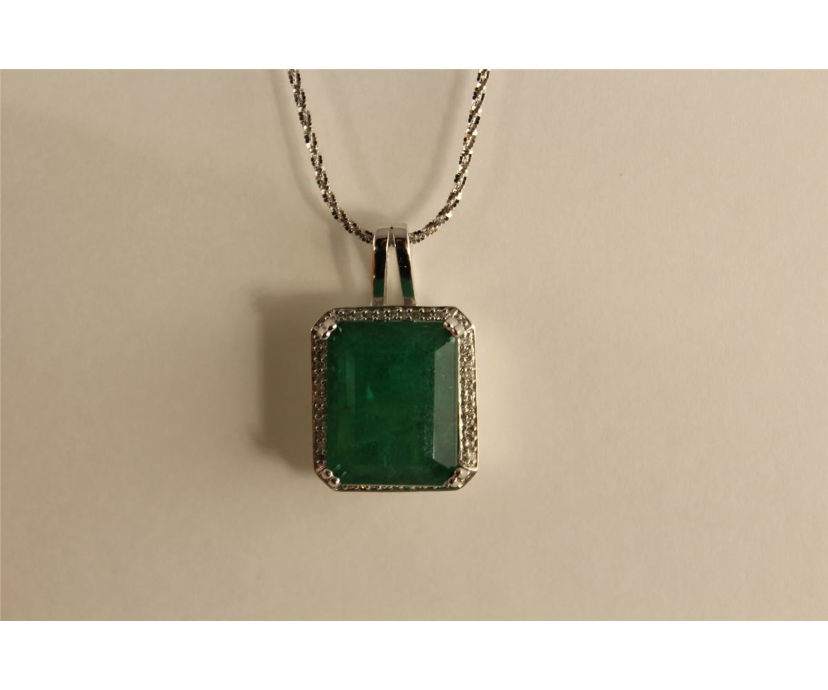 14KT WHITE GOLD NATURAL EMERALD & DIAMOND SET PENDANT SET WITH 44 ROUND BRILLIANT CUT DIAMONDS APPROX. 0.19 CARATS AND 1 STEP CUT NATURAL PROMOTIONAL QUALITY EMERALD APPROX. 10.50 CARATS. ATTACHED IS A 14KT WHITE GOLD DIAMOND CUT ROPE-SERPENTINE CHAIN VALUE:$3100.00