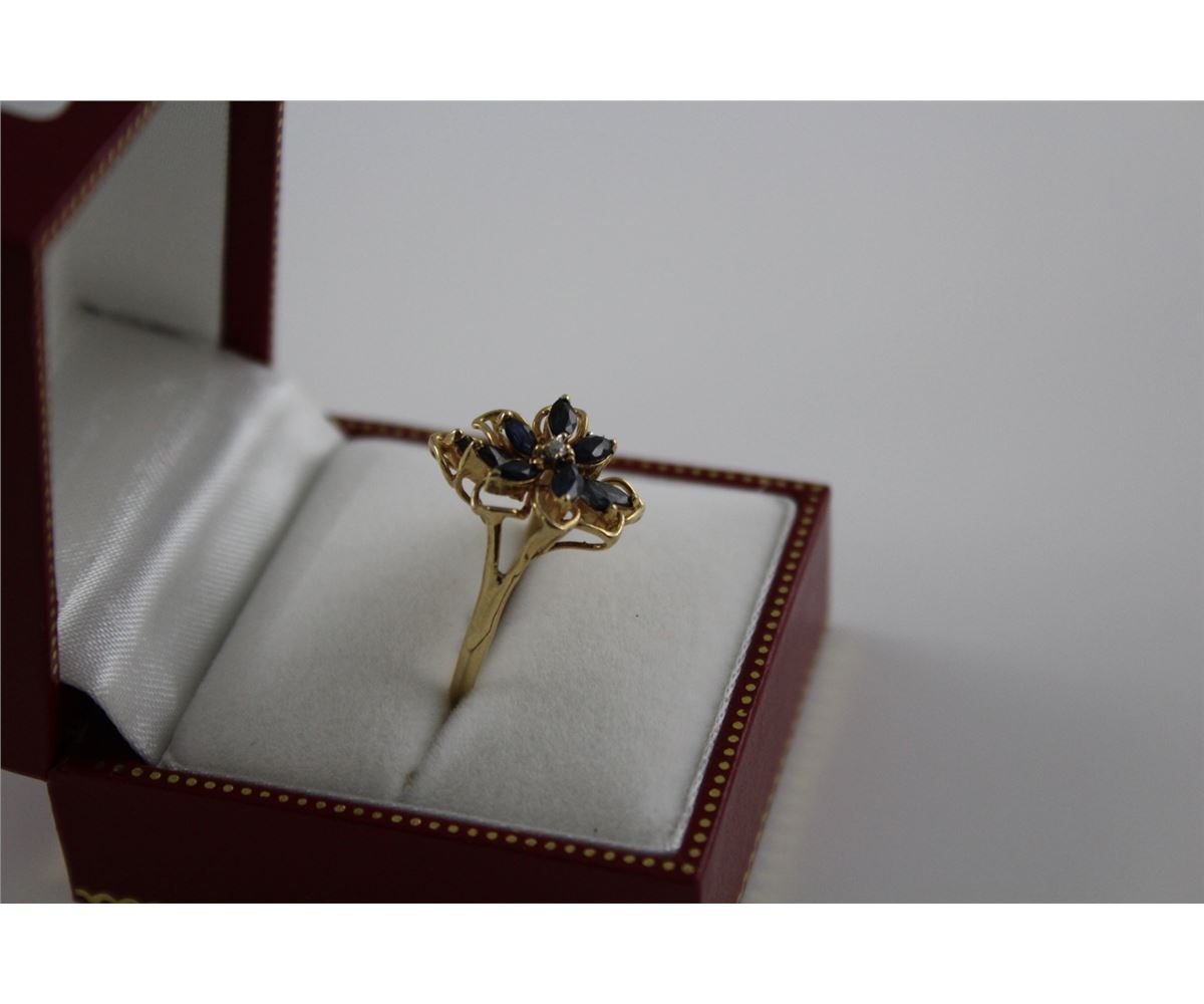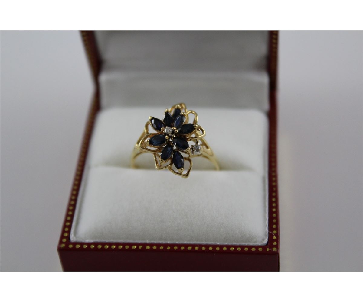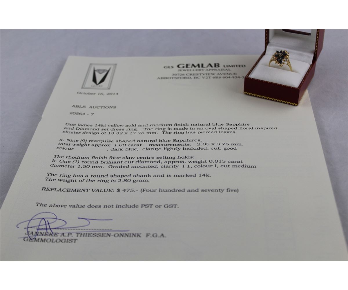 14KT YELLOW GOLD AND RHODIUM FINISH NATURAL BLUE SAPPHIRE SET WITH 9 MARQUISE SHAPED NATURAL BLUE SAPPHIRES APPROX. 1.00 CARATS AND 4 CLAW SET WITH 1 ROUND BRILLIANT CUT DIAMOND APPROX. 0.015 CARATS. REPLACEMENT VALUE:$475.00