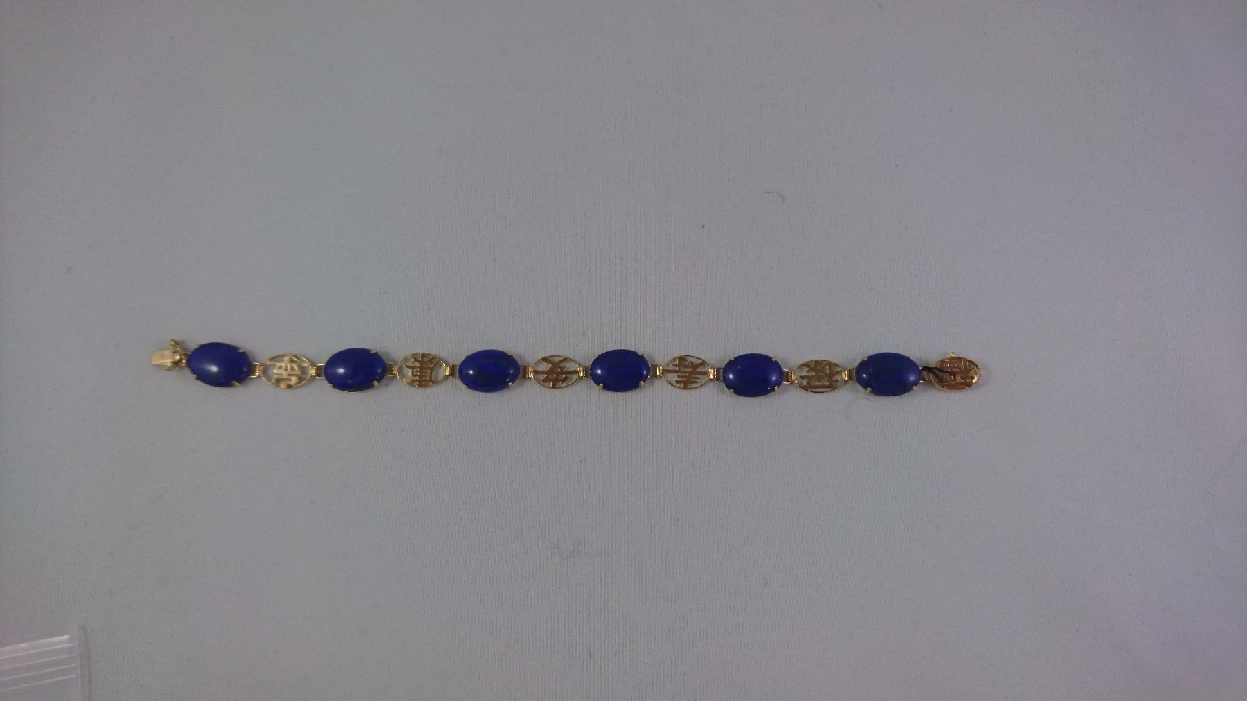 14KT YELLOW GOLD BRACELET 7.5" LIMBED SECTIONS BEARING CHINESE CHARACTERS + 6 OVAL REPLACEMENT VALUE $450