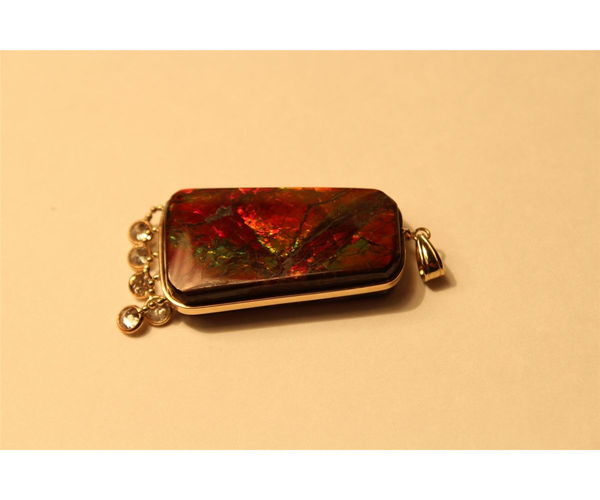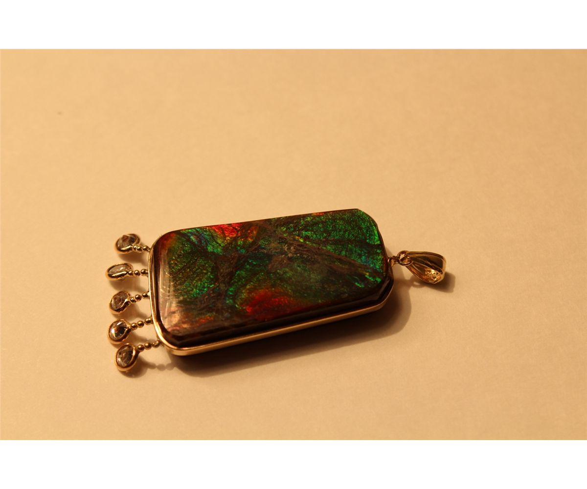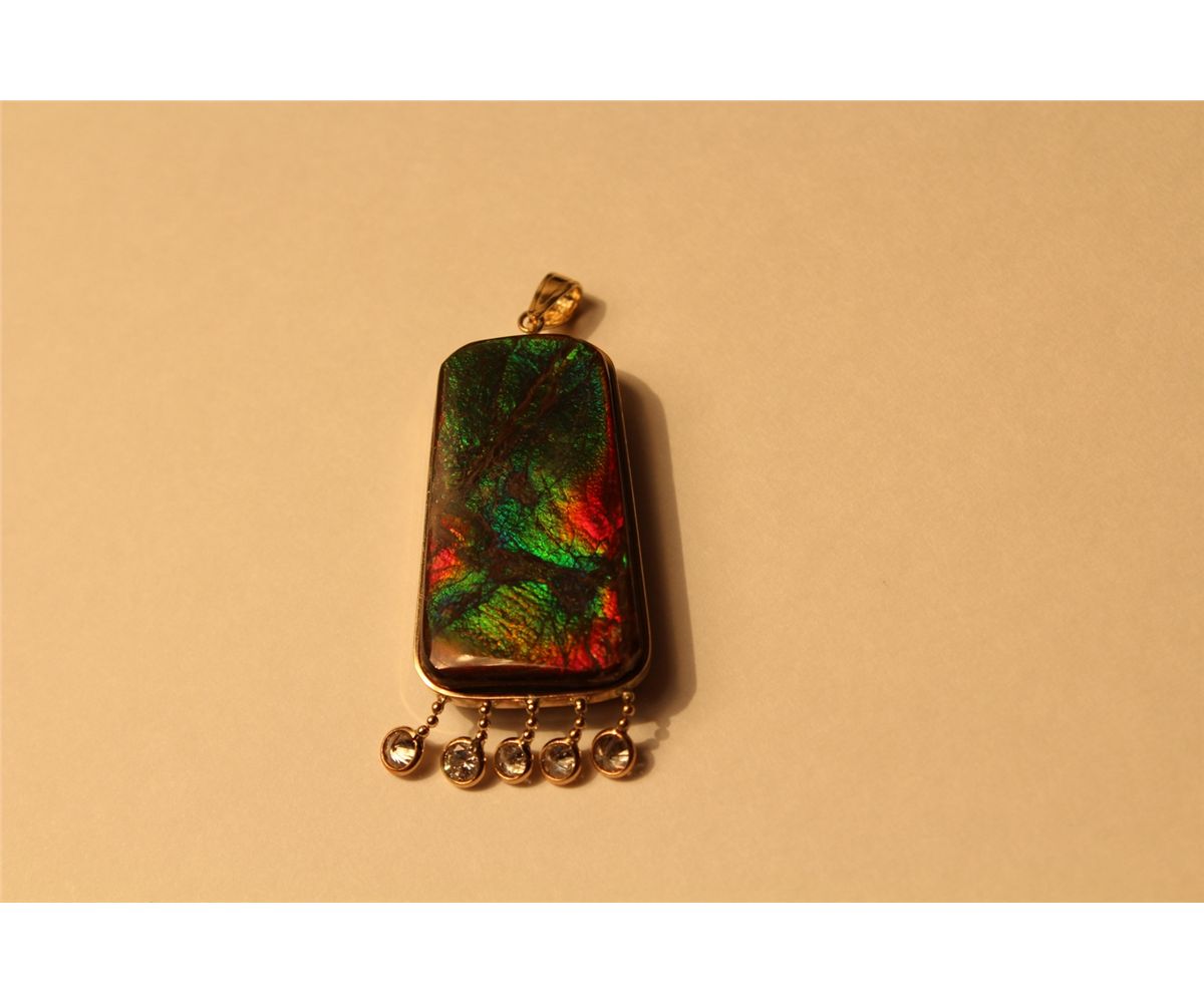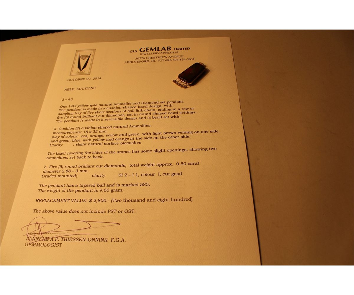 14KT YELLOW GOLD NATURAL AMMOLITE AND DIAMOND SET PENDANT SET WITH 2 CUSHION SHAPED AMMOLITES AND BEZEL SET WITH 5 ROUND BRILLIANT CUT DIAMONDS APPROX. 0.50 CARATS. REPLACEMENT VALUE: $2800.00