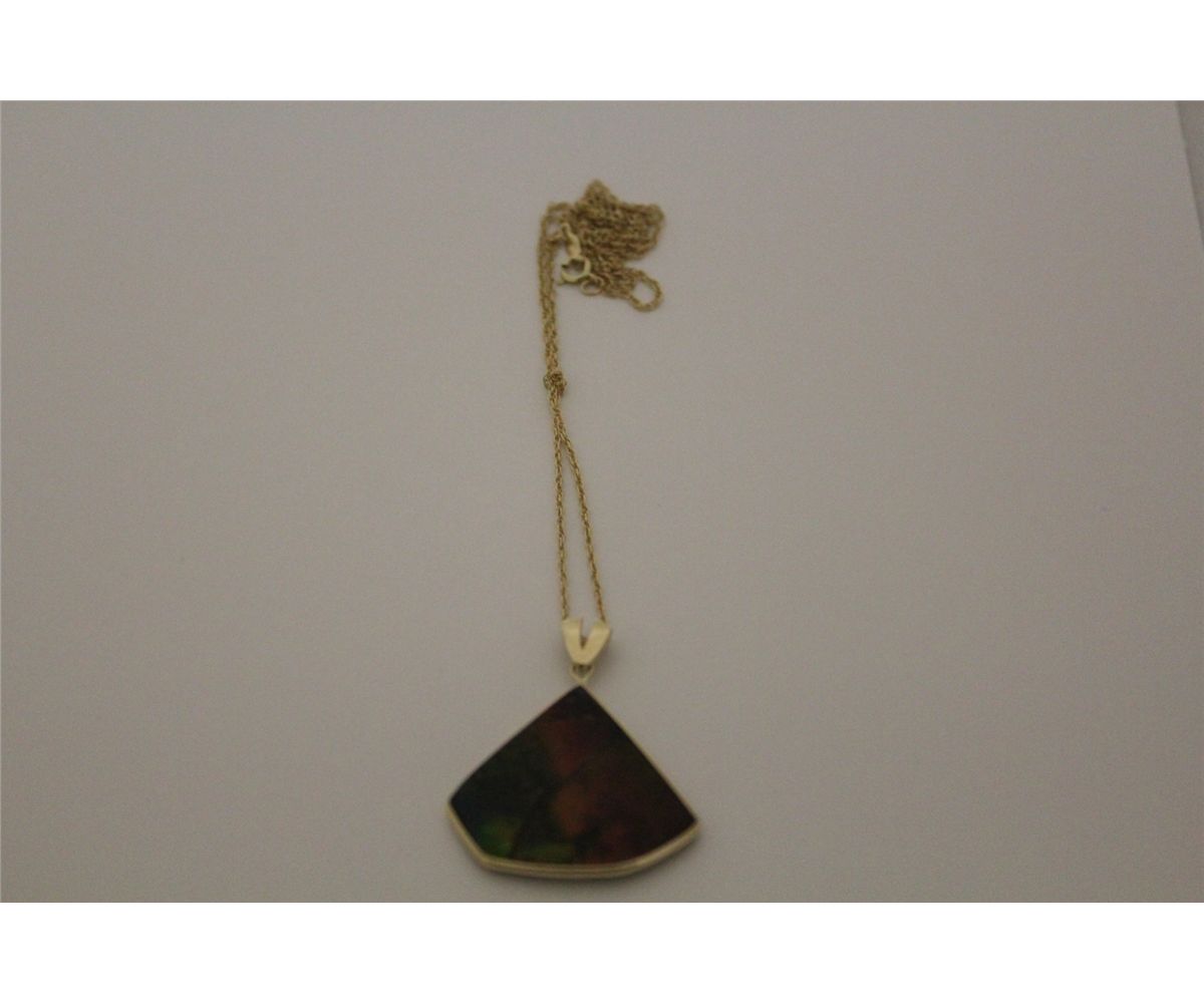 14KT. YELLOW GOLD NATURAL AMMOLITE PENDANT IN A BEZEL SET DESIGN WITH 1 ROUNDED TRIANGULAR FAN SHAPED NAURAL AMMOLITE. PLAY OF COLOUR: RED, ORANGE, GREEN, AND YELLOW. REPLACEMENT VALUE $650.00. 14KT. ROPE CHAIN REPLACEMENT VALUE $130.00