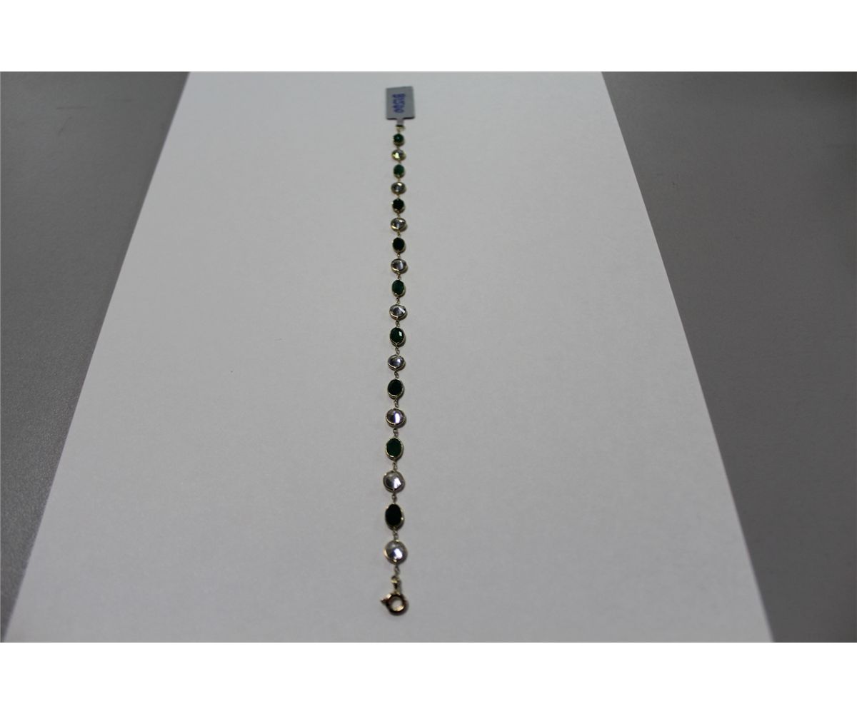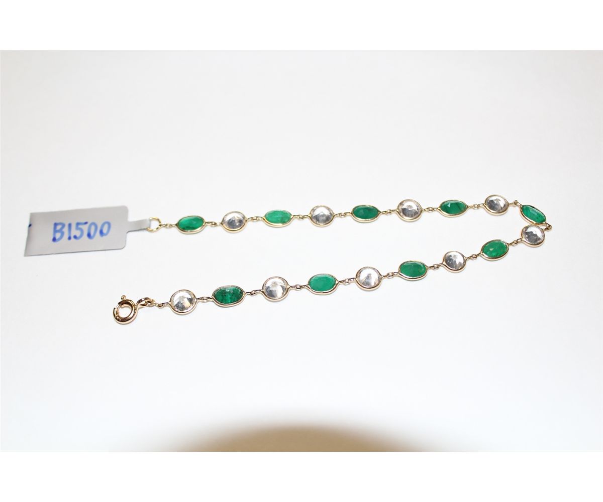 14KT. YELLOW GOLD NATURAL EMERALD, & NATURAL WHITE ZIRCON BRACELET SET WITH 9 ROUND CUT NATURAL WHITE ZIRCONS AND 9 OVAL MIXED CUT NATURAL EMERLADS APPROX. 3.50 CARATS REPLACEMENT VALUE:$1250.00