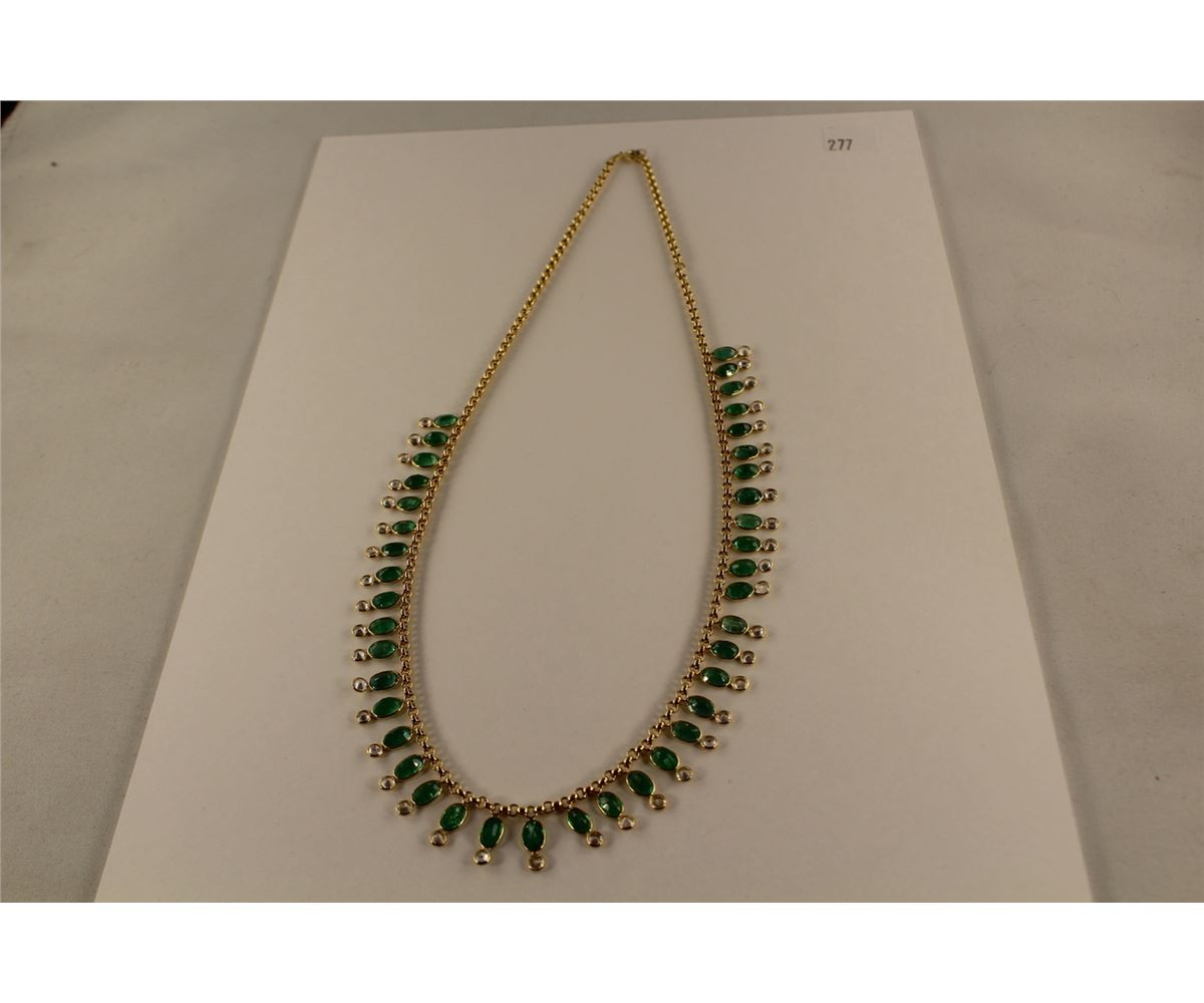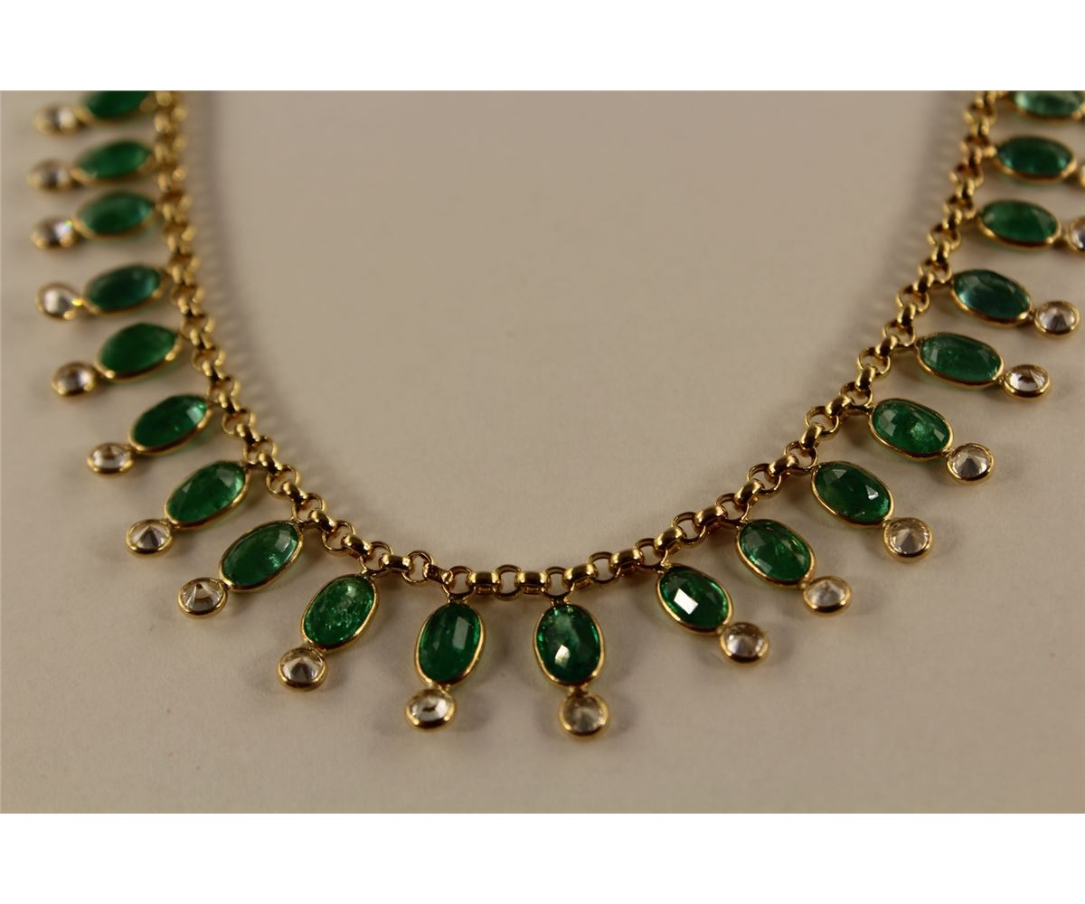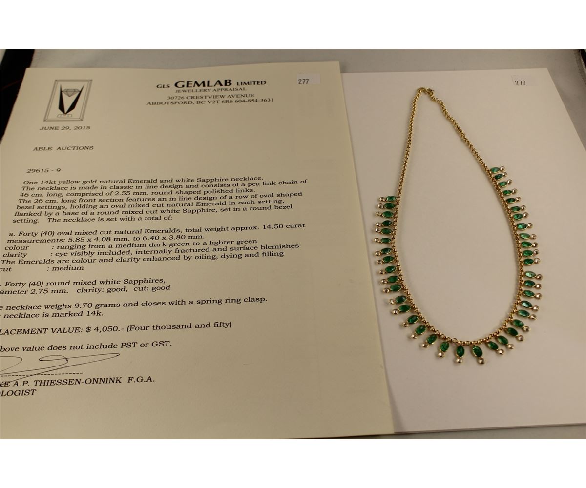 14KT YELLOW GOLD NATURAL EMERALD & WHITE SAPPHIRE NECKLACE SET WITH 40 OVAL MIXED CUT NATURAL EMERALDS APPROX. 14.50 CARATS & 40 ROUND MIXED WHITE SAPPHIRES. ATTACHED IS A PEA LINK CHAIN 46 CM LONG. REPLACEMENT VALUE:$4050.00