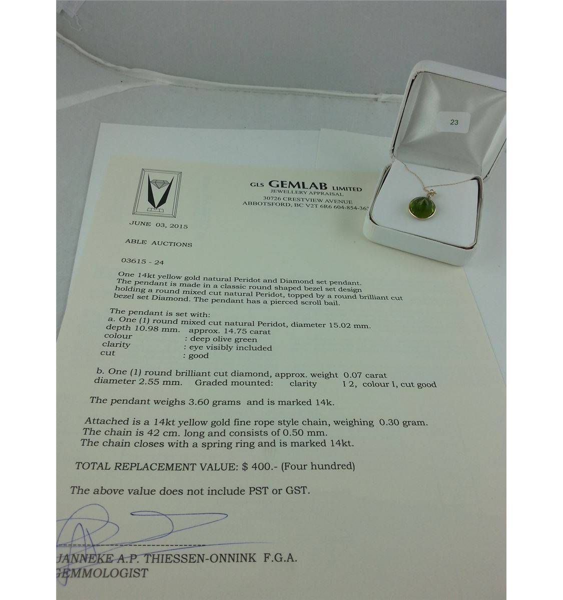 14KT YELLOW GOLD NATURAL PERIDOT AND DIAMOND SET PENDANT WITH ONE PERIDOT, APPROX 14.75CARAT AND ONE DIAMOND, APPROX 0.07CARAT REPLACEMENT VALUE $400
