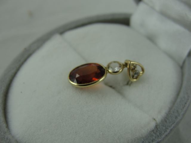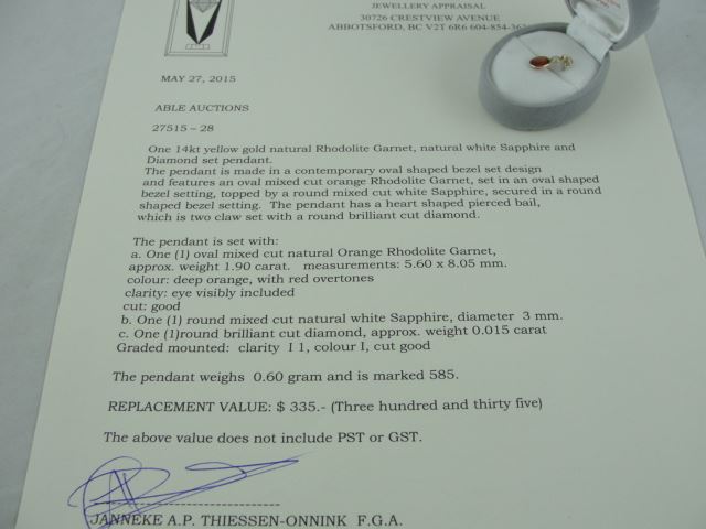 14KT YELLOW GOLD NATURAL RHODOLITE GARNET, WHITE SAPHIRE AND DIAMOND SET PENDANT WITH ONE ORANGE RHODOLITE GARNET, APPROX 1.90CARAT, ONE SAPPHIRE AND ONE DIAMOND, APPROX 0.015CARAT REPLACEMENT VALUE $335